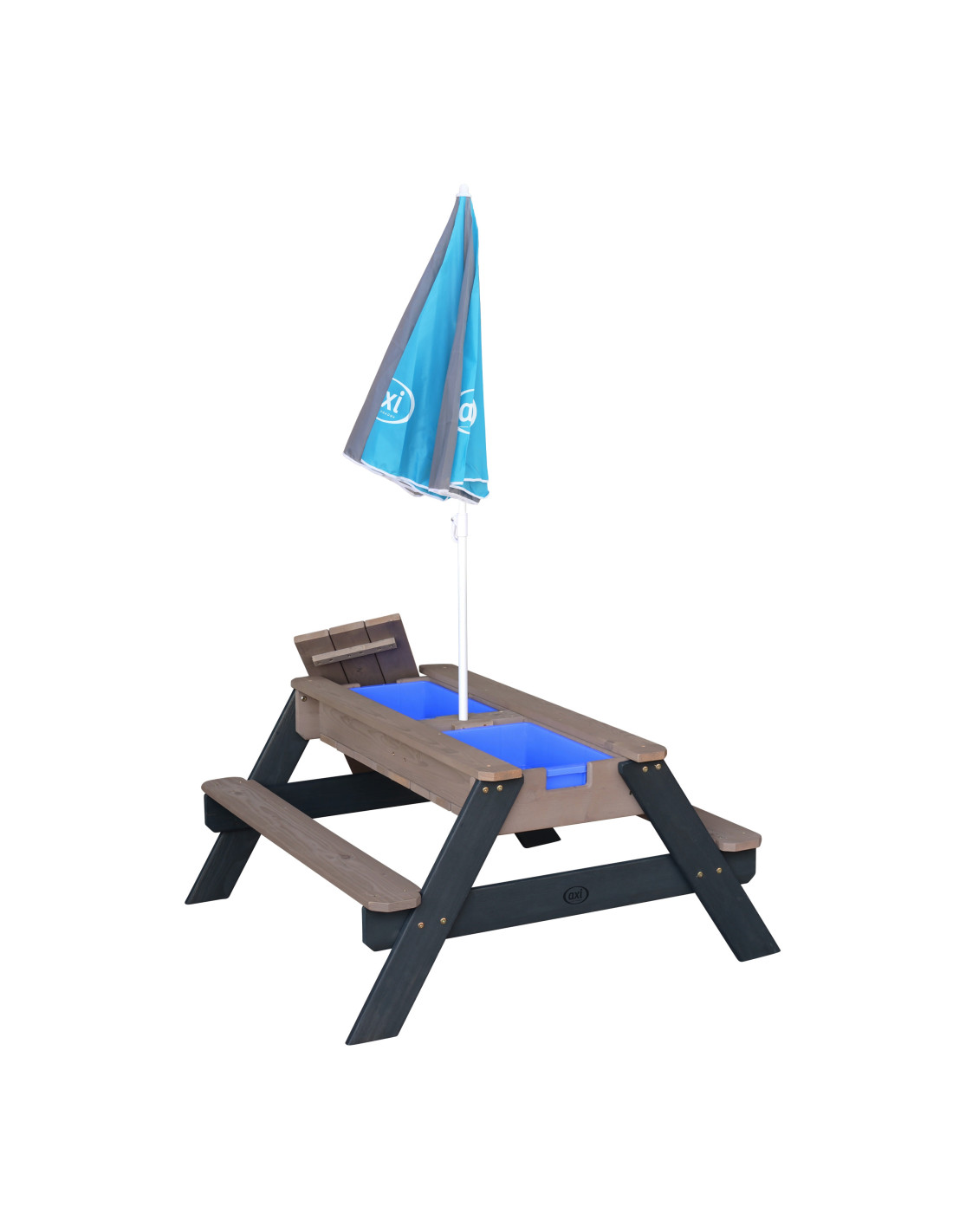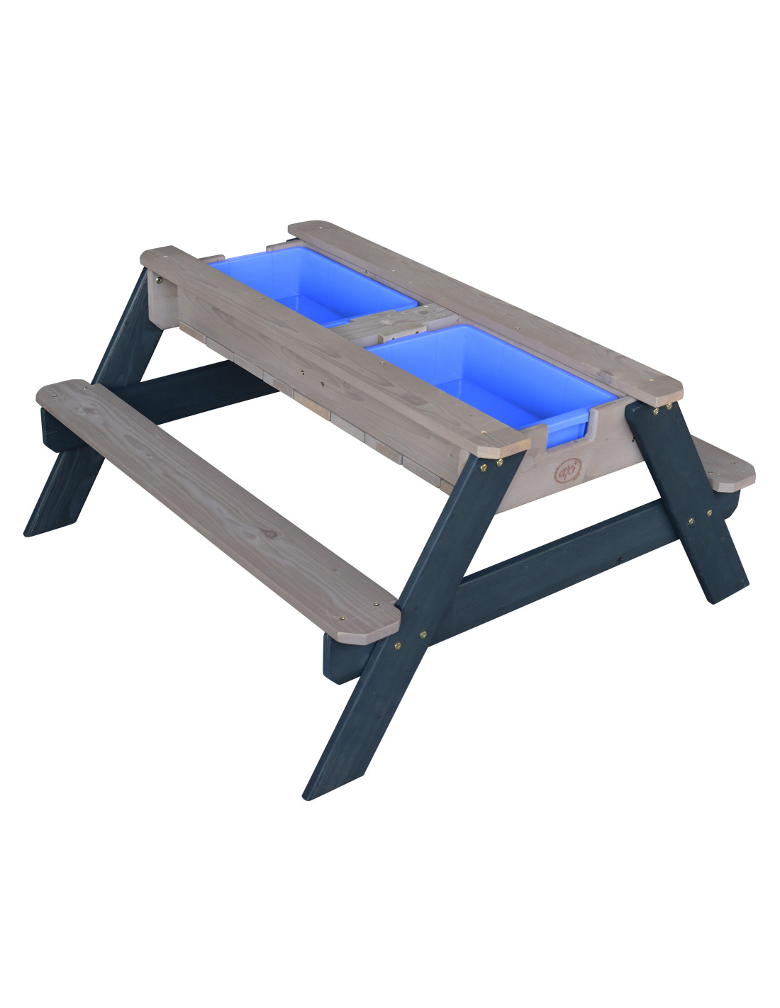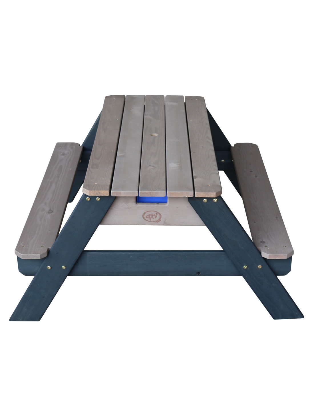 Stolik piknikowy Nick dla dzieci firmy Axi sprawi Twoim pociechom wielką radość. Dzieci mają miejsce, żeby wygodnie usiąść, bawić się i malować. Maluchy będą miały wygodny kącik tylko dla siebie. A jeśli znudzi im się spokojne siedzenie, po zdjęciu blatu stolika, zestaw przeistacza się w piaskownicę lub stolik wodny. Mamy dwie komory, które przystosowane są zarówno do piasku, jak i do wody. Dzięki temu z jednej strony dzieci mogą budować zamki z piasku, a z drugiej mogą bawić się zabawkowymi łodziami. Stolik świetnie sprawdzi się w ogrodzie, na tarasie oraz balkonie.