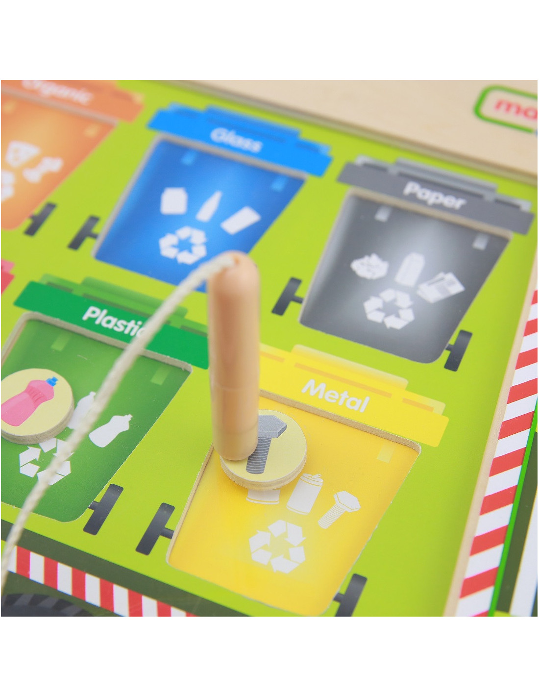 Zabawka sensoryczna edukacyjna dla dzieci. Drewniana tabliczka marki Masterkidz z nauką segregacji odpadów. Za pomocą magnetycznej pałeczki, dziecko ma za zadanie umieszczenie kółeczek ze śmieciami w odpowiednich kontenerach.