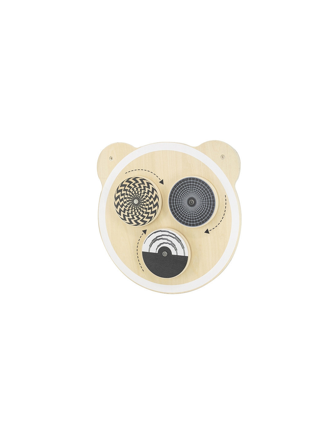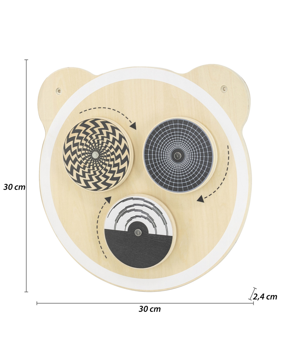 Jedna z serii drewnianych tablic z uroczą głową misia. Tablica z trzema kółkami, które zostały odpowiednio pomalowane, aby poprzez kręcenie wywoływać złudzenia optyczne. Zabawka pomaga w rozwijaniu logicznego myślenia u dzieci, pomaga również w rozwijaniu wyobraźni. Produkt idealnie sprawdzi się zarówno w domowym zaciszu, jak i w placówkach oświatowych, wczesnoszkolnych. Ciekawe przygotowanie formy tablicy z pewnością przykuje uwagę każdego malucha. Całość wykonana została z drewna lakierowanego i pomalowana nietoksycznymi farbami w żywe barwy, które zadowolą każdego użytkownika i dadzą mnóstwo radości z zabawy. Produkt przeznaczony dla dzieci od 18 miesiąca życia. W naszej ofercie dostępna jest cała seria tablic z głową misia.