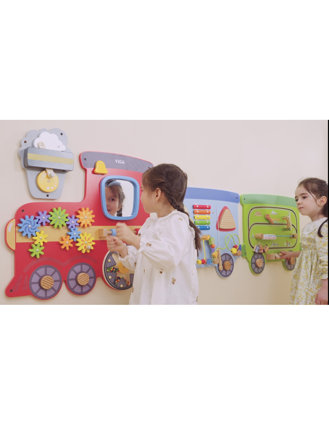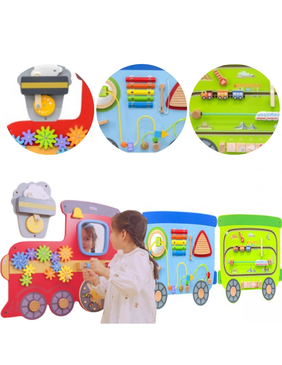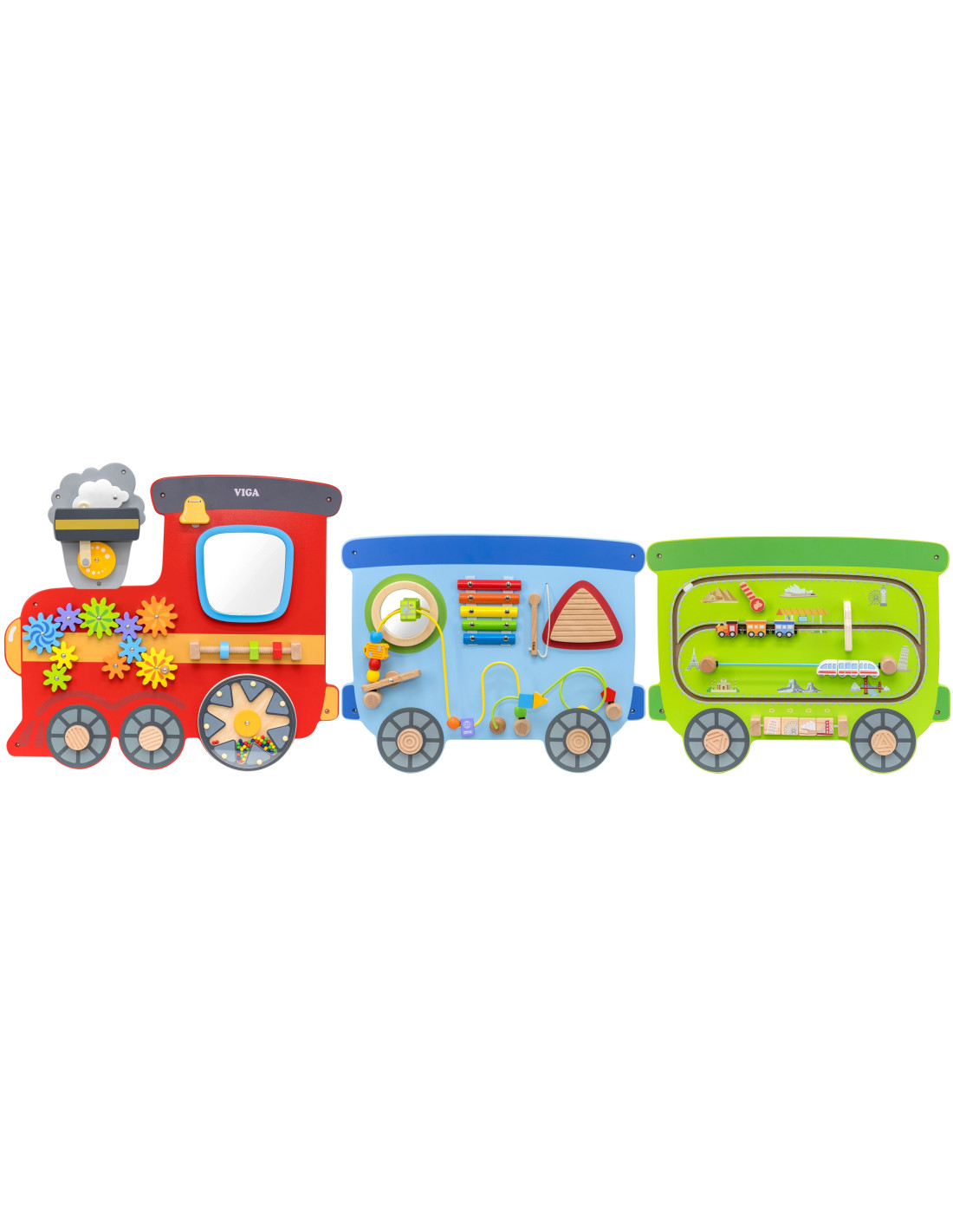 Kolorowy zabawkowy pociąg marki Viga Toys to drewniana, wielofunkcyjna zabawka na ścianę, która dostarczy dzieciom wiele godzin świetnej zabawy i nauki. Zabawka składa się z trzech odrębnych sekcji: czerwona lokomotywa z kołami zębatymi, młyńskim kołem i lustrem; niebieski wagon z cymbałkami, pętlą motoryczną i wyrzutnią koralików; oraz zielony wagon z interaktywną przesuwną kolejką i klockami do obracania przedstawiającymi sławne miejsca. Każda sekcja oferuje różnorodne atrakcje, które stymulują zmysły i umiejętności maluchów, zapewniając im jednocześnie mnóstwo radości.