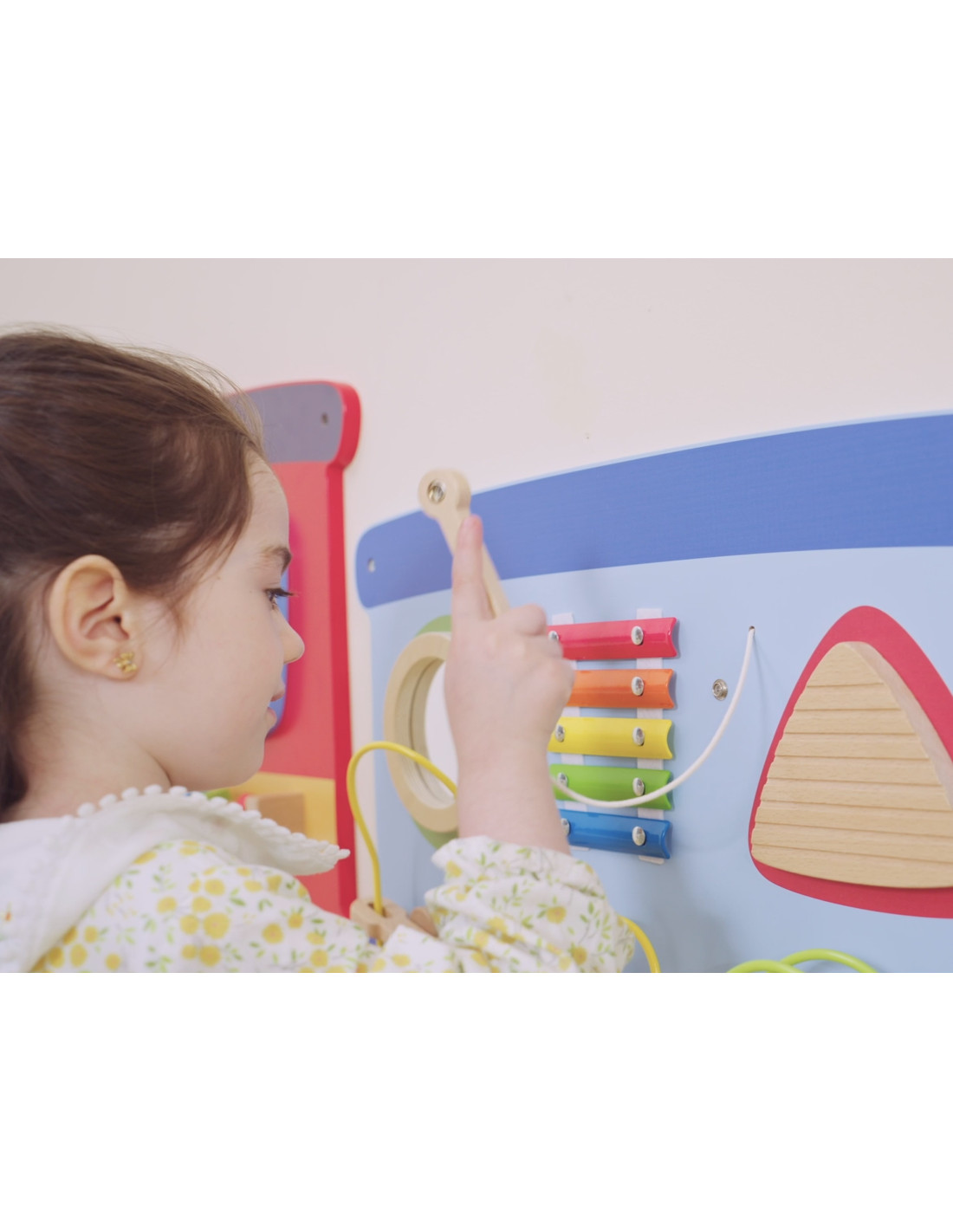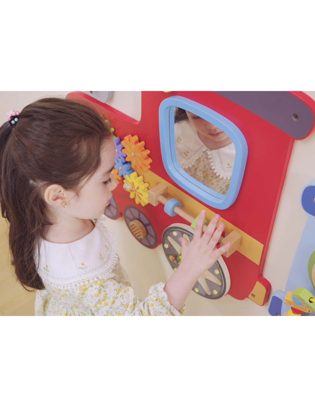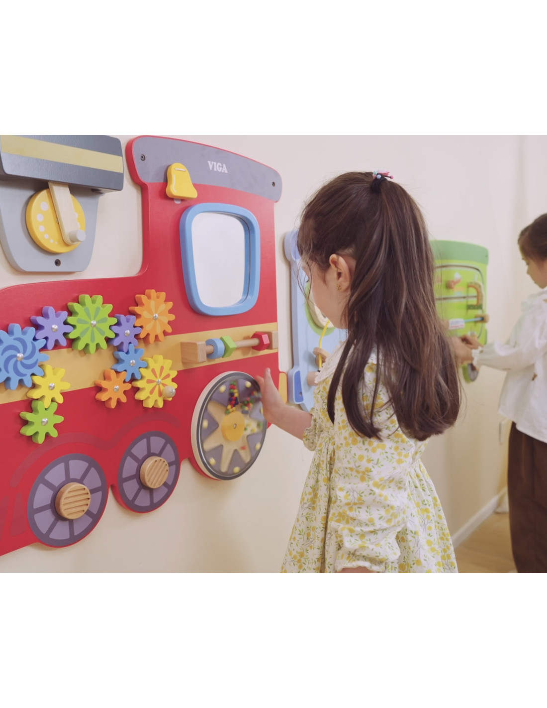Kolorowy zabawkowy pociąg marki Viga Toys to drewniana, wielofunkcyjna zabawka na ścianę, która dostarczy dzieciom wiele godzin świetnej zabawy i nauki. Zabawka składa się z trzech odrębnych sekcji: czerwona lokomotywa z kołami zębatymi, młyńskim kołem i lustrem; niebieski wagon z cymbałkami, pętlą motoryczną i wyrzutnią koralików; oraz zielony wagon z interaktywną przesuwną kolejką i klockami do obracania przedstawiającymi sławne miejsca. Każda sekcja oferuje różnorodne atrakcje, które stymulują zmysły i umiejętności maluchów, zapewniając im jednocześnie mnóstwo radości.