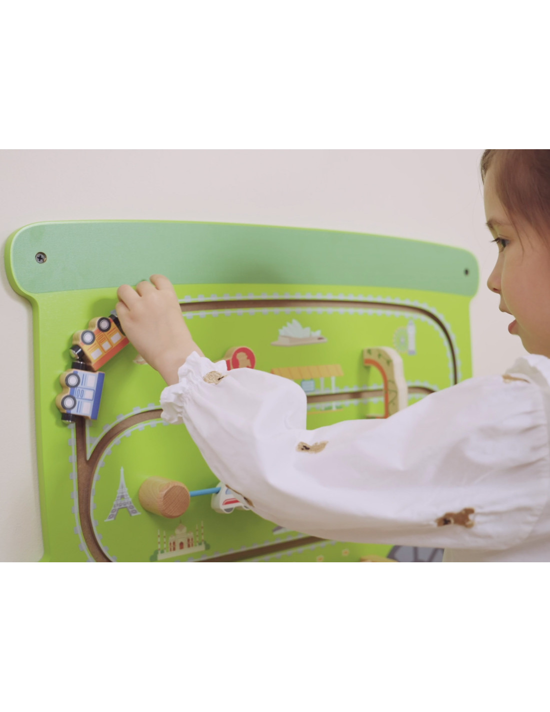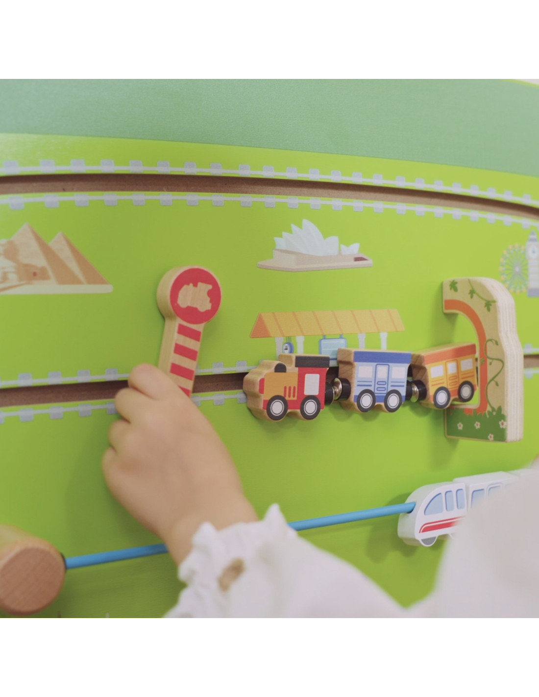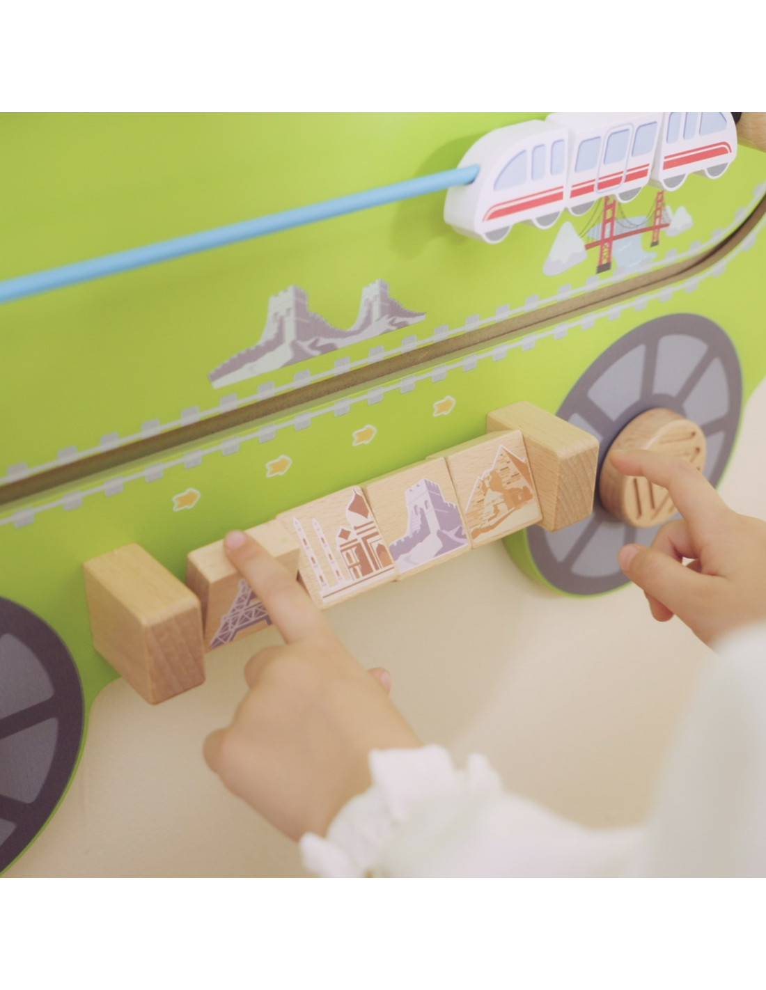 - - Zielony wagon z interaktywną przesuwną kolejką i klockami do obracania przedstawiającymi sławne miejsca.