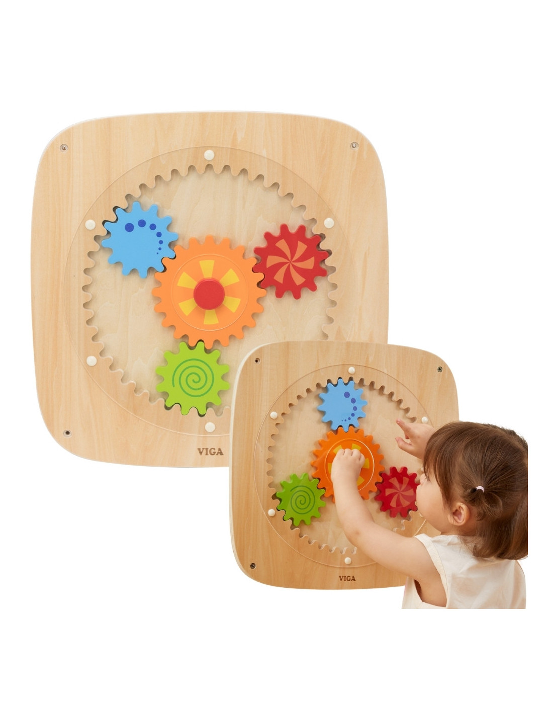 Poznaj wspaniałą zabawkę edukacyjną, która rozwija zdolności manualne i logiczne myślenie Twojego dziecka! Ta tablica ścienna z kolorowymi kołami zębatymi VIGA to nie tylko świetna zabawa, ale także narzędzie do nauki. Dziecko może obracać pokrętłem, aby wprawić w ruch wszystkie kółka. Ząbkujące się koła zębate sprawiają, że obracają się wszystkie jednocześnie, co pozwala na zrozumienie pojęcia „siły i ruchu”.Kółka mają różne wzory, dzięki czemu podczas obracania tworzą efekty wizualne. Zabawka jest w całości wykonana z drewna, co zapewnia jej trwałość i bezpieczeństwo. Doskonale sprawdzi się jako element większej ściany aktywności w pokoju dziecka, przedszkolu, czy żłobku. To idealna propozycja dla każdego malucha, który jest ciekawy świata!
