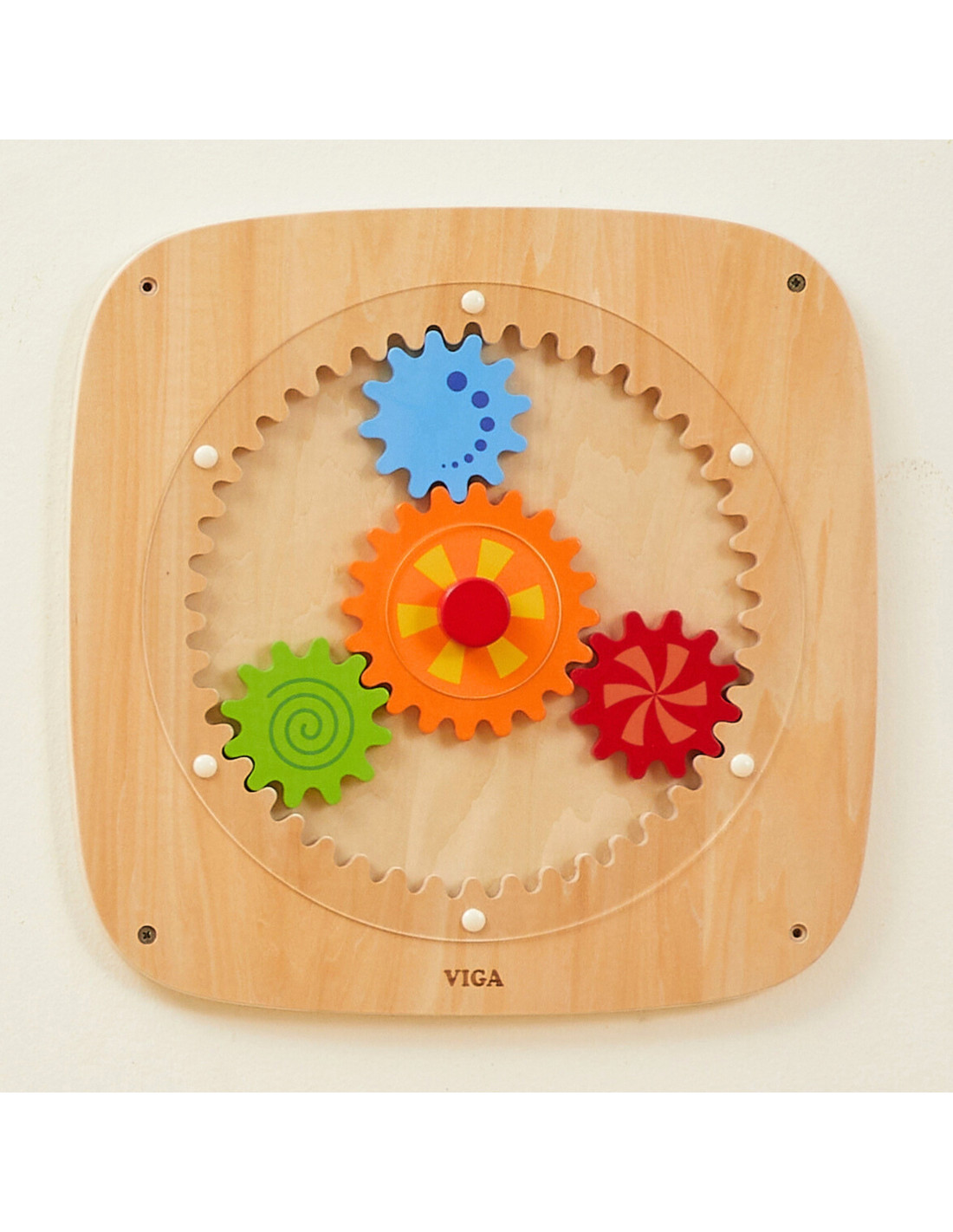 - - Drewniana tablica ścienna z kolorowymi kołami zębatymi.