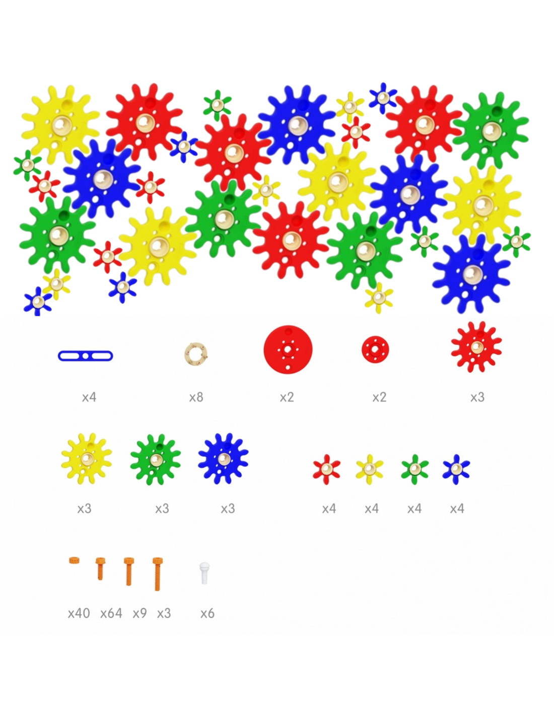 Zestaw kolorowych trybików i kół zębatych, które pozwalają na skonstruowanie skomplikowanych mechanizmów. Zabawkę montuje się na Tablicy Naukowo-Kreatywnej Masterkidz STEM przy pomocy specjalnych śrub Masterkidz. Zabawa kołami zębatymi poprawia motorykę dziecka, zdolność logicznego myślenia, a także kreatywność.