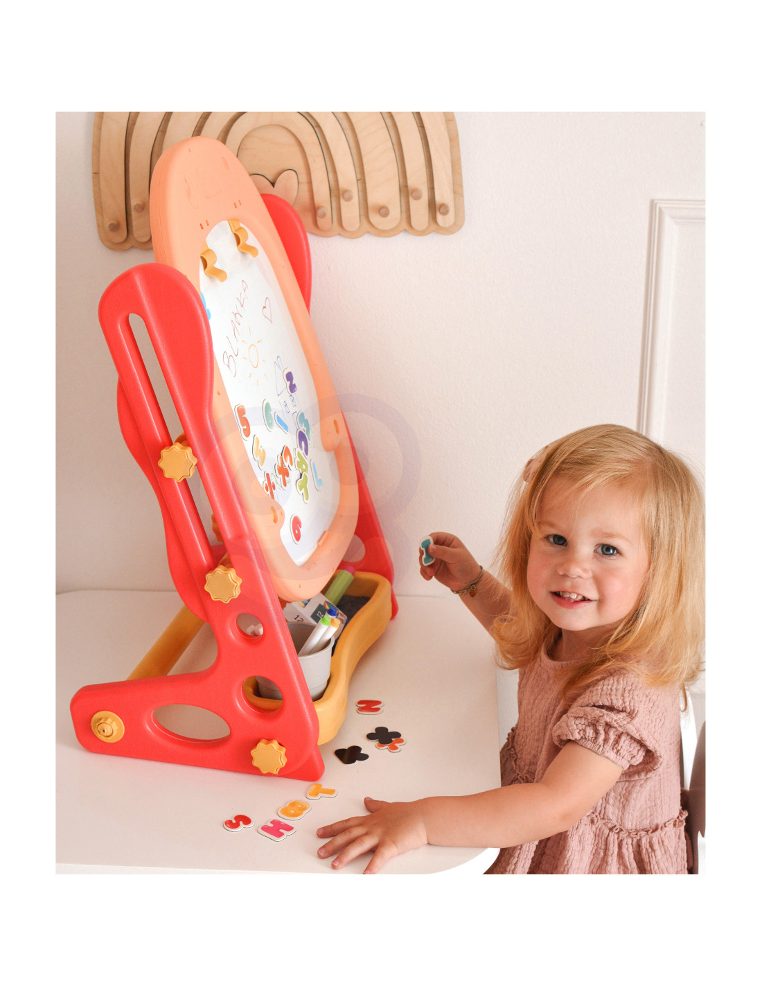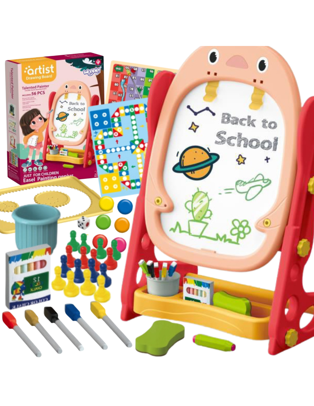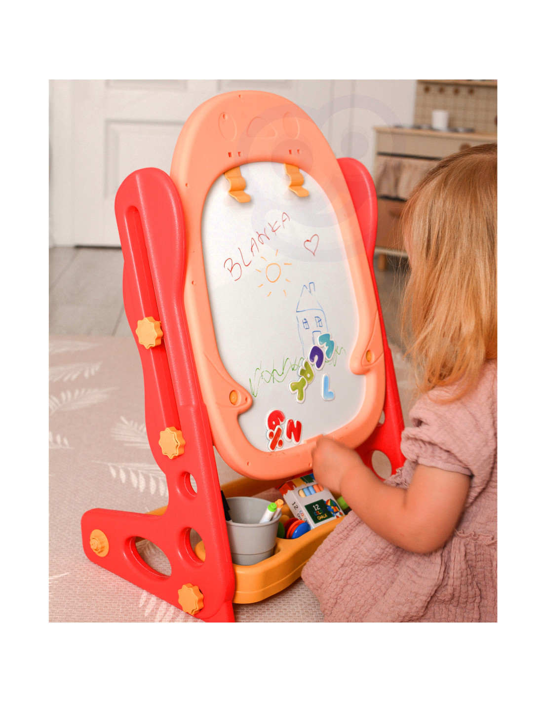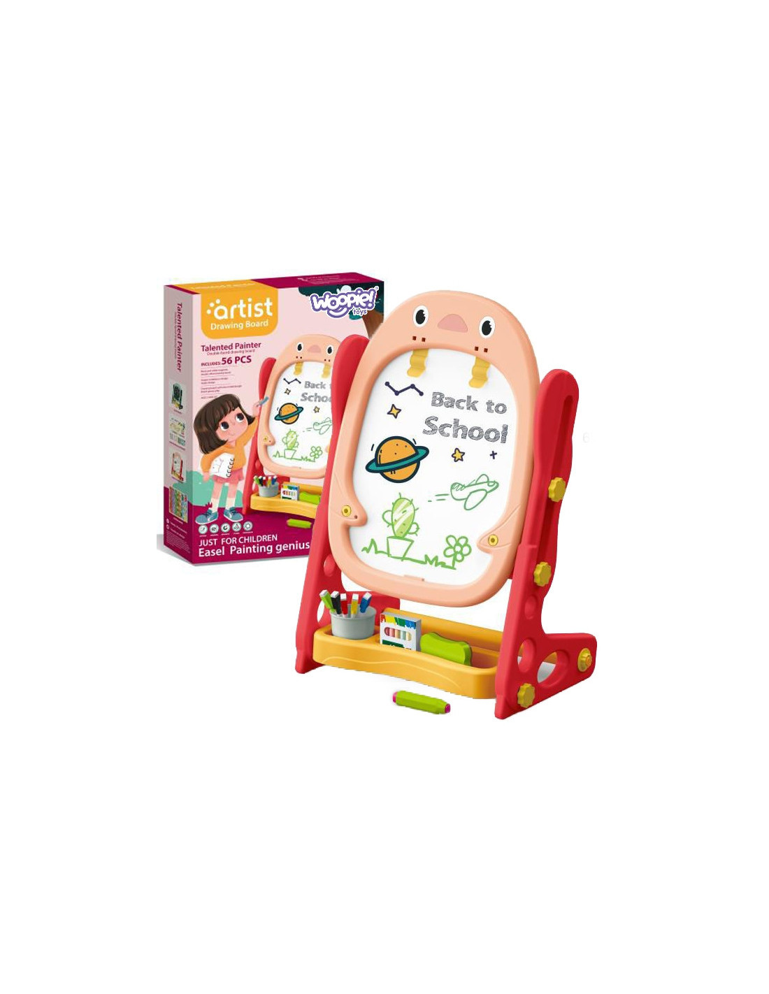 Dwustronna Tablica Magnetyczna do Rysowania od marki WOOPIE to wszechstronne narzędzie do nauki i pogłębiania zdolności artystycznych. Zestaw zawiera pełen pakiet akcesoriów do wszechstronnego użytkowania. Tablica jest prosta w montażu i dodatkowo posiada regulacje wysokości, dzięki czemu można ja dopasować do każdego dziecka. Zabawka jest niezbędna do codziennego rozwoju dziecka.