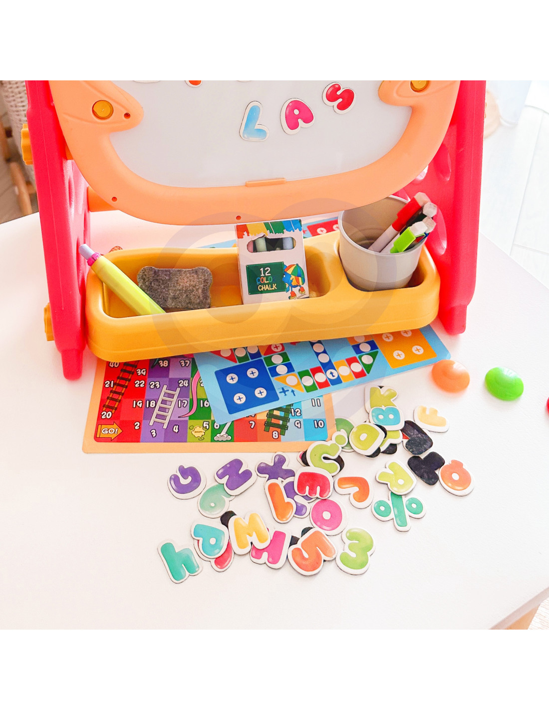 - - Dwustronną tablice - jedna strona do pisania markerem, a druga kredą (obie strony działają na magnes)