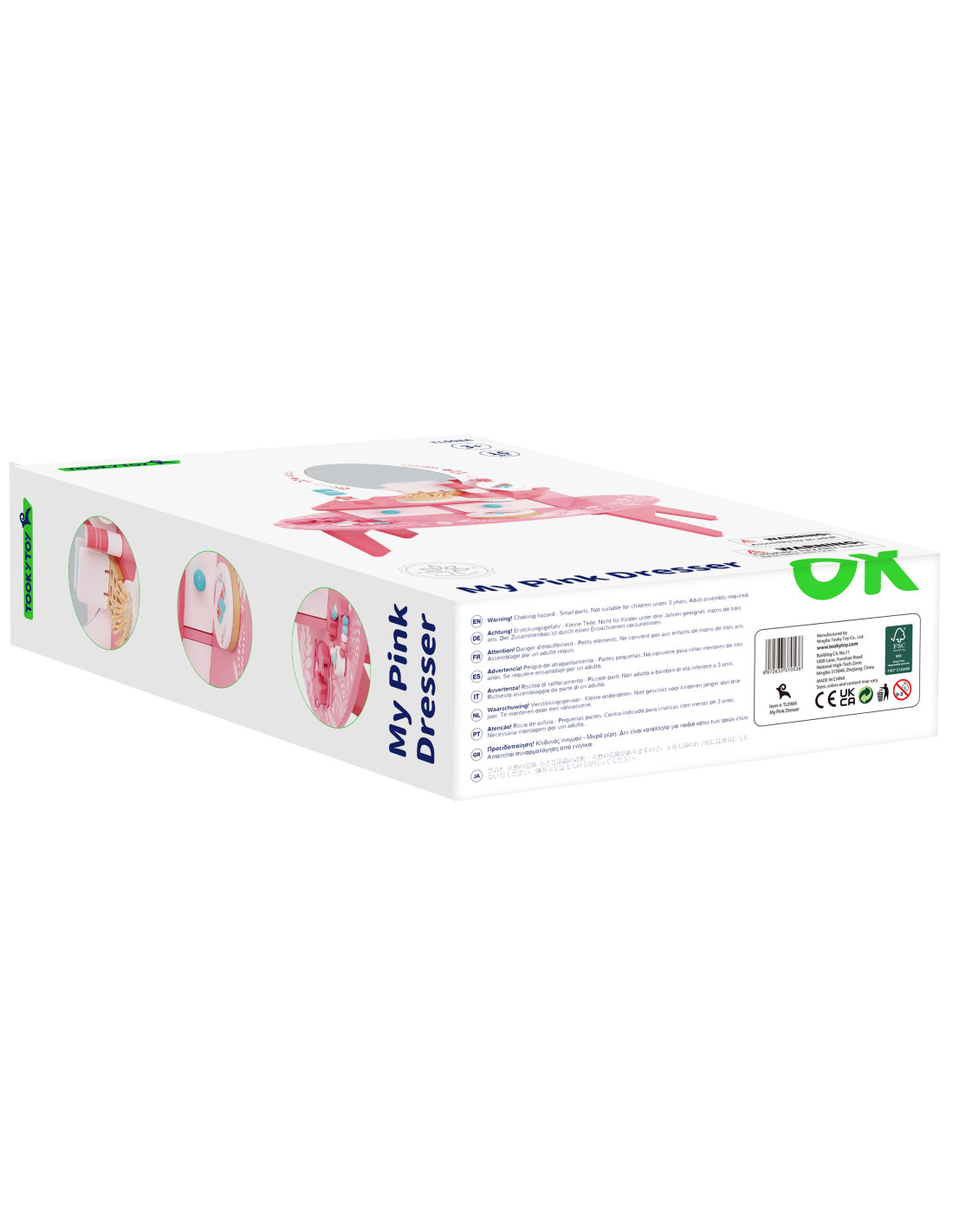 Piękna różowa toaletka od Tooky Toy to wymarzony mebel w pokoju każdej dziewczynki. Toaletka posiada dwie wysuwane szuflady, w które mała księżniczka może schować swoje skarby. Do zestawu dołączone są jeszcze liczne akcesoria. Całość wykonana z drewna i pomalowana nietoksycznymi farbami bezpiecznymi dla dzieci i środowiska.