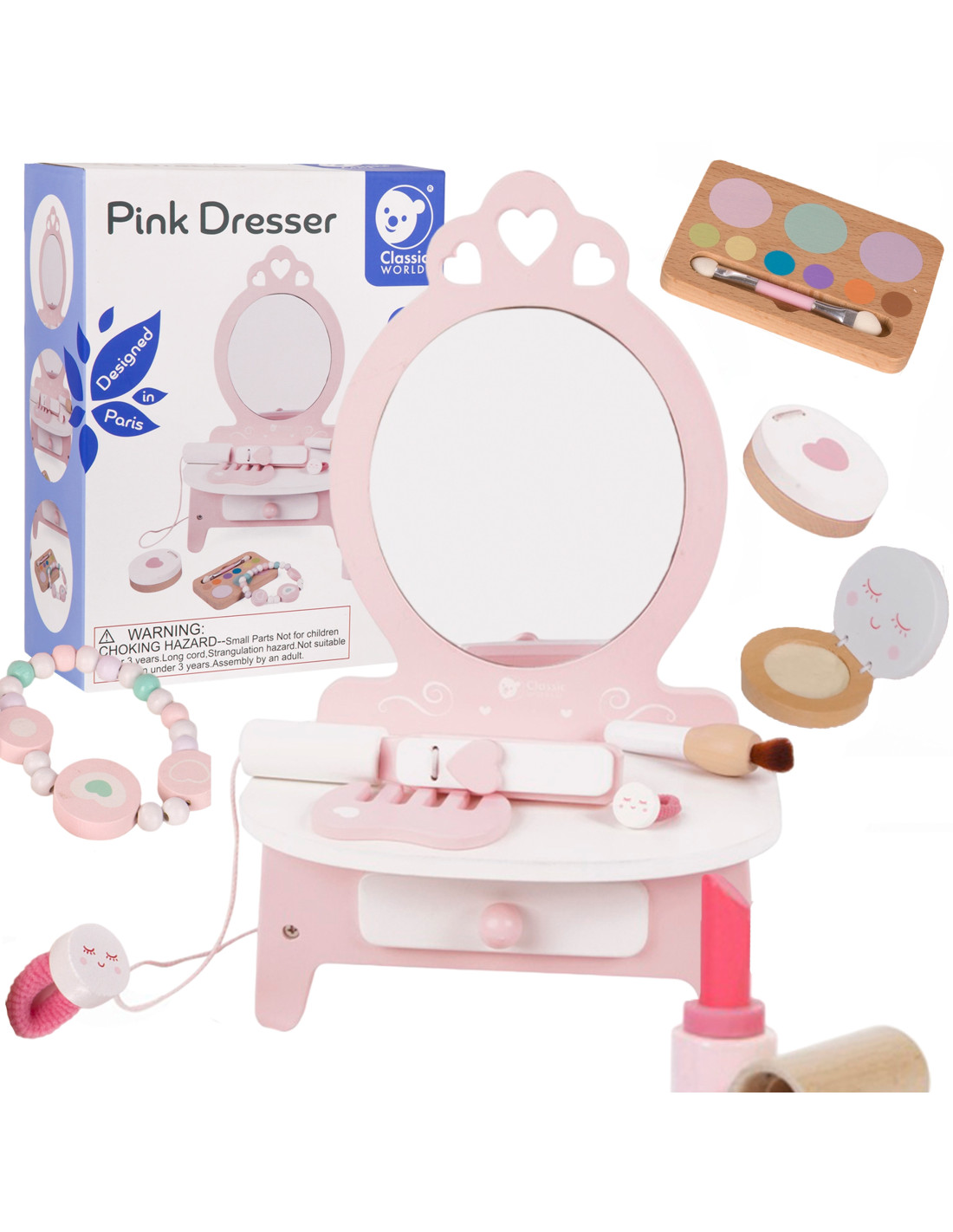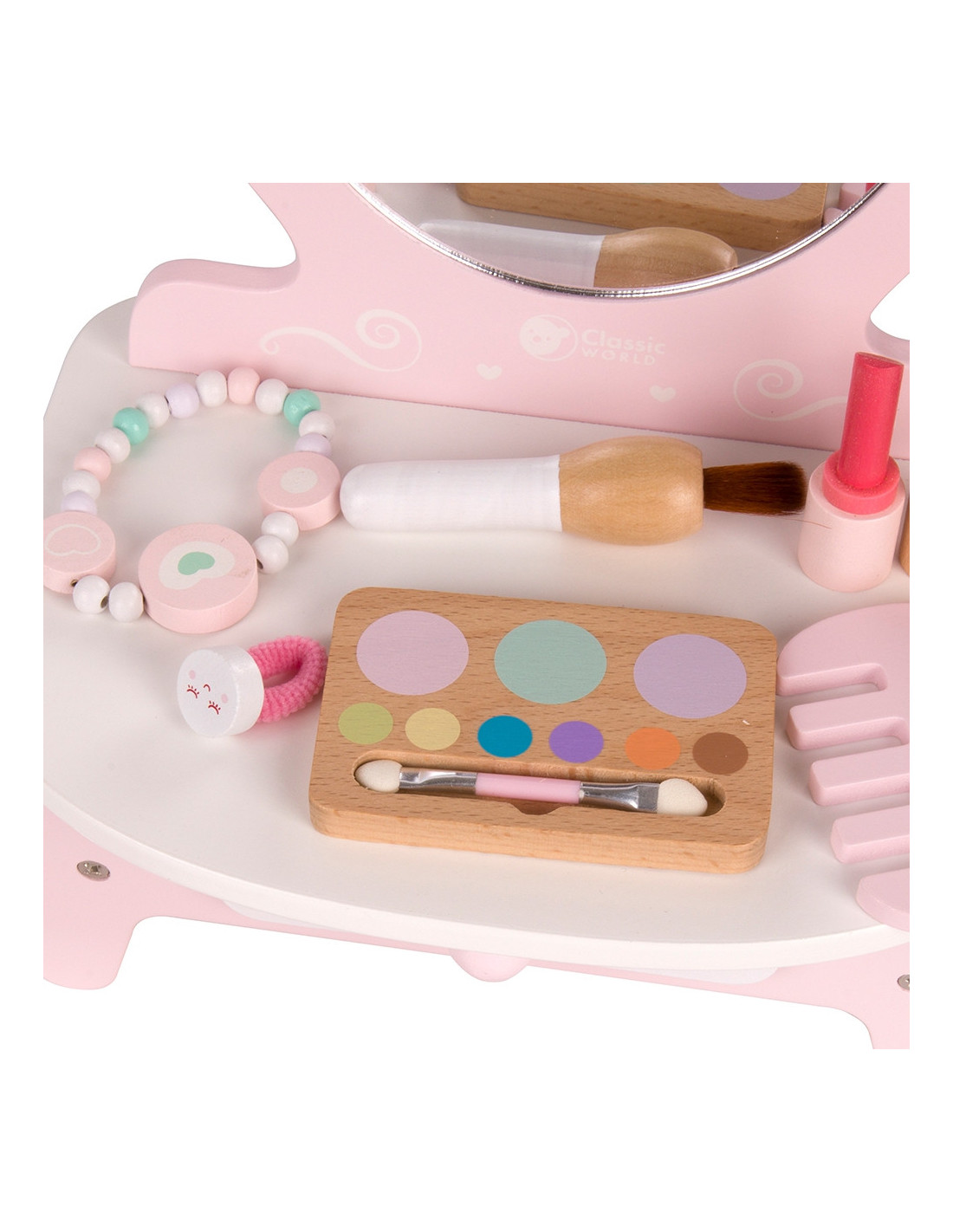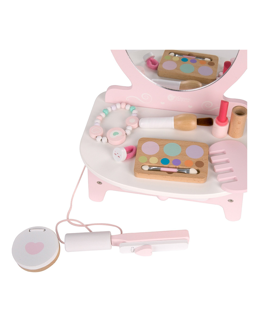 Śliczna funkcjonalna toaletka od Classic World to idealna propozycja na prezent dla dzieci od 3 lat. Rozbudowany zestaw do robienia makijażu oraz fryzur zadowoli każdą posiadaczkę. Zestaw posiada lustro w którym nasza pociecha może się stroić. Bardzo duży zestaw akcesoriów typu grzebień, szminka, prostownica , pędzel do makijażu czy puderniczka, pozwolą na zabawę oraz umożliwią szykowanie się razem z rodzicami. Blat toaletki jest bardzo funkcjonalny i pomieści wszystkie niezbędne akcesoria naszej modelki. Zabawka może służyć jako uzupełnienie Salonu Urody małych dziewczynek w pokojach.