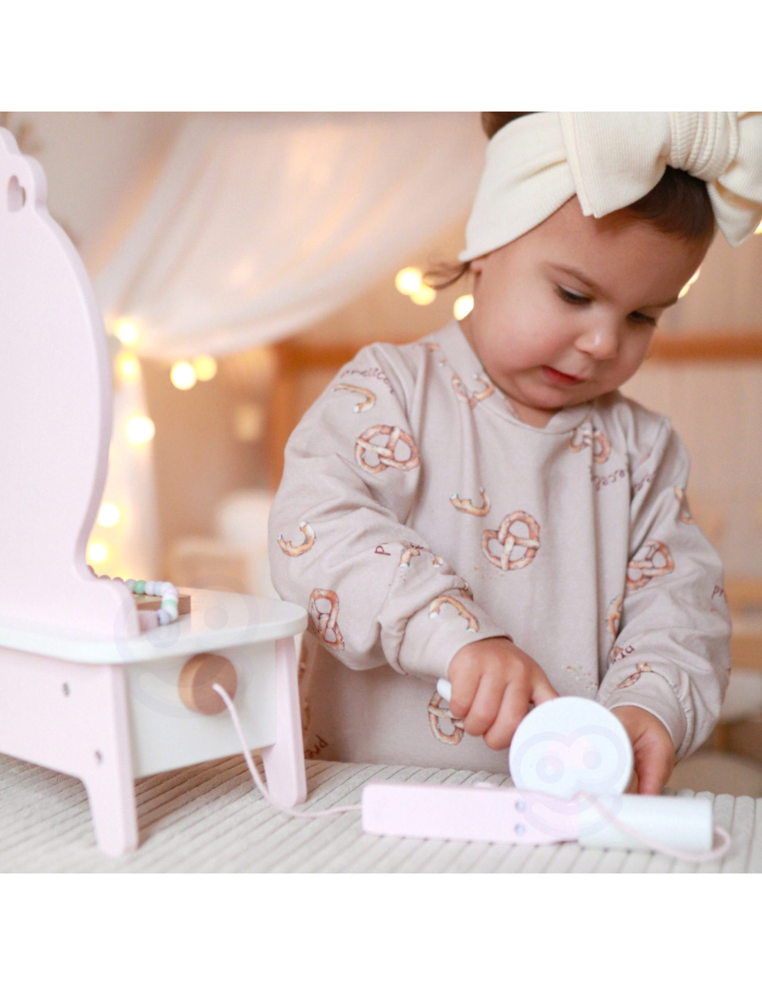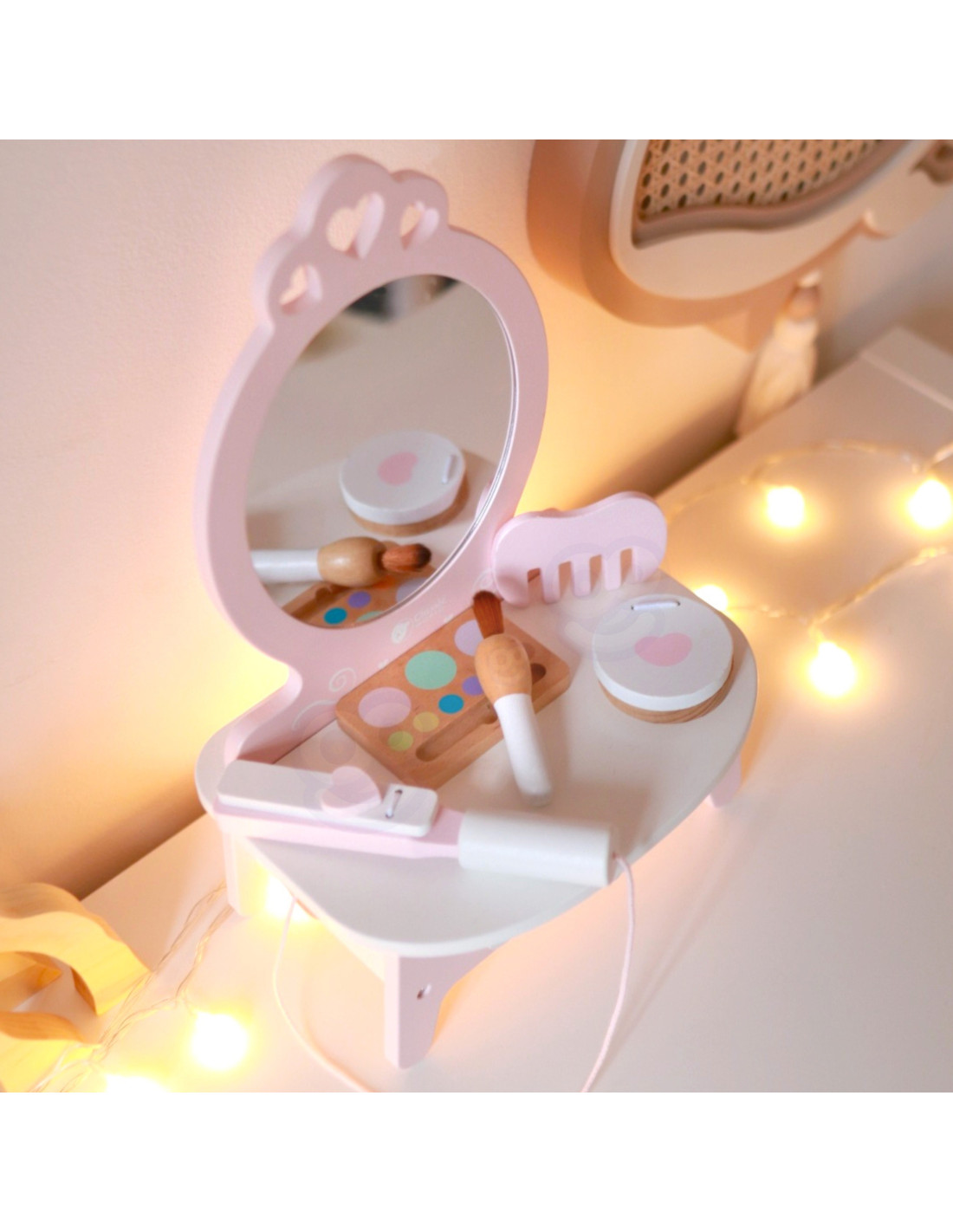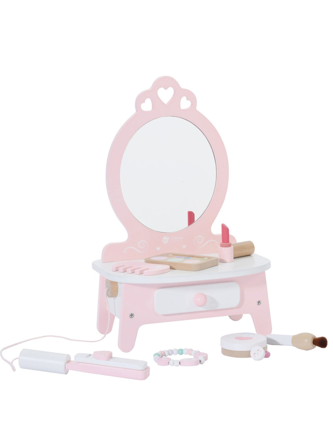 Śliczna funkcjonalna toaletka od Classic World to idealna propozycja na prezent dla dzieci od 3 lat. Rozbudowany zestaw do robienia makijażu oraz fryzur zadowoli każdą posiadaczkę. Zestaw posiada lustro w którym nasza pociecha może się stroić. Bardzo duży zestaw akcesoriów typu grzebień, szminka, prostownica , pędzel do makijażu czy puderniczka, pozwolą na zabawę oraz umożliwią szykowanie się razem z rodzicami. Blat toaletki jest bardzo funkcjonalny i pomieści wszystkie niezbędne akcesoria naszej modelki. Zabawka może służyć jako uzupełnienie Salonu Urody małych dziewczynek w pokojach.