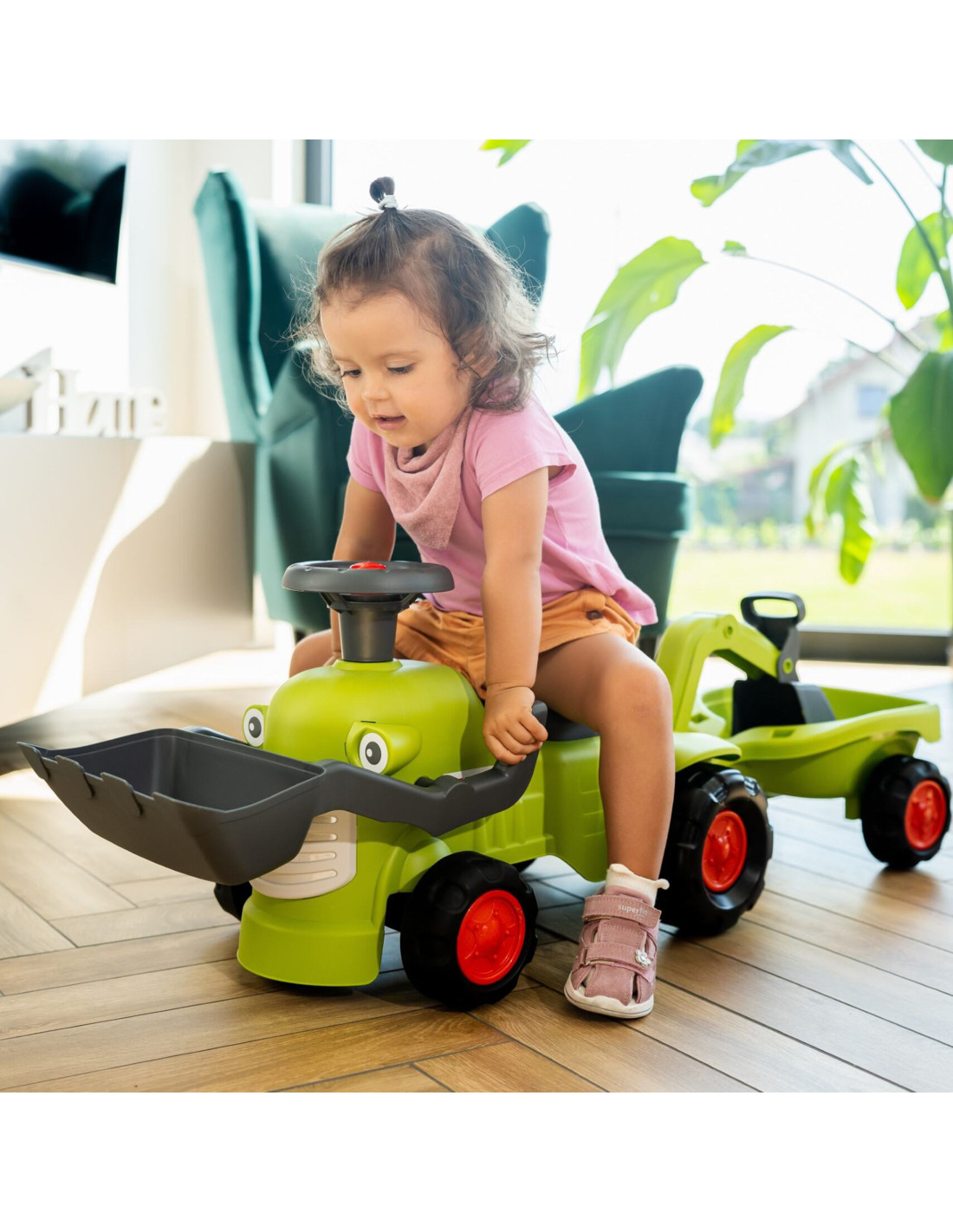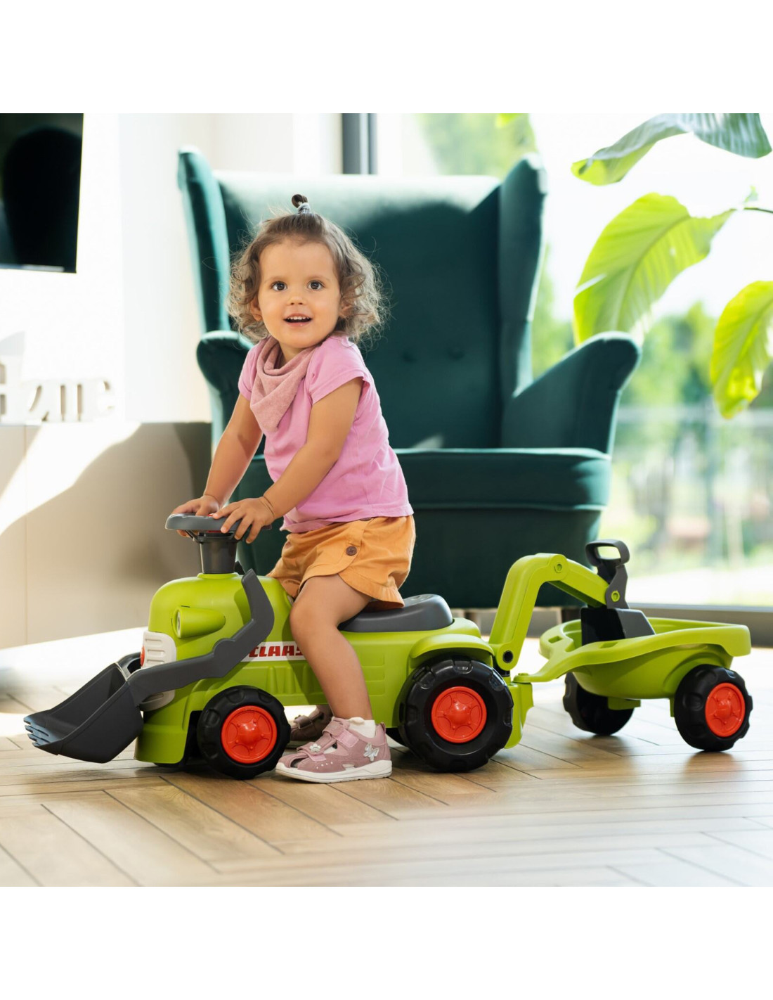 Traktorek Jeździk Class z przyczepką marki Falk to spełnienie marzeń niejednego małego traktorzysty. Starannie wykonany, z dbałością o najmniejszy szczegół. Żaden prawdziwy Farmer by takim nie pogardził. Traktorek CLAAS z łyżką, ładowarką i przyczepką wykonany jest z najwyższej jakości materiałów. Pojazd przeznaczony jest dla dzieci od 12-go miesiąca życia. Pojazd jest wyposażony odpinaną przyczepę z panelami oraz kierownicę z klaksonem.