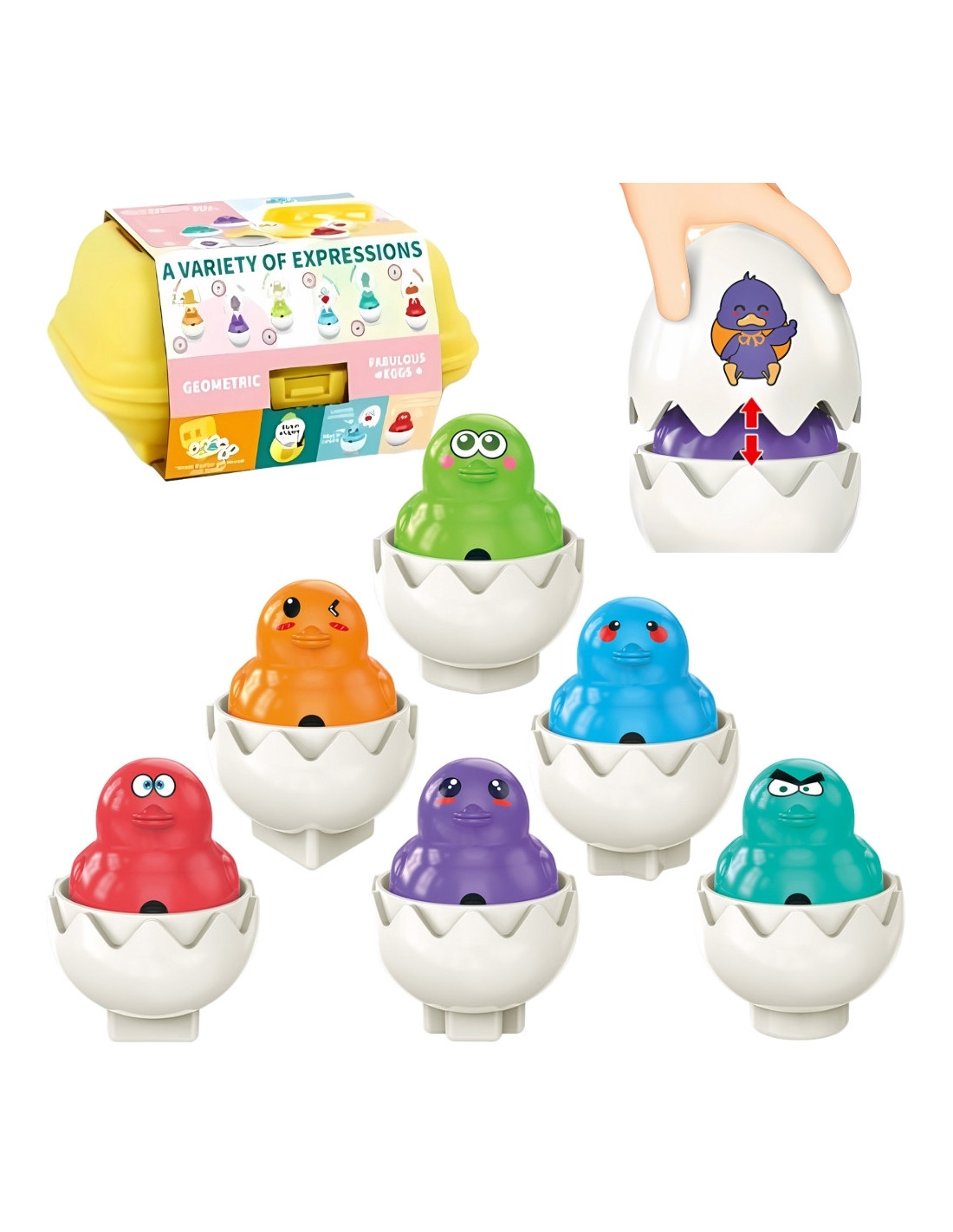 Białe jajka edukacyjne z kolorowymi naklejkami od marki Woopie wprowadzą Twoje dziecko w świat pełen kolorów, kształtów i zabawnych minek. Każde z sześciu uroczych jajeczek skrywa w środku kolorowego pisklaka z inną, śmieszną minką , po naciśnięciu na którego usłyszymy efekt dźwiękowy. Zadaniem malucha jest nie tylko dopasowanie odpowiedniej skorupki do jajka, ale przede wszystkim dopasowanie go do odpowiedniego miejsca w wytłaczance. Każde jajko ma na spodzie unikalny kształt geometryczny, który odpowiada jednemu otworowi w pudełku. Zabawne minki to świetny sposób, aby nauczyć dzieci rozpoznawania i nazywania emocji. Dzięki nim maluchy w łatwy i przyjemny sposób przyswajają, jak wyglądają i co oznaczają różne uczucia.To fantastyczny trening logicznego myślenia i koordynacji!