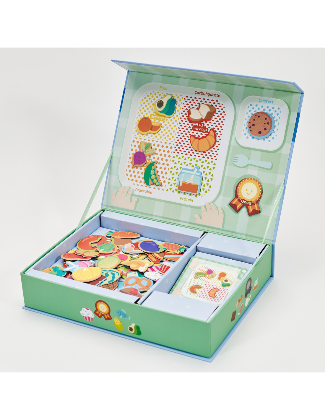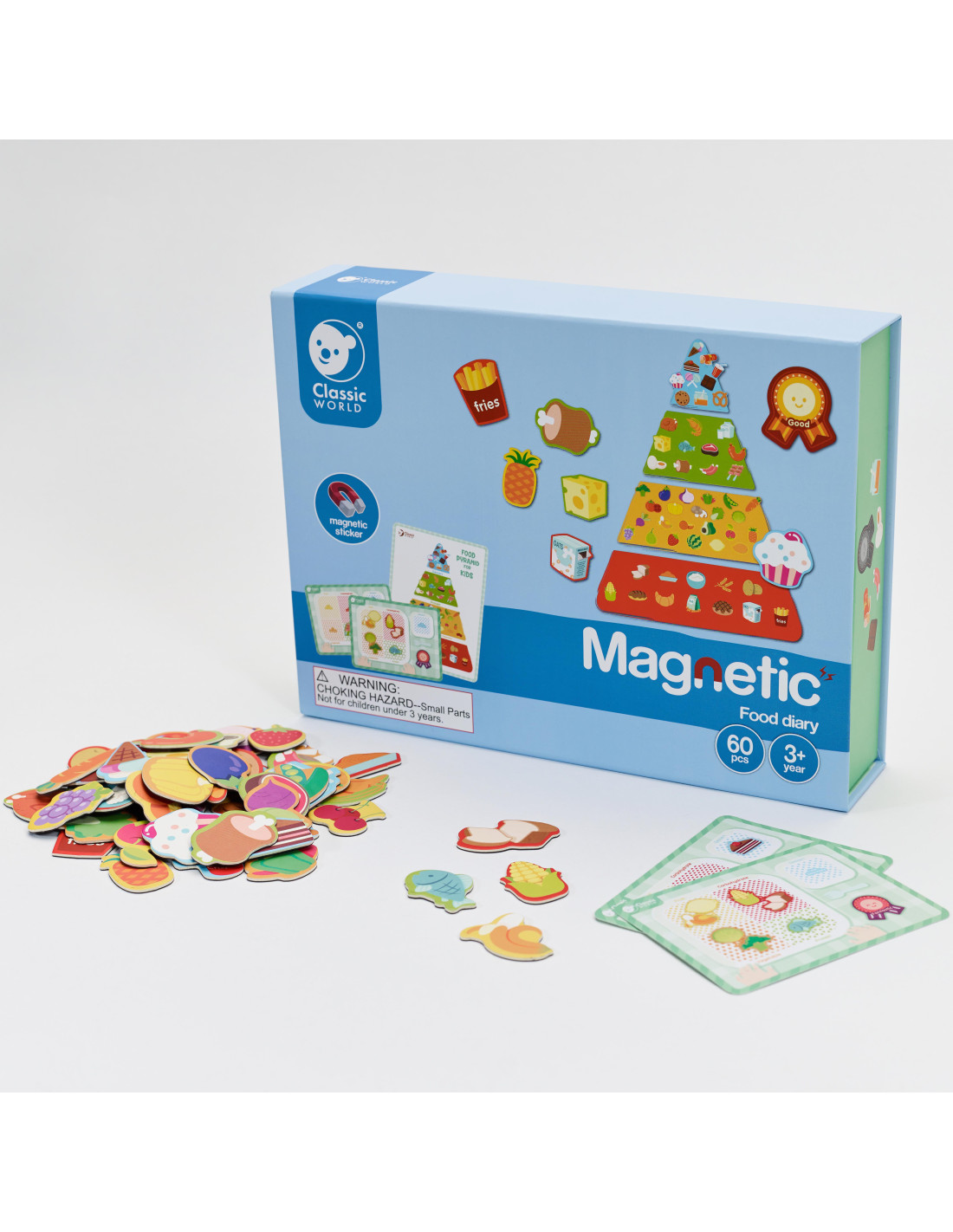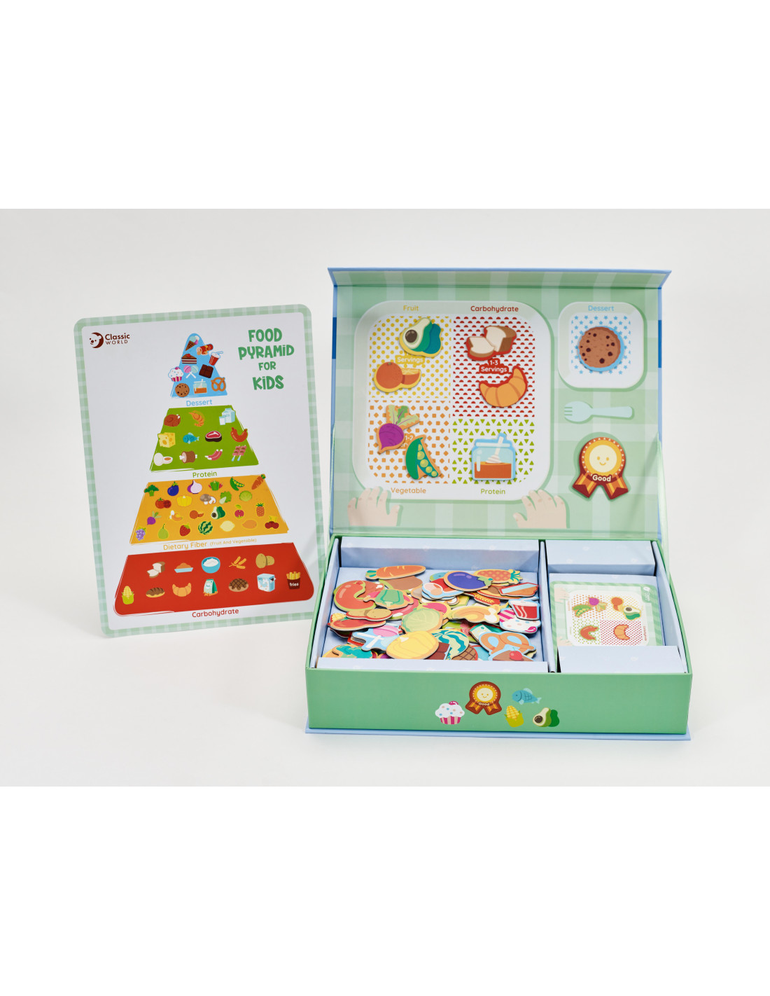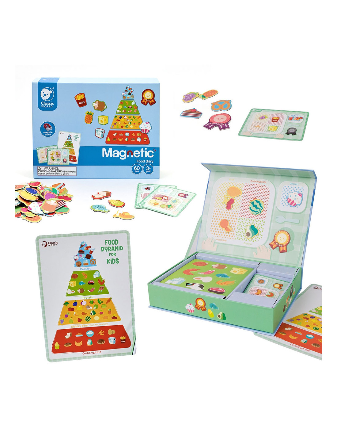 Układanka Nauka o Żywieniu od renomowanej marki Classic World to idealny produkt, aby dziecko poznało podstawy prawidłowego żywienia. Zestaw zawiera pudełko z magnetyczną planszą, na której możesz układać podstawowe produkty żywieniowe. W układance uwzględniono aż 60 różnych produktów spożywczych, takich jak węglowodany, białka, warzywa, owoce i słodycze, które powinny znaleźć się w codziennej diecie dziecka.