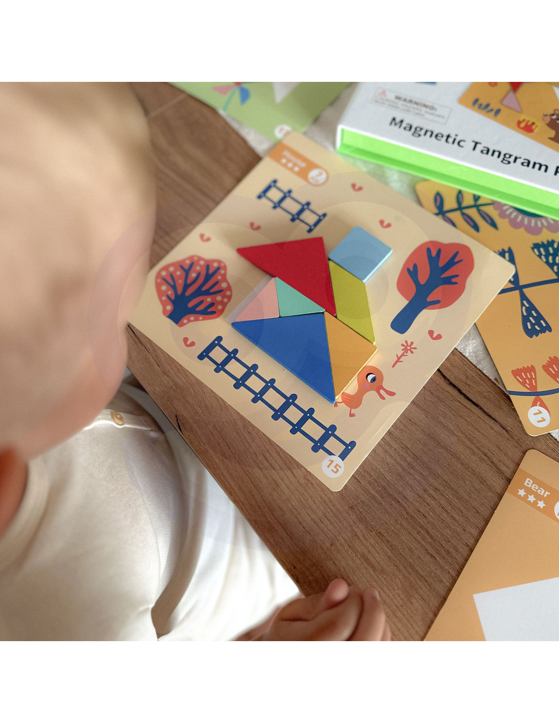 Tooky Toy Układanka Kształtów zapewni mnóstwo dobrej zabawy wspomagając przy tym rozwój intelektualny najmłodszych. Intensywne kolory i radosne wizerunki zwierzątek sprawią, że zabawka przypadnie do gustu nawet najbardziej wymagającemu użytkownikowi. Dzięki tej zabawce twoja pociecha ma możliwość za pomocą magnetycznych figur geometrycznych dopasować odpowiednio obrazki na specjalnej platformie i układać z nich zwierzątka Kompaktowe opakowanie sprawi, że będą idealne w podróży. Producent wybierając najwyższej jakości, ekologiczne materiały zadbał o bezpieczeństwo dzieci i środowiska.