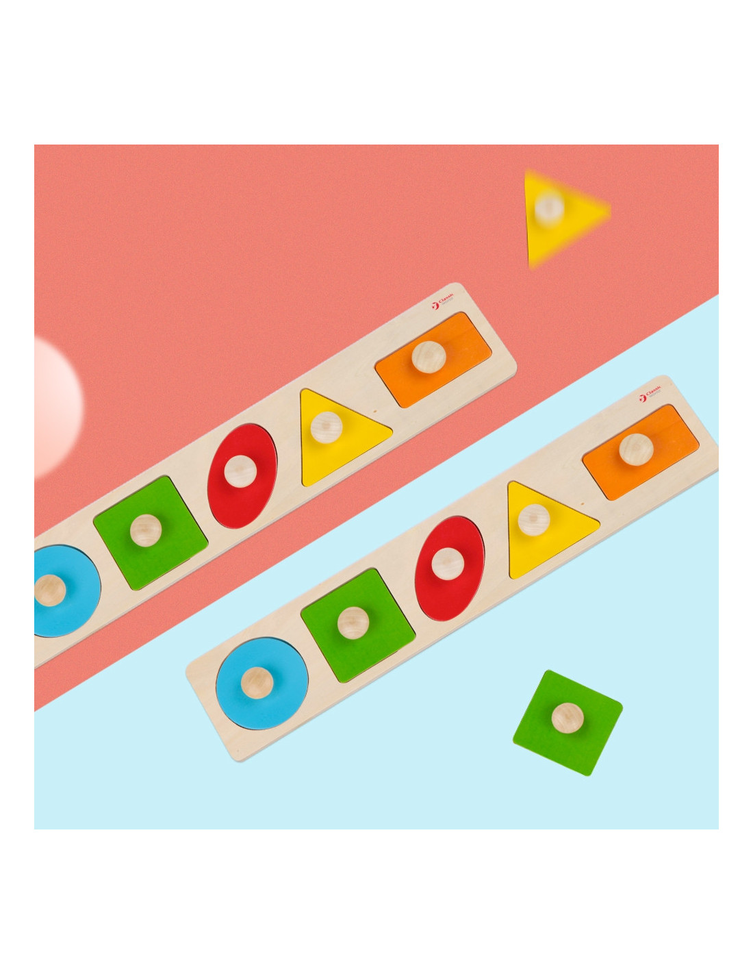 - - Zestaw zawiera: tablicę z wgłębieniami i 6 elementów przedstawiających figury geometryczne z pinezkami do chwytania.