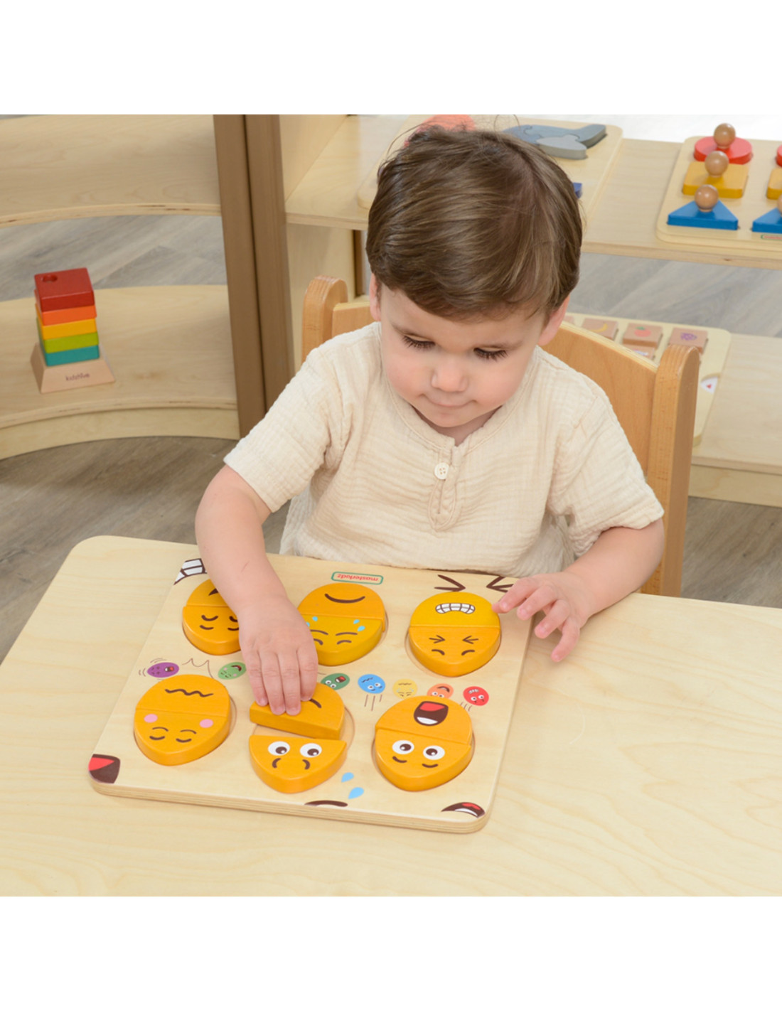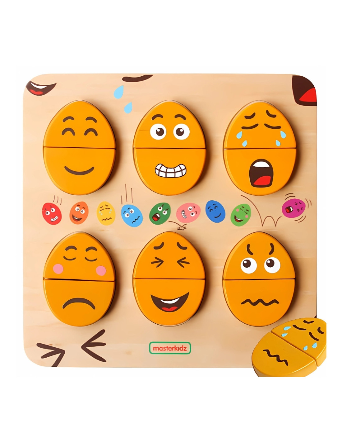 Drewniana tablica do nauki emocji marki MASTERKIDZ. Tablica została zaprojektowana, aby pomóc dzieciom rozwinąć świadomość emocjonalną i umiejętności społeczne. Dzieci mogą łączyć górną i dolną część na różne sposoby, aby uzyskać wyraz twarzy. Jest to szczególnie przydatne narzędzie zachęcające dzieci do niewerbalnego wyrażania swoich uczuć. Może być również używany jako narzędzie do nauczania dzieci o empatii, prosząc je o odgadnięcie lub odwzorowanie uczuć innych za pomocą tych klocków.