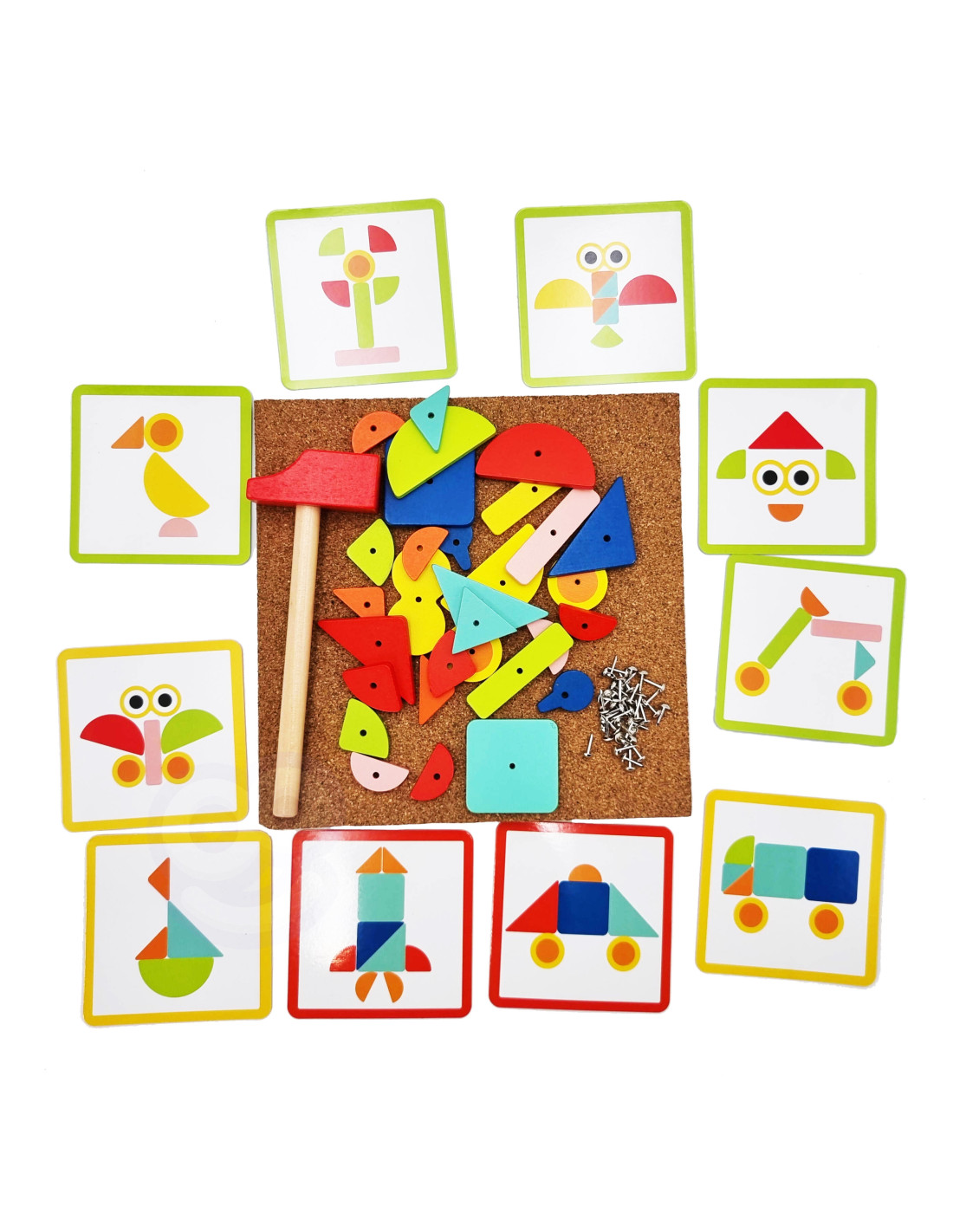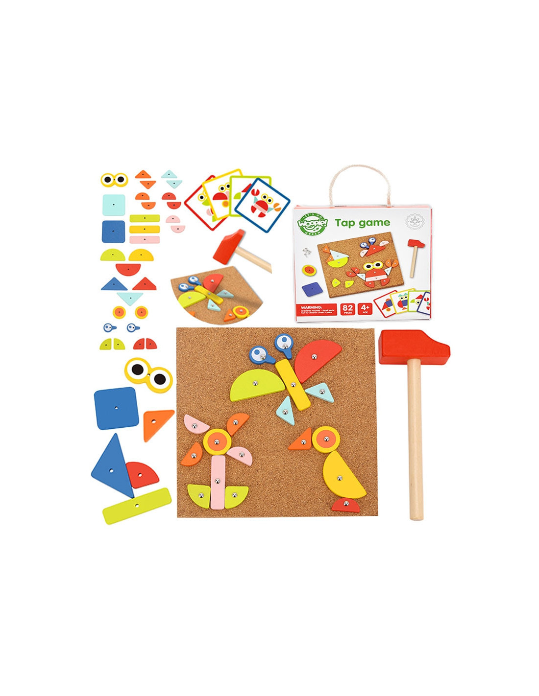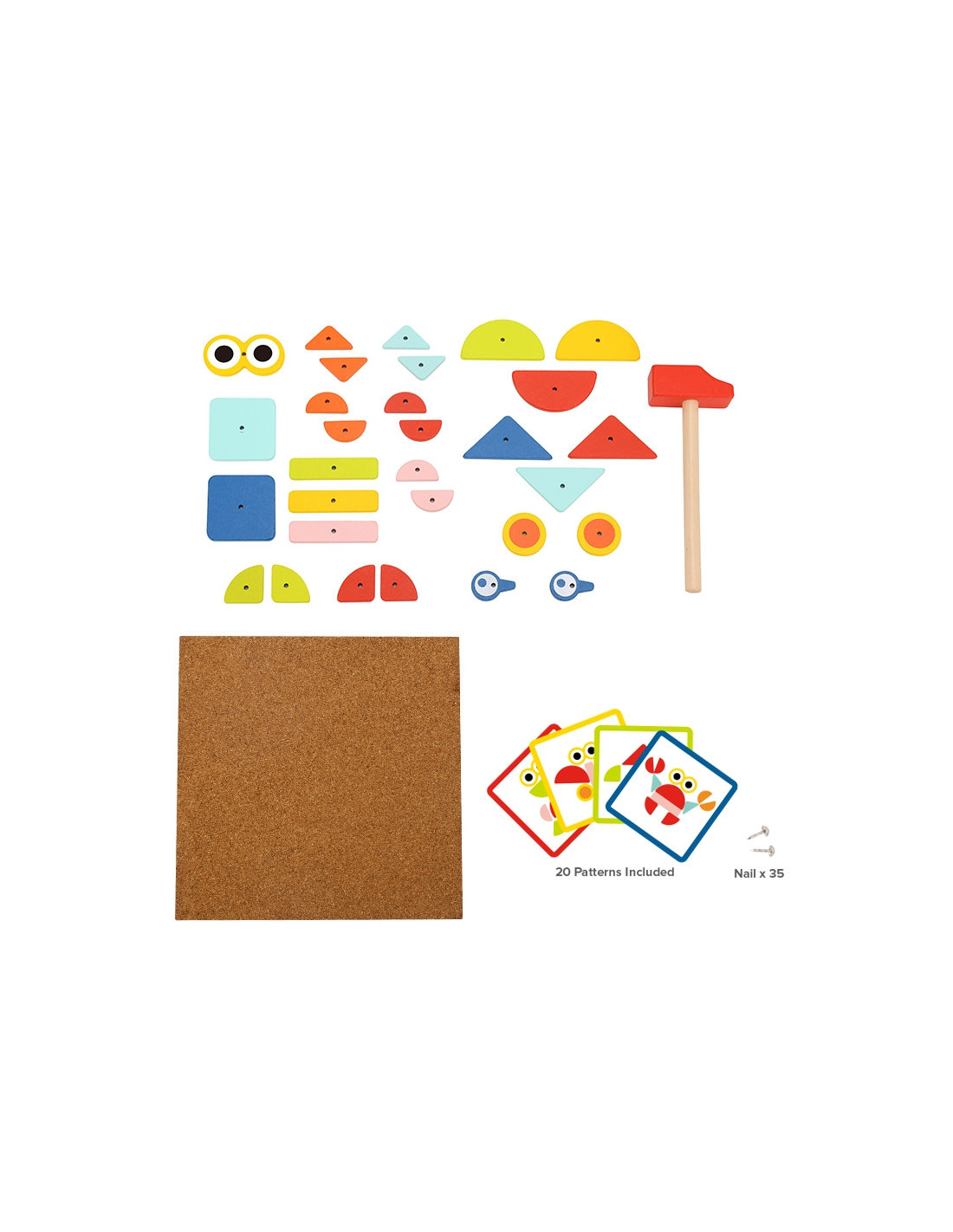- - zestaw zawiera 82 el.: 30 klocków, 40 pinezki, 10 kart z 20 wzorami, tablice korkową oraz młotek