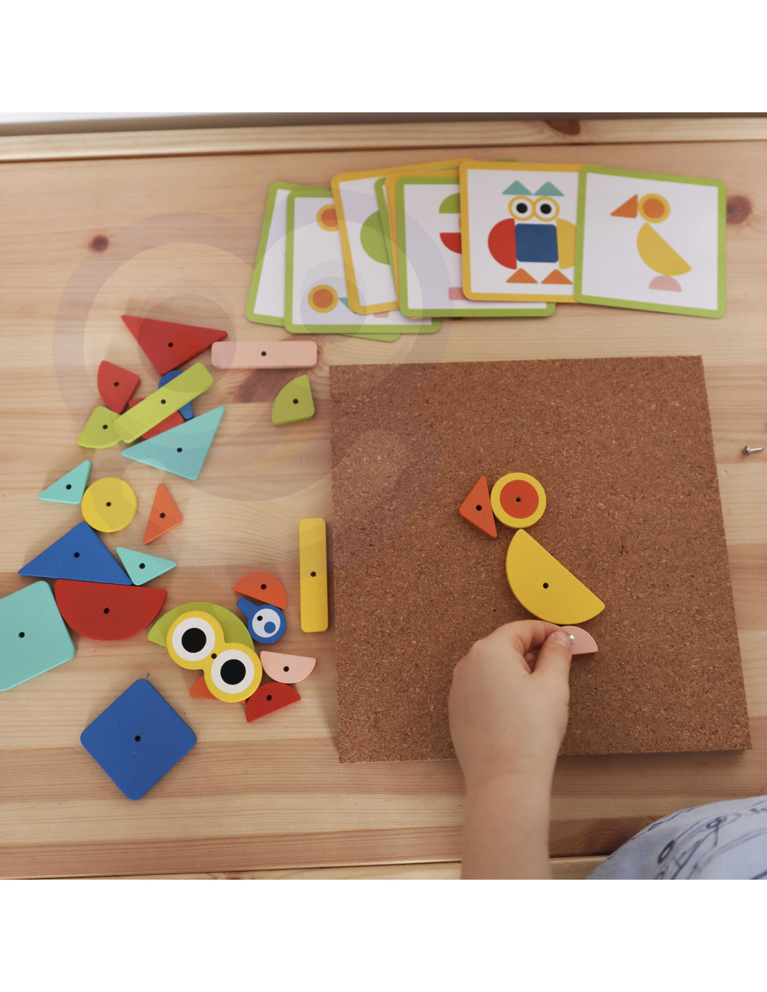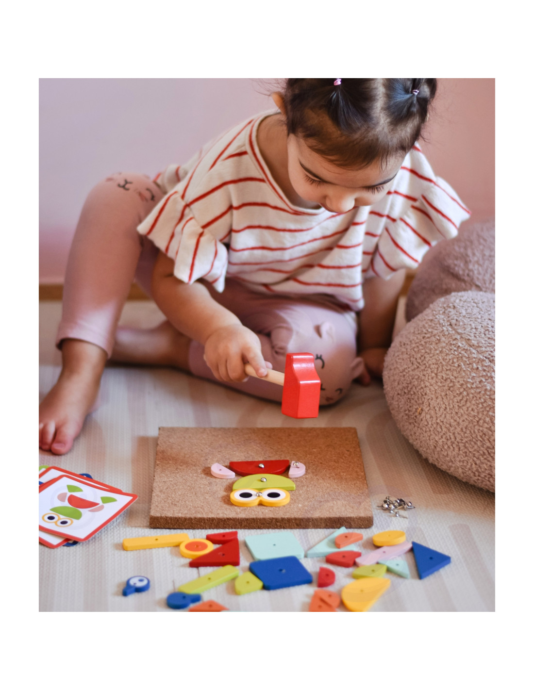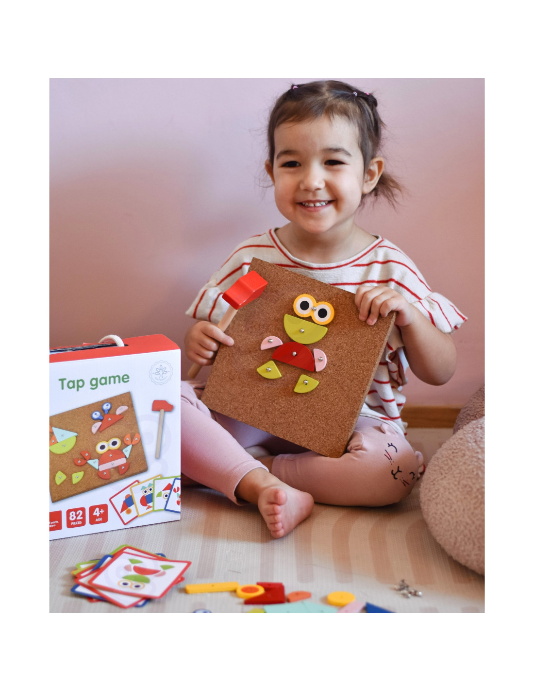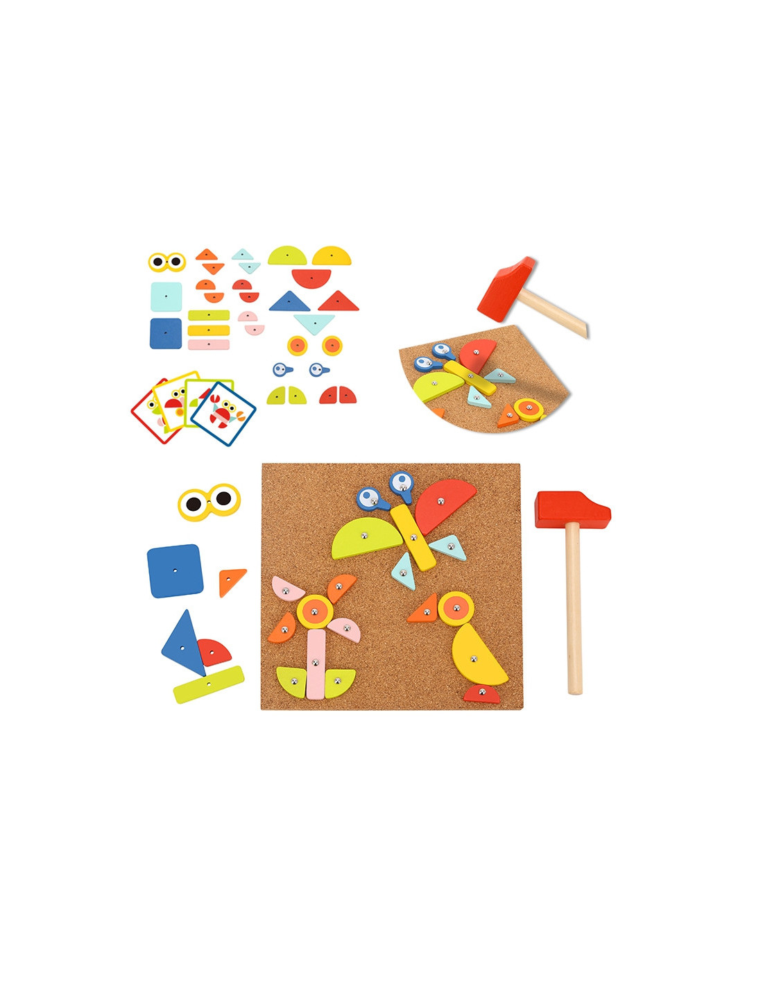 - - zestaw zawiera 82 el.: 30 klocków, 40 pinezki, 10 kart z 20 wzorami, tablice korkową oraz młotek