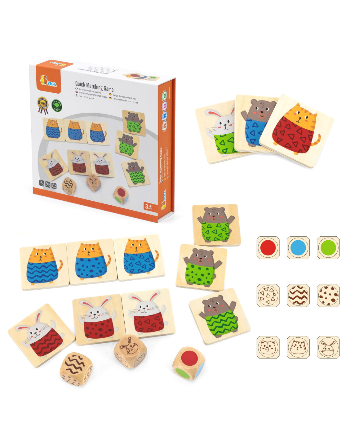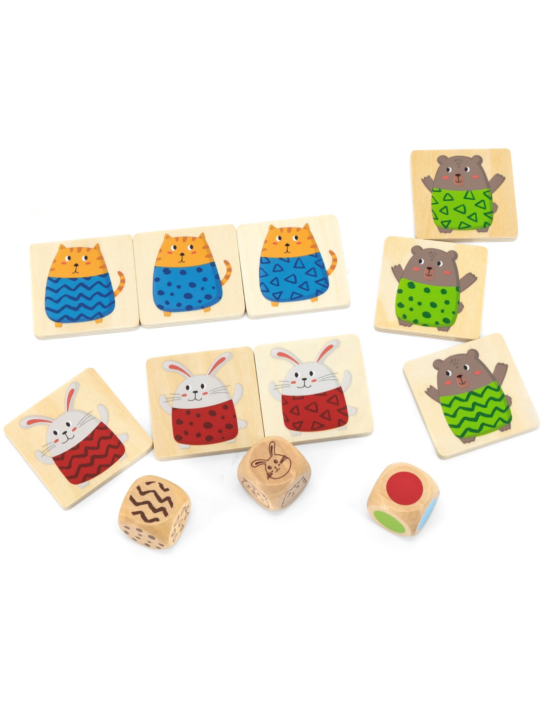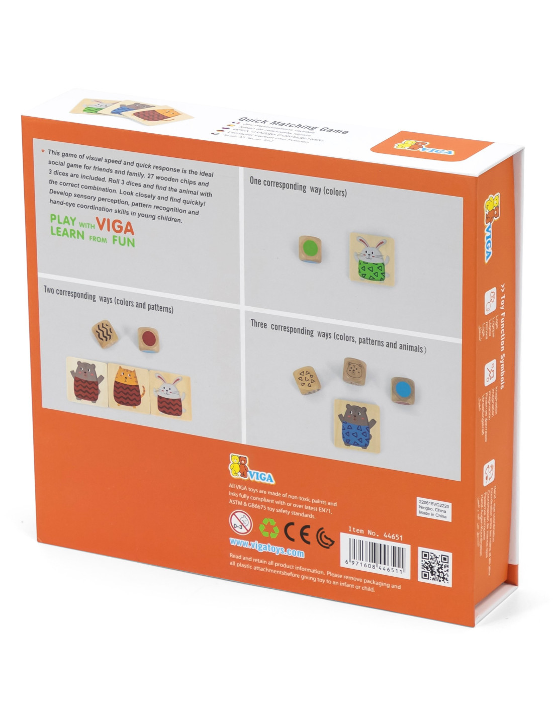 Drewniana gra szybkiego odgadywania marki VIGA to idealna gra towarzyska dla przyjaciół i rodziny. Zadaniem dziecka jest rzucić wybraną ilość kostek (od 1 do 3) i znaleźć odpowiednie zwierzę z odpowiednimi wzorami na koszulce oraz w odpowiednim kolorze. Całość wykonana jest z drewna i pomalowana nietoksycznymi farbami.
