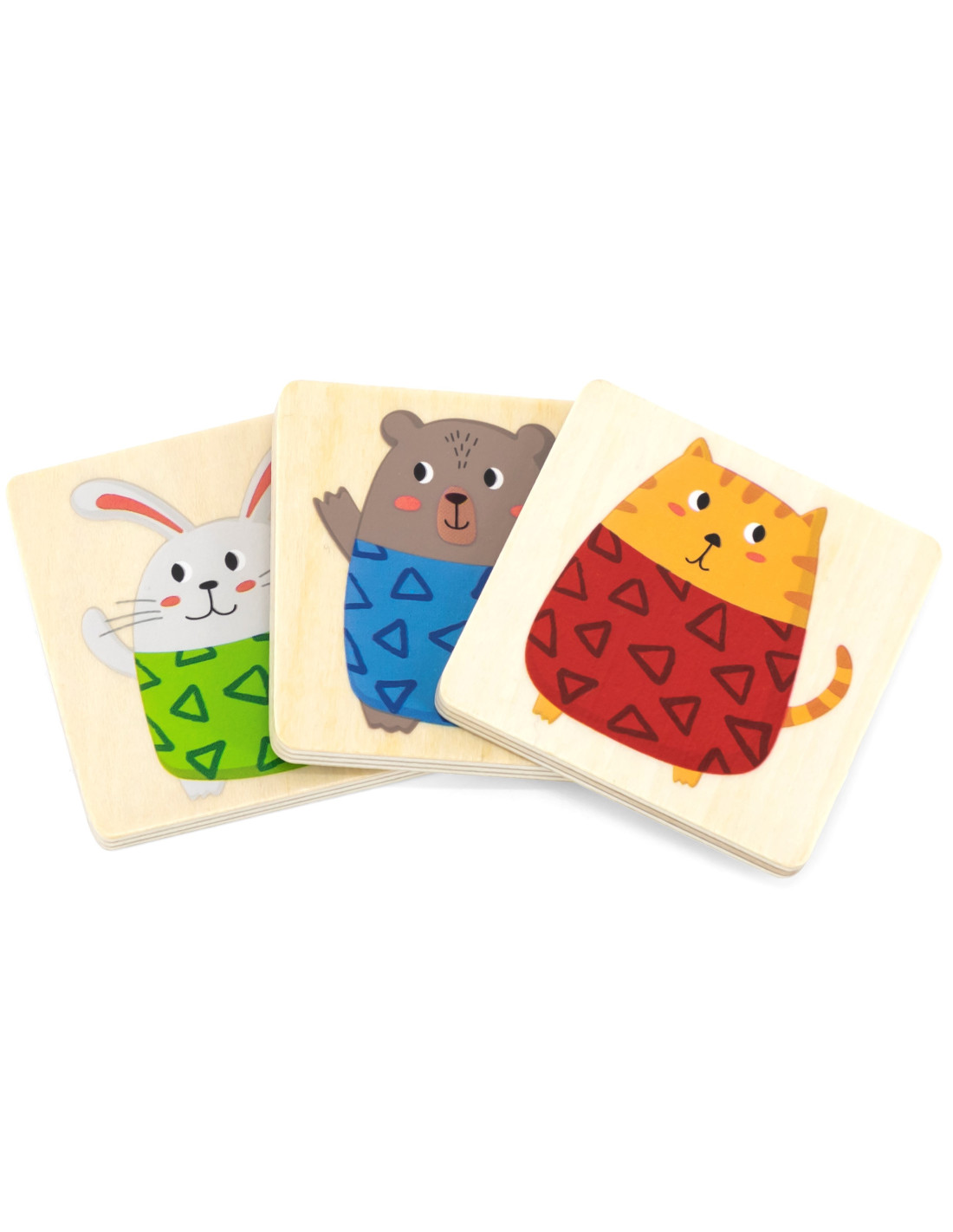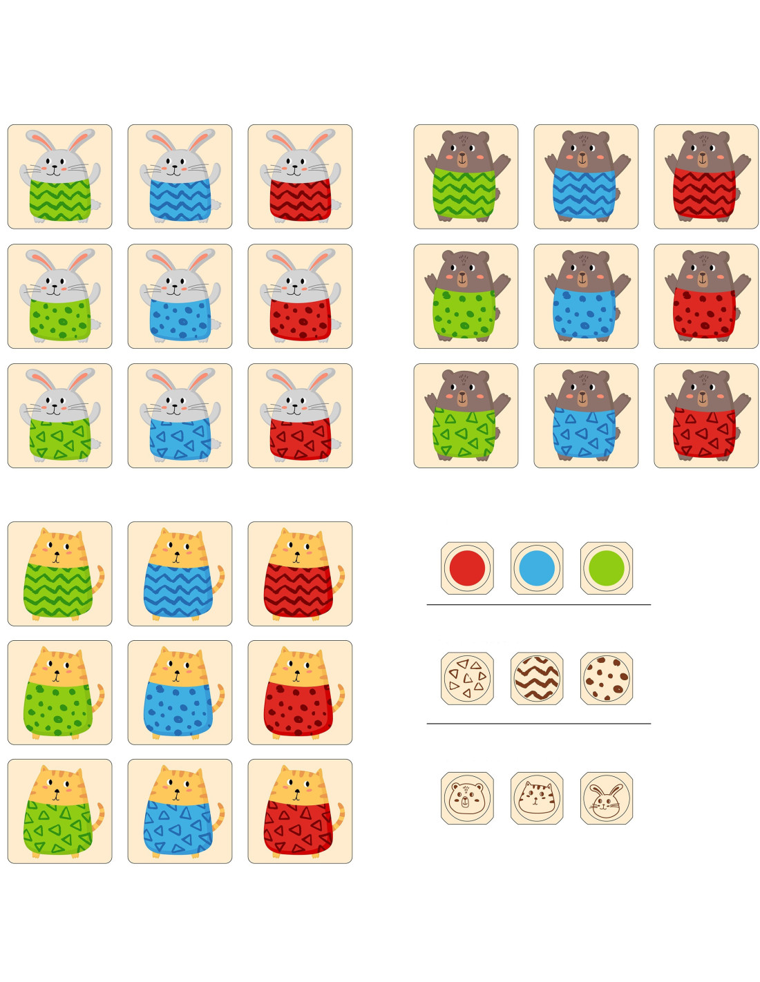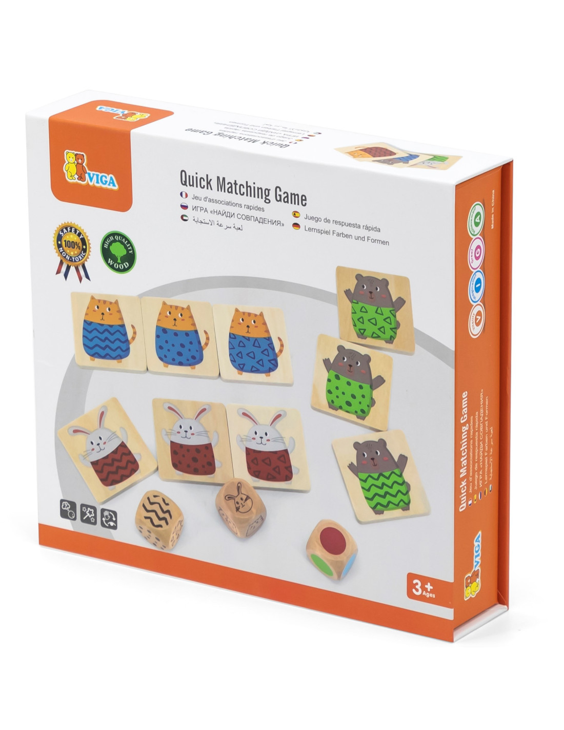 Drewniana gra szybkiego odgadywania marki VIGA to idealna gra towarzyska dla przyjaciół i rodziny. Zadaniem dziecka jest rzucić wybraną ilość kostek (od 1 do 3) i znaleźć odpowiednie zwierzę z odpowiednimi wzorami na koszulce oraz w odpowiednim kolorze. Całość wykonana jest z drewna i pomalowana nietoksycznymi farbami.