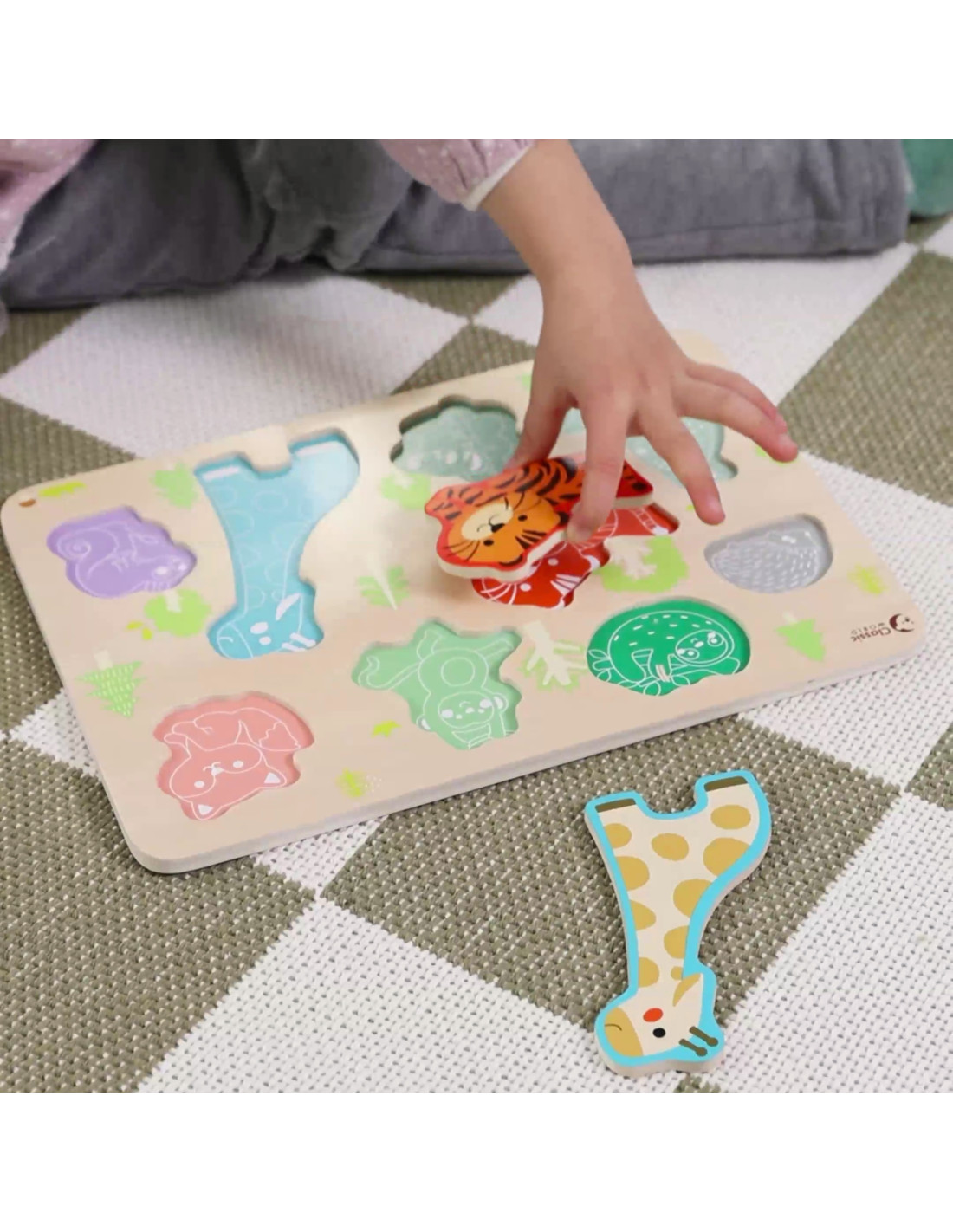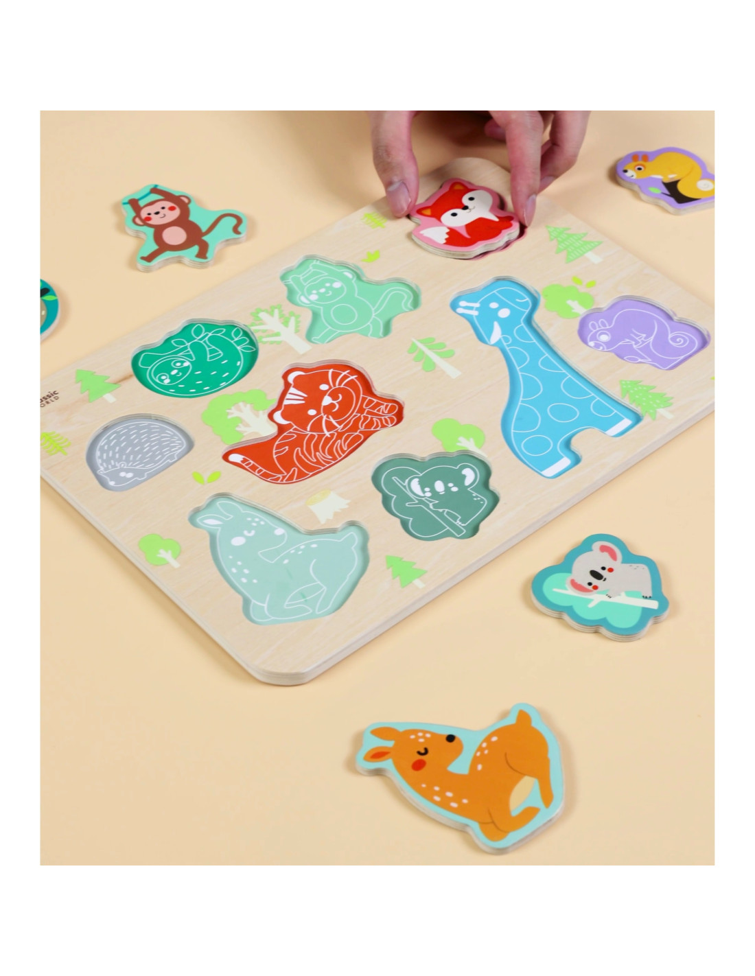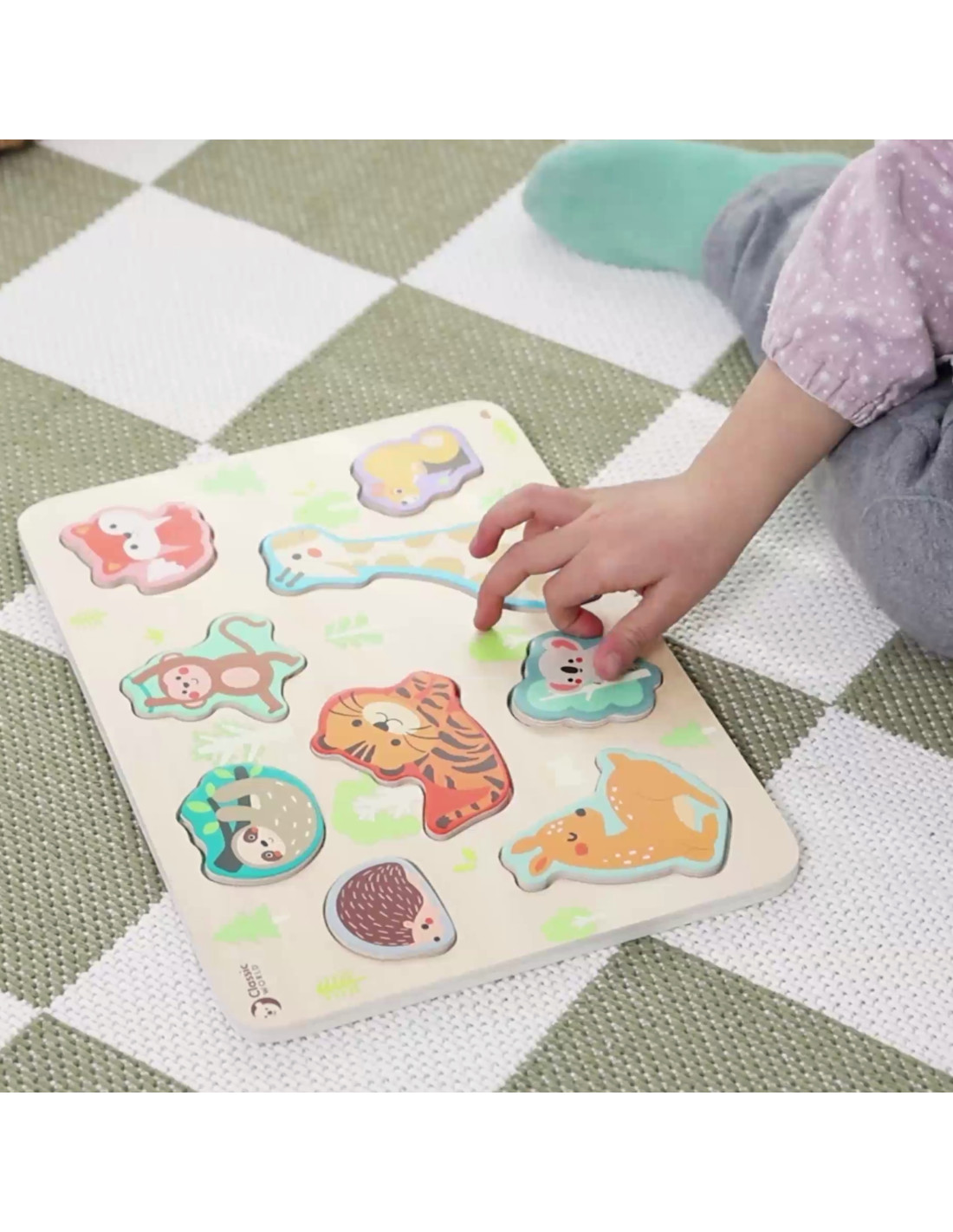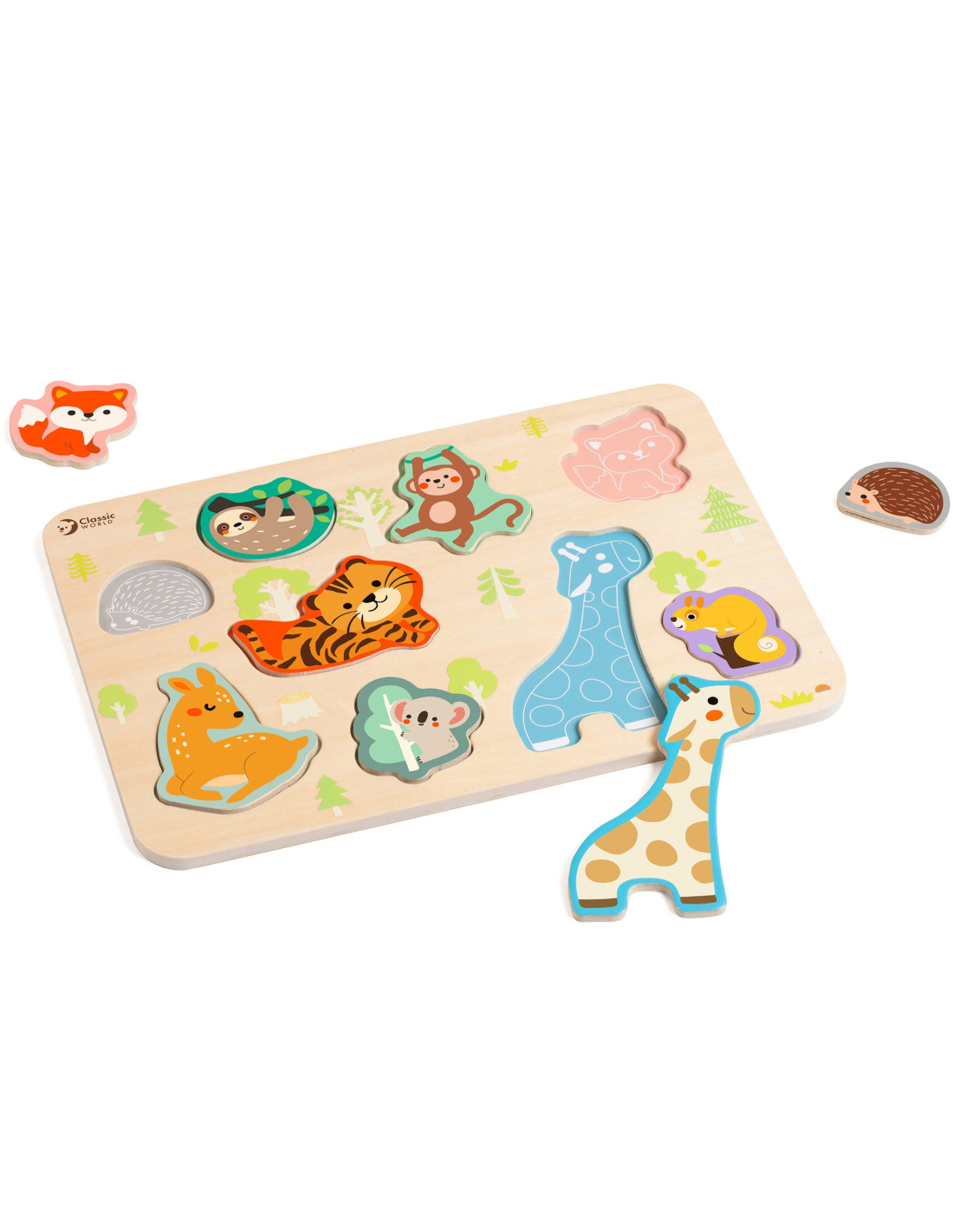 Drewniana układanka ze zwierzętami to edukacyjna zabawka dla dzieci. Maluch dopasowuje kolorowe zwierzątka, takie jak żyrafa czy lisek, do miejsc na tablicy z motywami leśnymi.