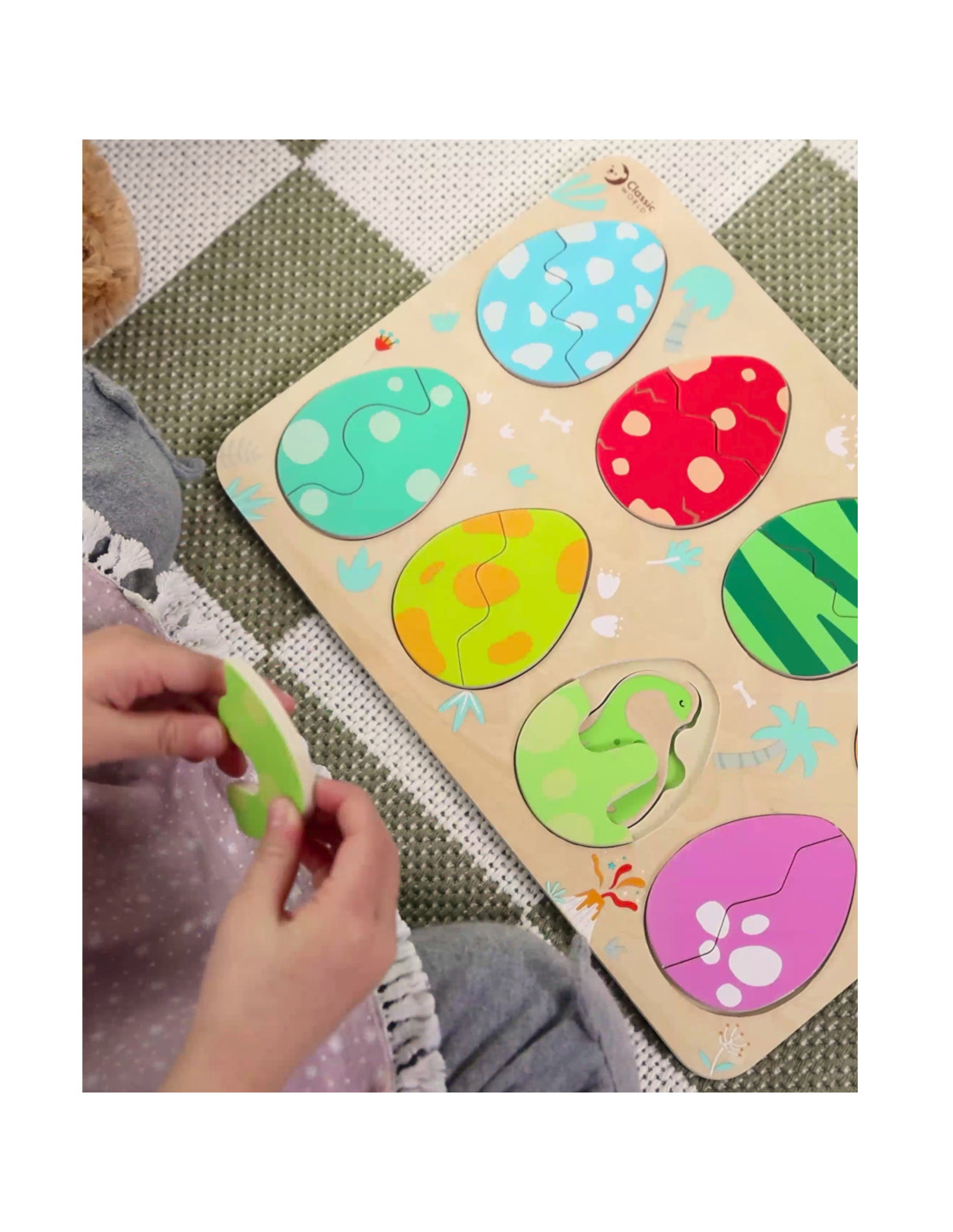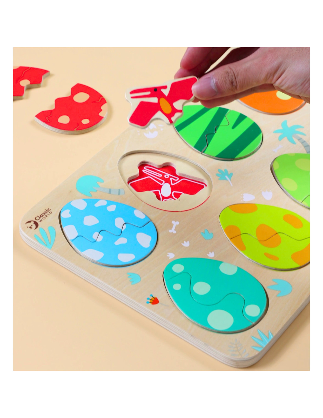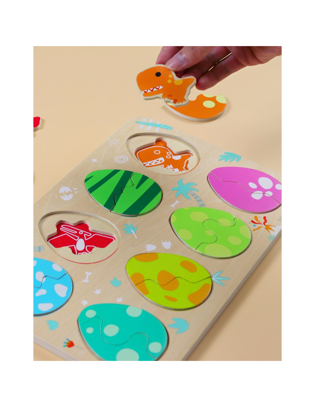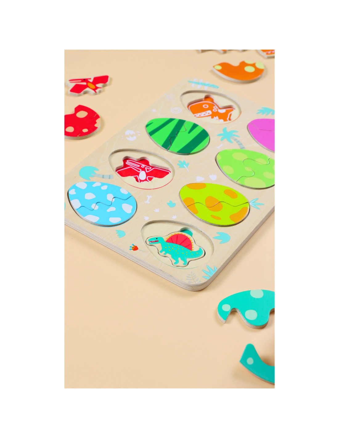 Trójwarstwowa konstrukcja pozwala dopasowywać jajka do ukrytych pod nimi dinozaurów, a na najniższej warstwie odkrywać proste rysunki pomagające w dopasowywaniu dinozaurów do opowiadających im miejsc. Zabawka wspiera naukę kształtów i kolorów, logiczne myślenie i kreatywność w przyjemny sposób.