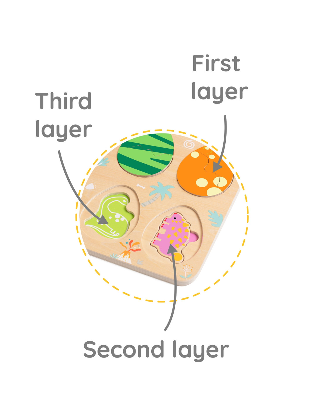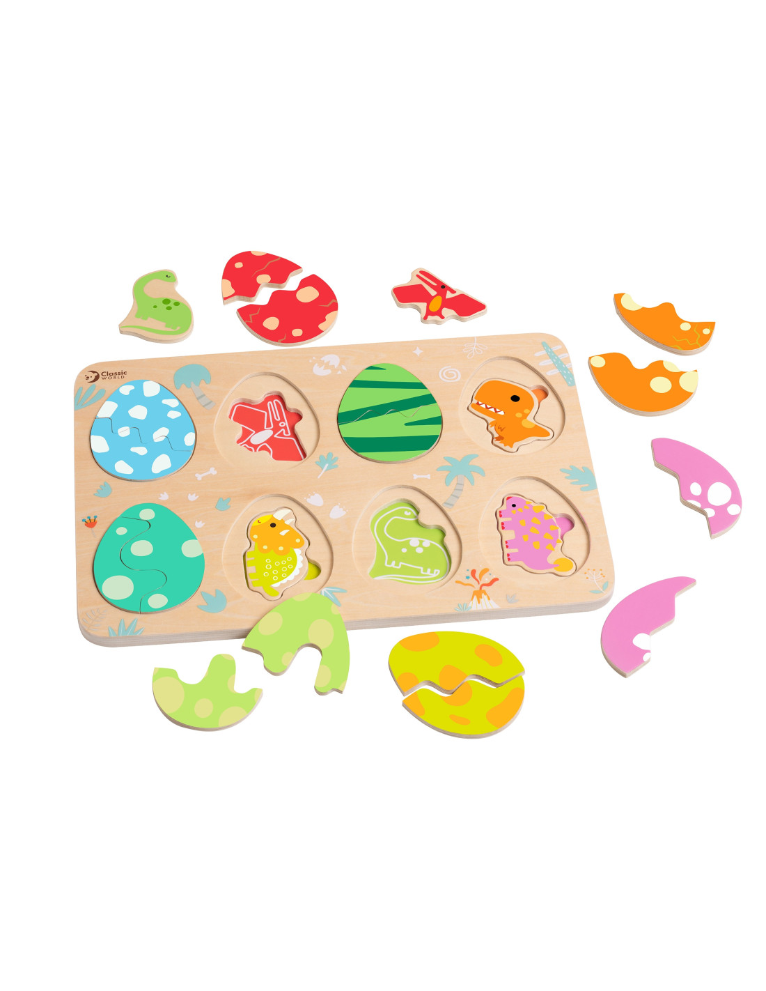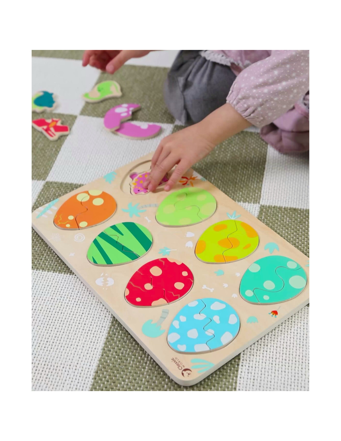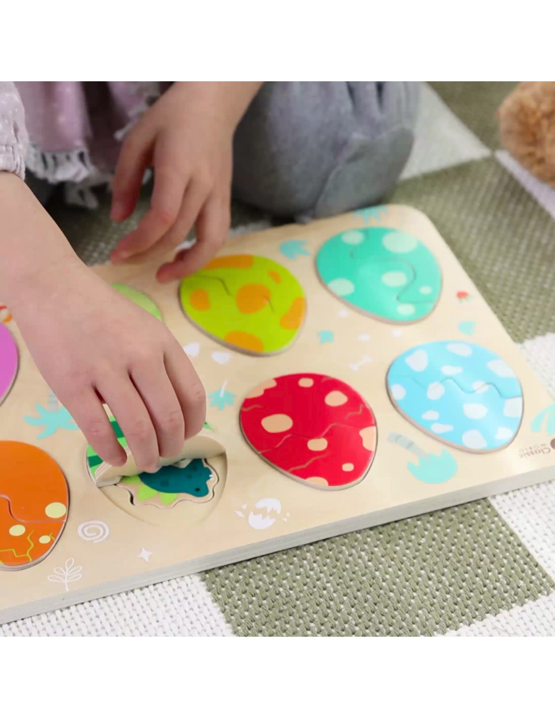 Trójwarstwowa konstrukcja pozwala dopasowywać jajka do ukrytych pod nimi dinozaurów, a na najniższej warstwie odkrywać proste rysunki pomagające w dopasowywaniu dinozaurów do opowiadających im miejsc. Zabawka wspiera naukę kształtów i kolorów, logiczne myślenie i kreatywność w przyjemny sposób.