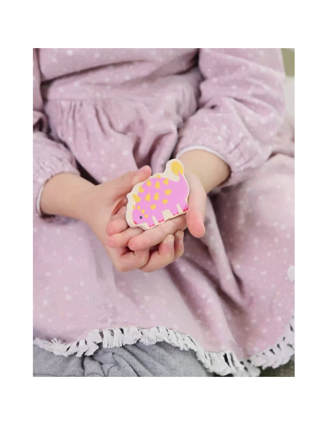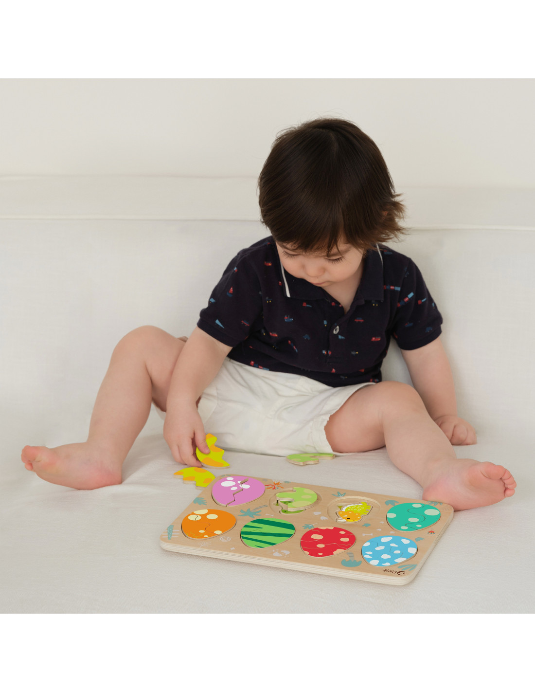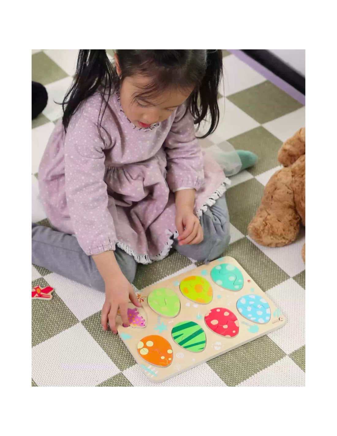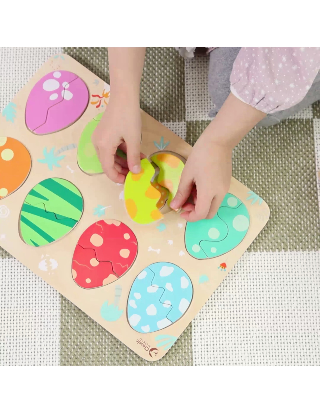 Trójwarstwowa konstrukcja pozwala dopasowywać jajka do ukrytych pod nimi dinozaurów, a na najniższej warstwie odkrywać proste rysunki pomagające w dopasowywaniu dinozaurów do opowiadających im miejsc. Zabawka wspiera naukę kształtów i kolorów, logiczne myślenie i kreatywność w przyjemny sposób.