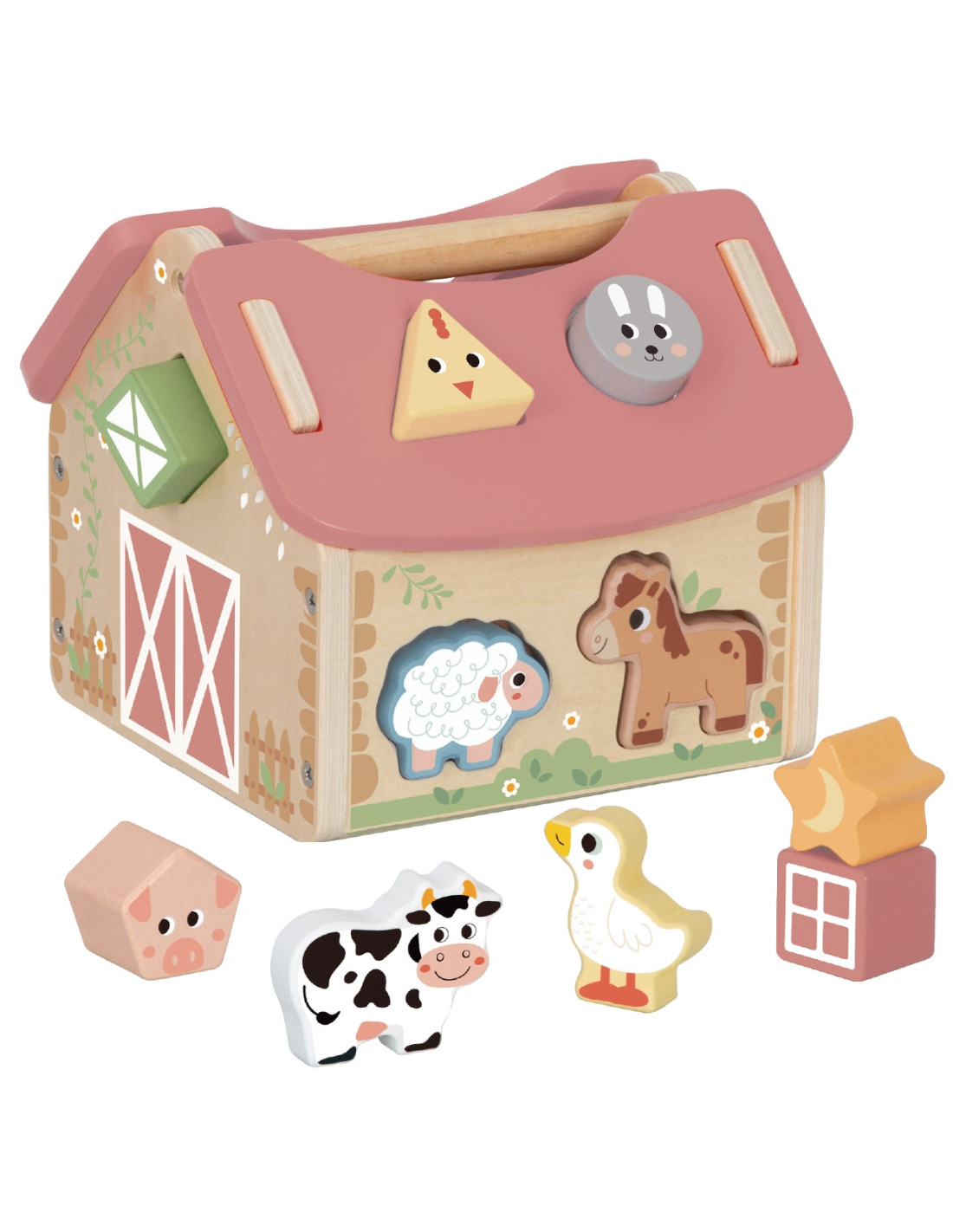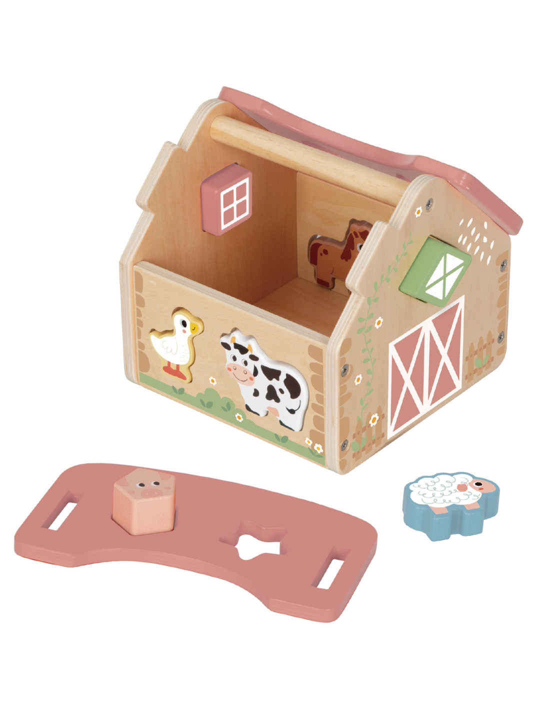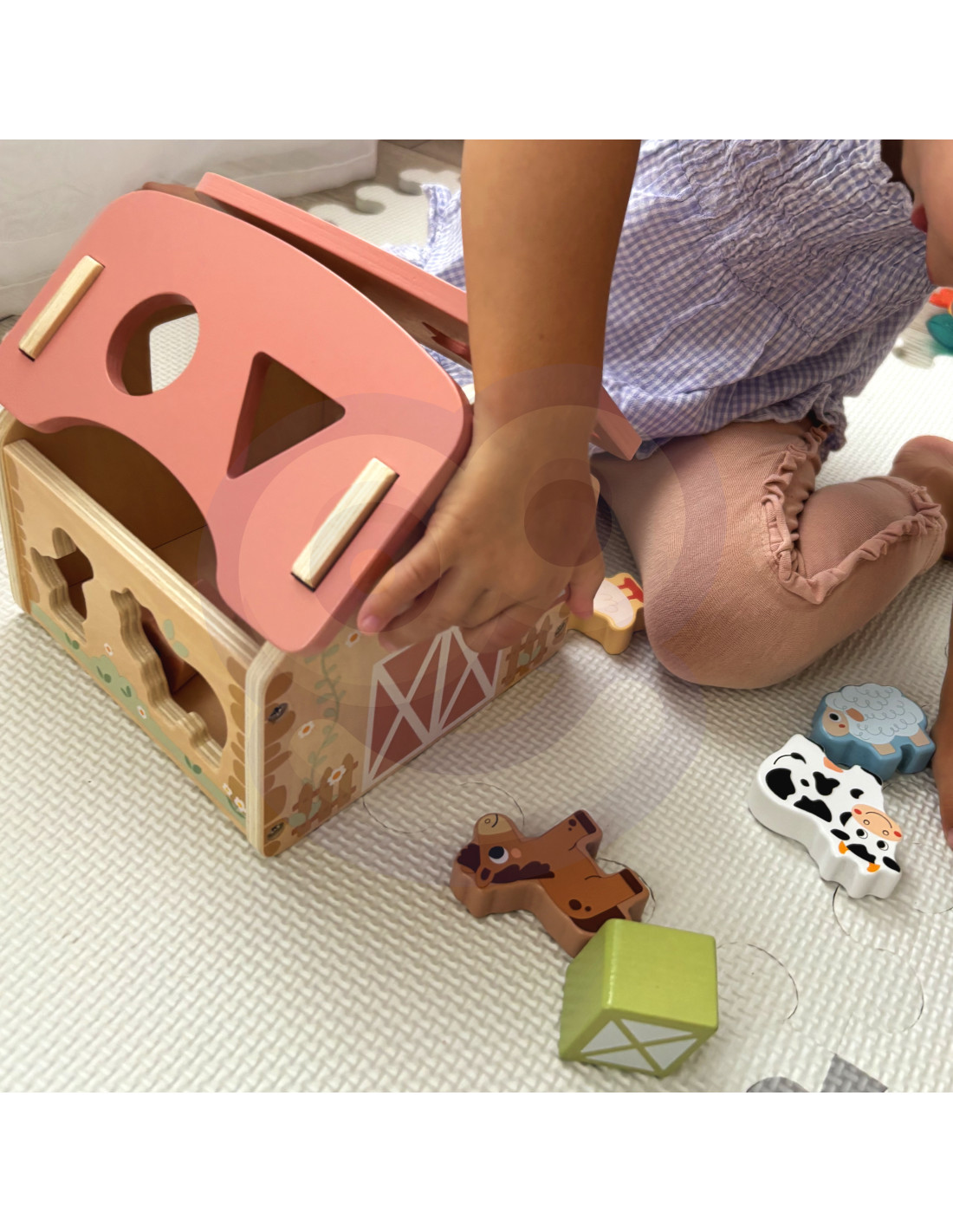 Zabawa polega na dopasowywaniu drewnianych zwierzątek i klocków do odpowiednich otworów w ścianach stodoły. Maluch ćwiczy przy tym koordynację wzrokowo-ruchową, cierpliwość i koncentrację. Uczy się przez działanie – a to najlepszy sposób na trwałą naukę.