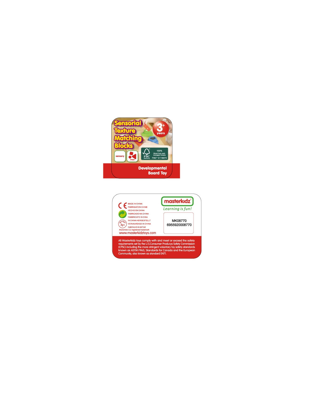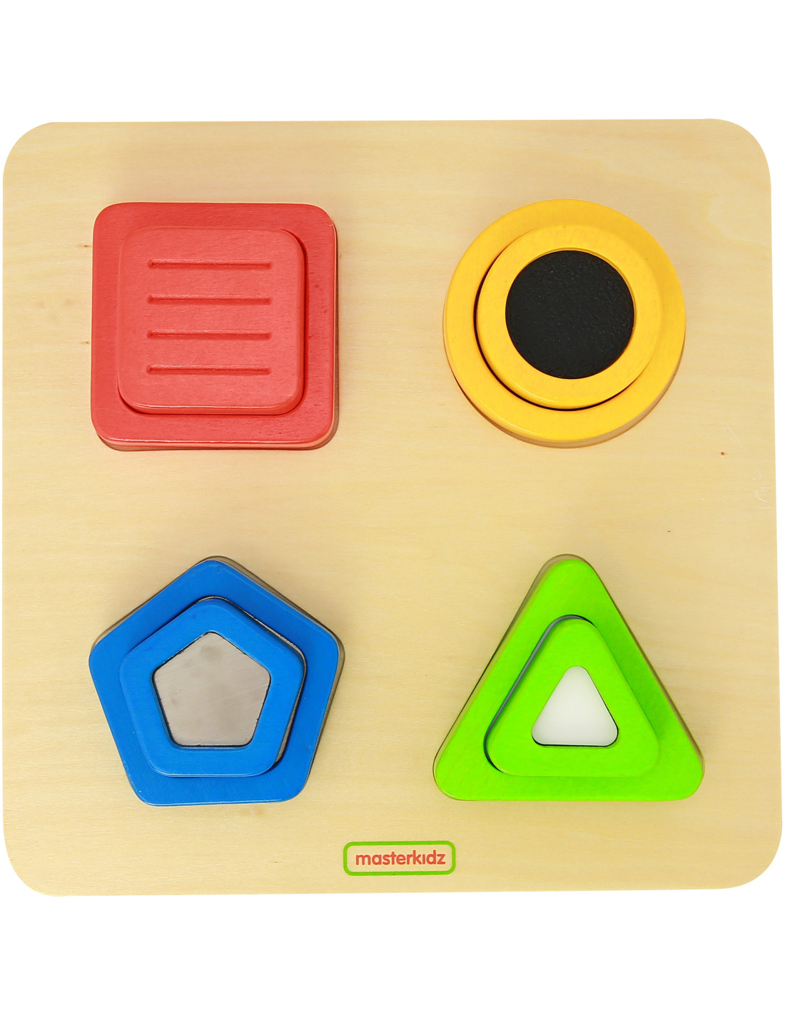 Fantastyczna drewniana zabawka interaktywna marki Masterkidz, która pomoże rozwinąć zmysł dotyku Twojego dziecka. Drewniany sorter łączy kilka bardzo ważnych funkcji. Dziecko może łączyć kształty, kolory, a także fakturę powierzchni klocków. Zestaw zawiera 4 pary pasujących do siebie drewnianych klocków, które należy umieścić najpierw w drewnianej planszy, a następnie parami jeden w drugim.