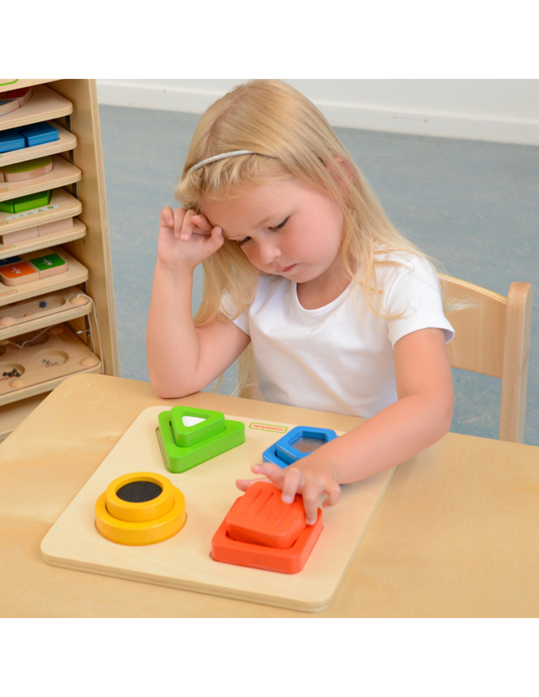 Cztery pary klocków o różnym kolorze, kształcie i fakturze powierzchni. Klocki można parami układać jeden w drugim na drewnianej planszy. Zabawka łączy funkcje sortera kształtów, sortera kolorów, oraz zabawki sensorycznej, rozwijającej zmysł dotyku.