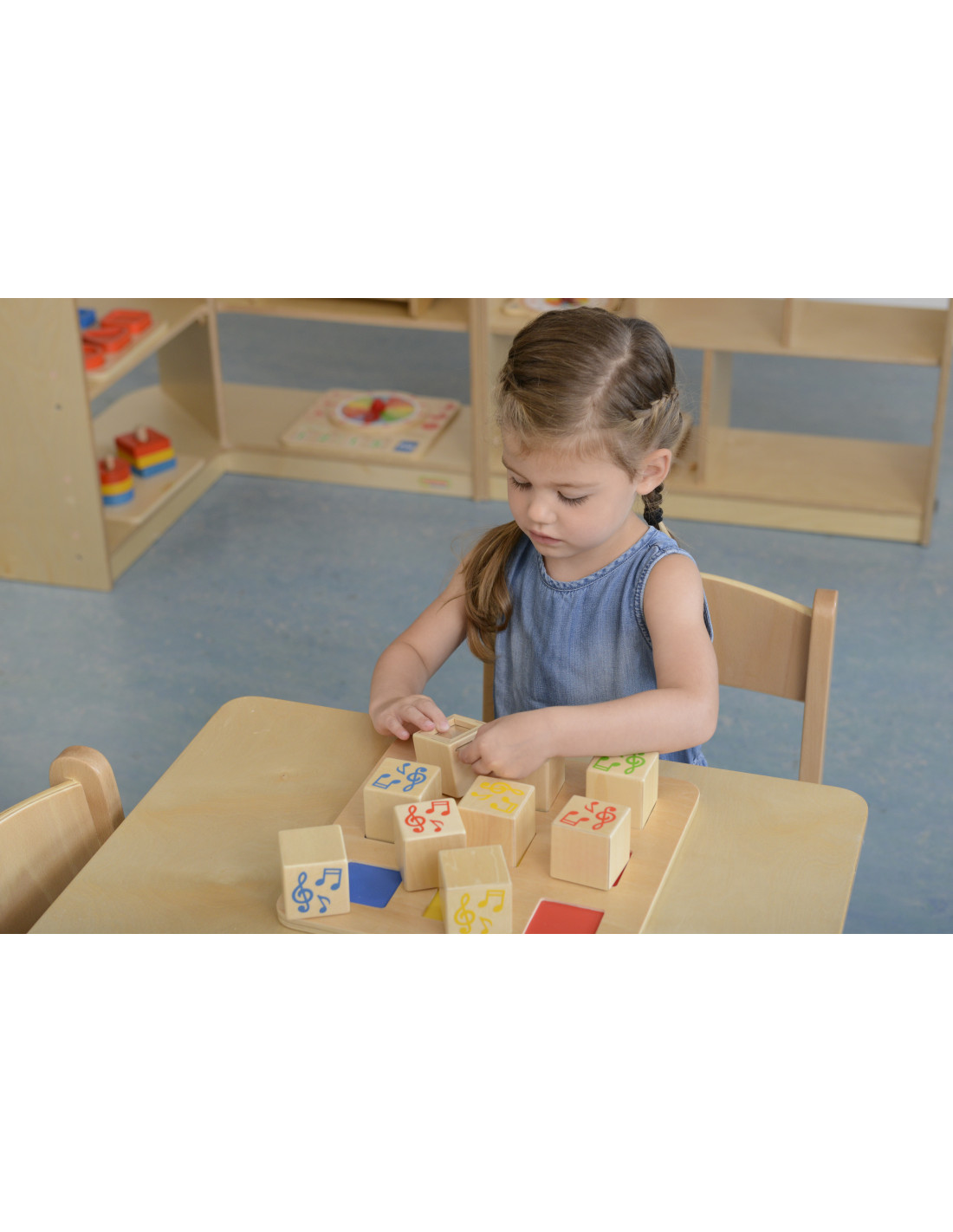 Osiem drewnianych kosteczek, które przy potrząśnięciu wydają różne dźwięki. Dzieci mają za zadanie dopasować pary kosteczek, które wydają takie same dźwięki. W zestawie znajduje się również pusta kosteczka, do której można włożyć dowolne obiekty: np. piasek, kamyki, drobne klocki, by sprawdzić jaki dźwięk będą wydawały przy potrząsaniu.