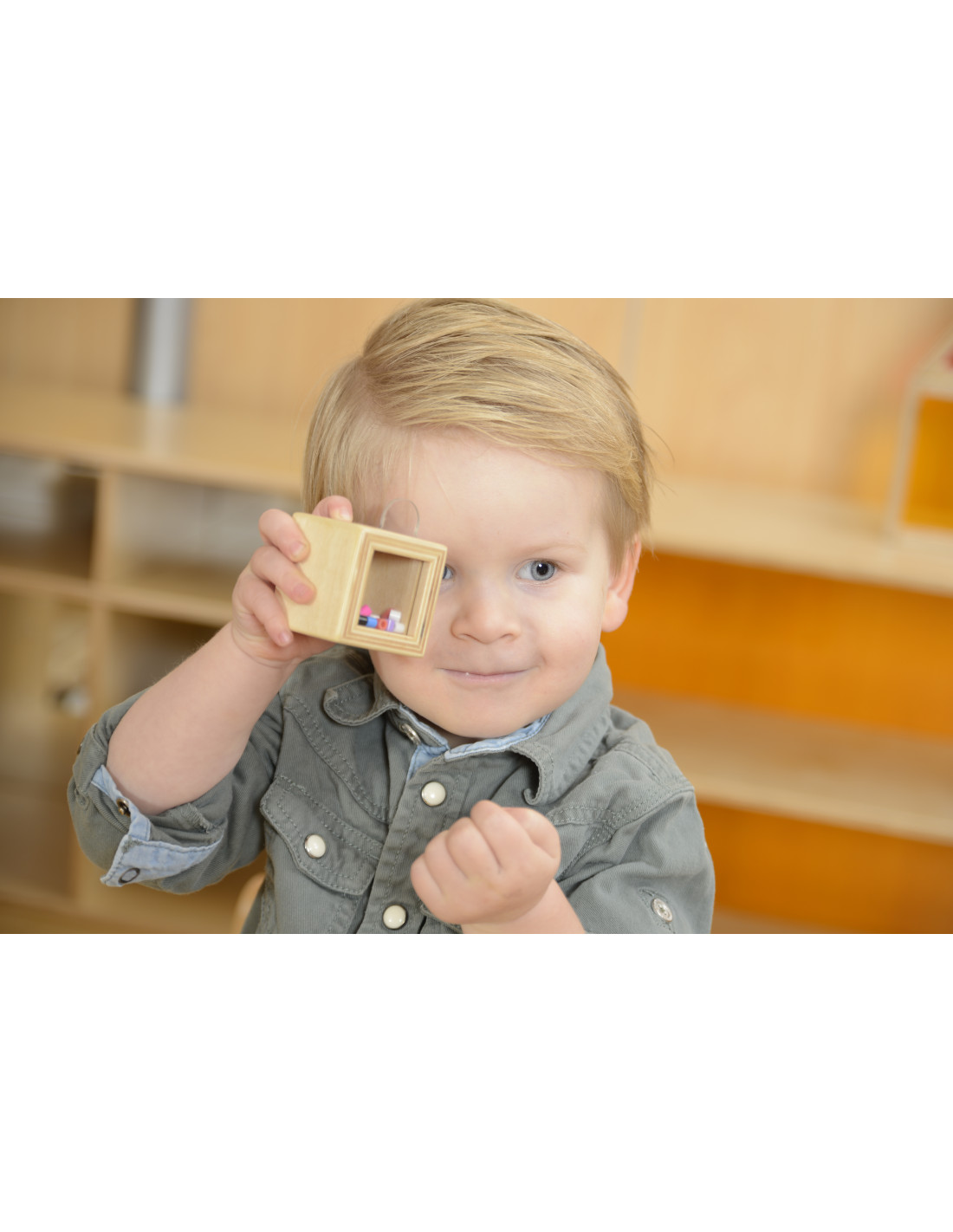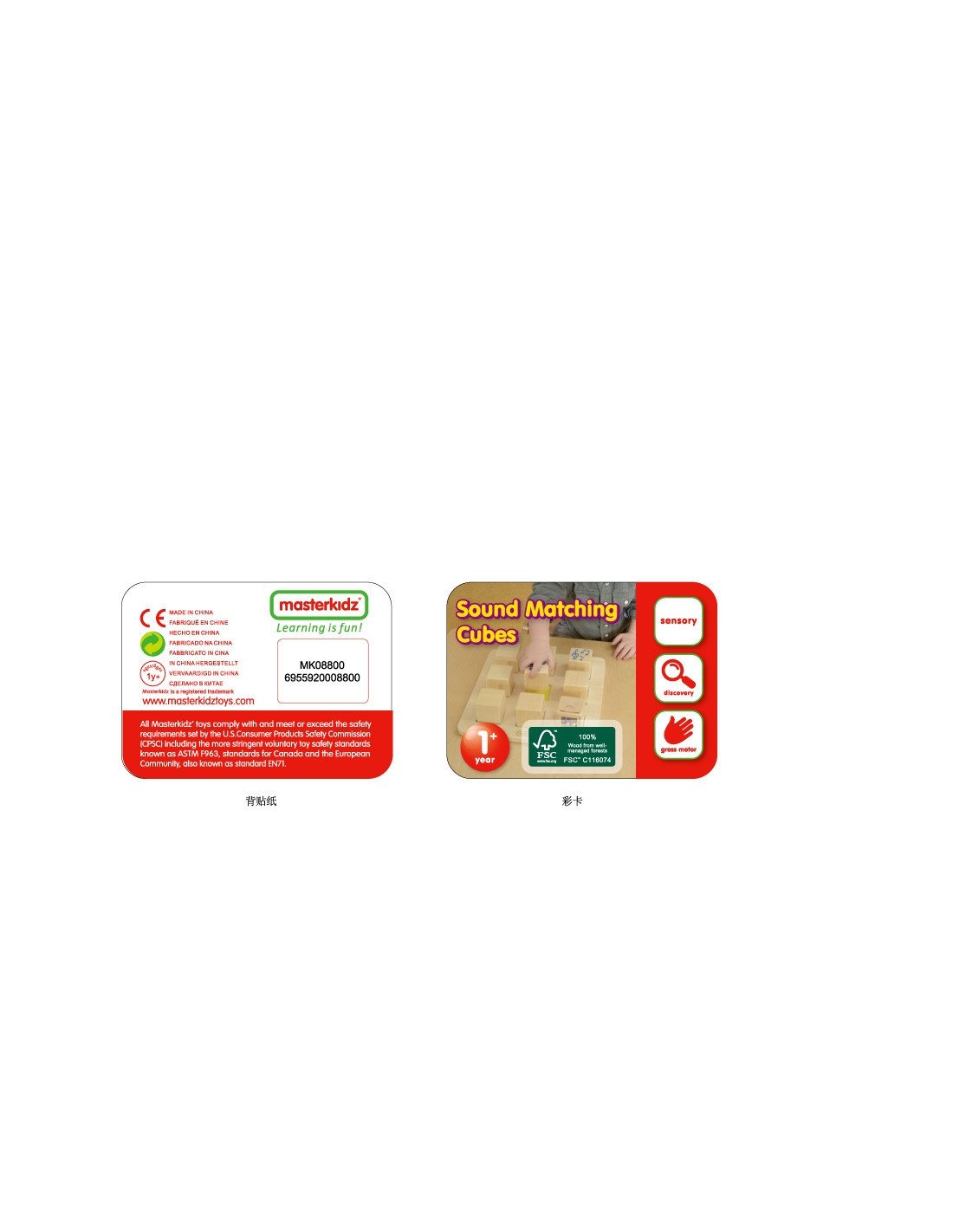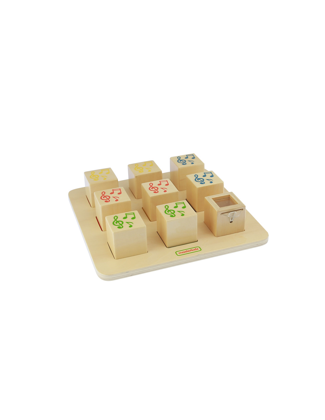 - - Zestaw składa się z planszy, oraz ośmiu drewnianych kostek, które wydają różne dźwięki podczas potrząsania. Zadaniem dziecka jest dopasowanie kostek w pary, sugerując się wydawanymi dźwiękami. Należy odnaleźć pary kostek, które wydają taki sam dźwięk.