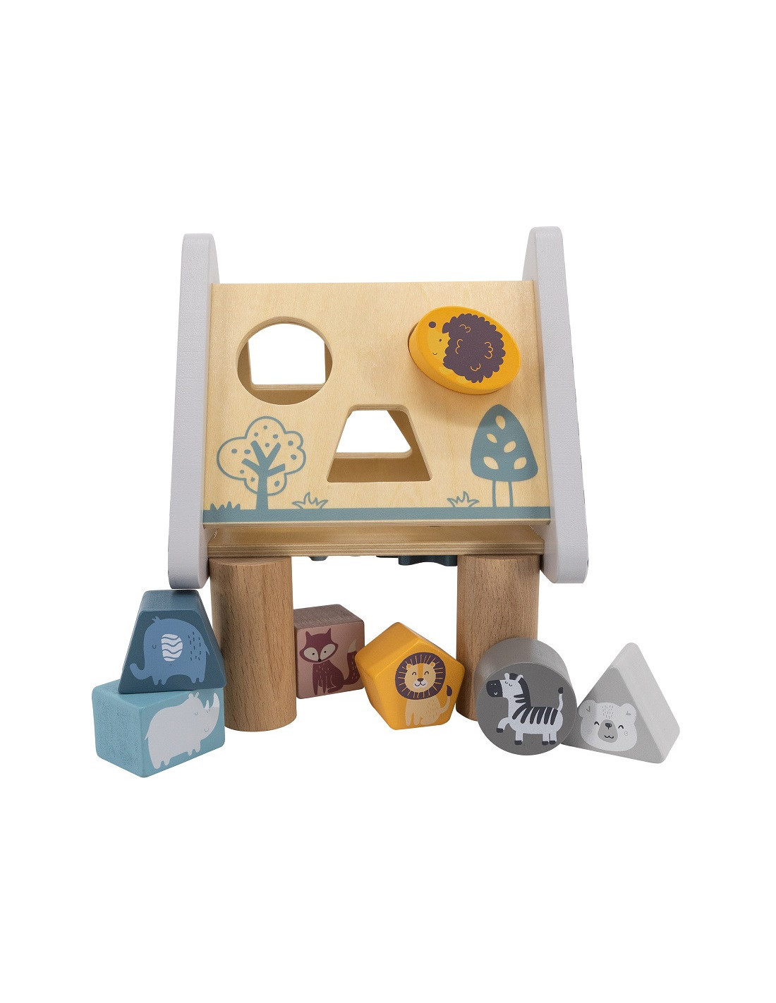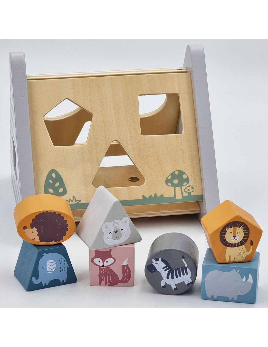 - - zadaniem dziecka jest dopasowywanie kształtów klocków, na których umieszczone zostały kolorowe postaci zwierząt i wciśnięcie w odpowiedni otwór, aby przeszły na drugą stronę pięciu drewnianych boków układanki w kształcie piramidki pokrytej rysunkami,