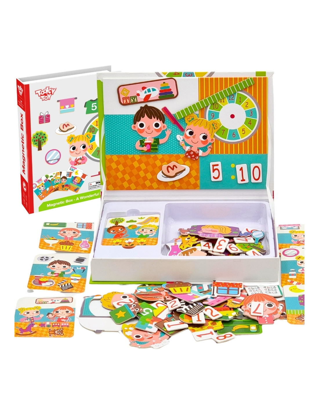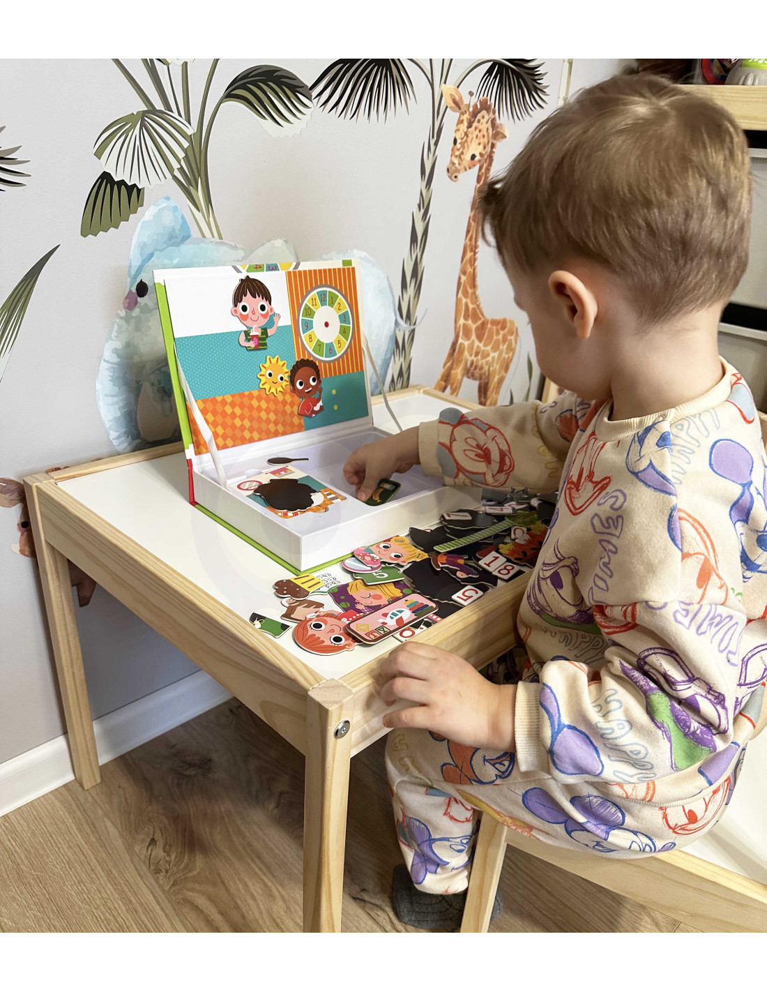 - - W magnetycznym pudełku za pomocą magnesów z różnymi obrazkami można utworzyć różne otoczenia np. łazienkę, kuchnię lub sypialnię