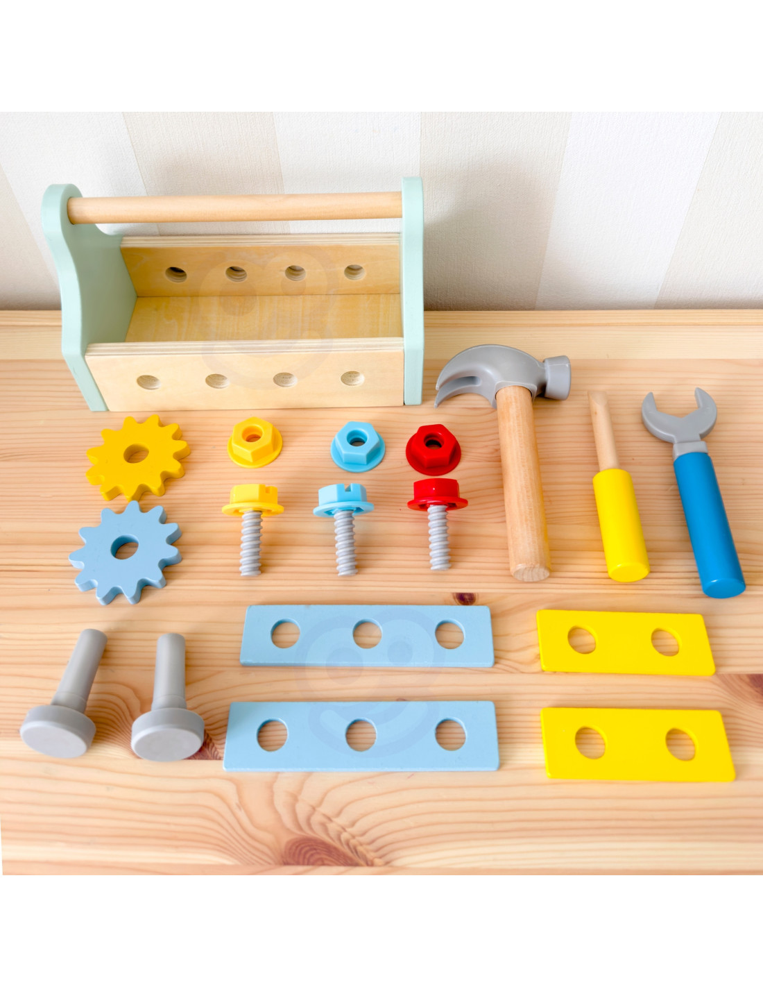 Ta urocza skrzynka narzędziowa marki Tooky Toy to idealny wybór dla małych majsterkowiczów, którzy uwielbiają bawić się w budowanie i naprawianie. Zestaw zawiera 18 elementów, w tym młotek, klucz, śrubokręt, śruby, nakrętki, gwoździe oraz części konstrukcyjne. Wszystkie elementy można łatwo przymocować do skrzynki za pomocą specjalnych otworów, co czyni zabawę jeszcze bardziej angażującą. Po zakończonej zabawie akcesoria można schować do skrzynki, co ułatwia ich przechowywanie i utrzymanie porządku.