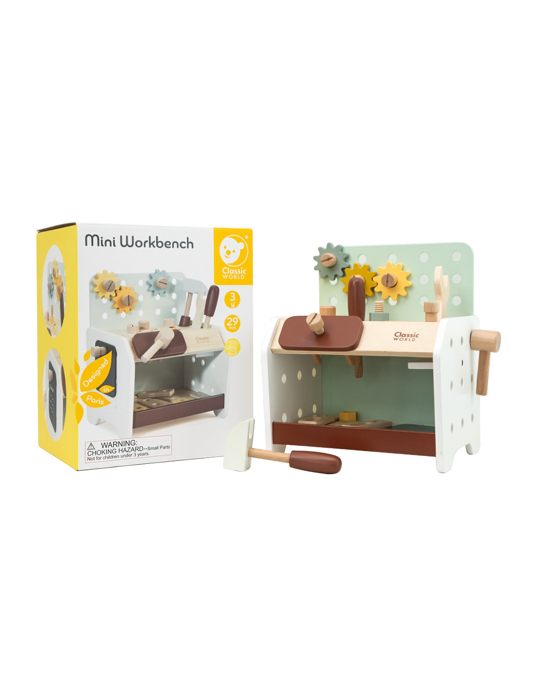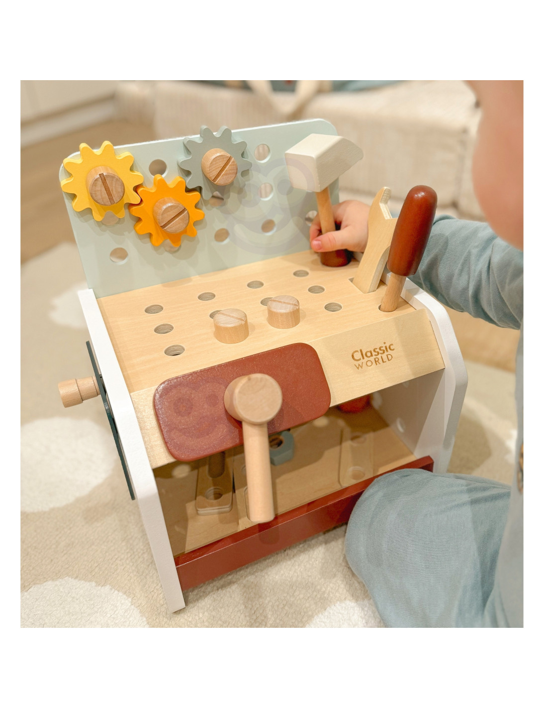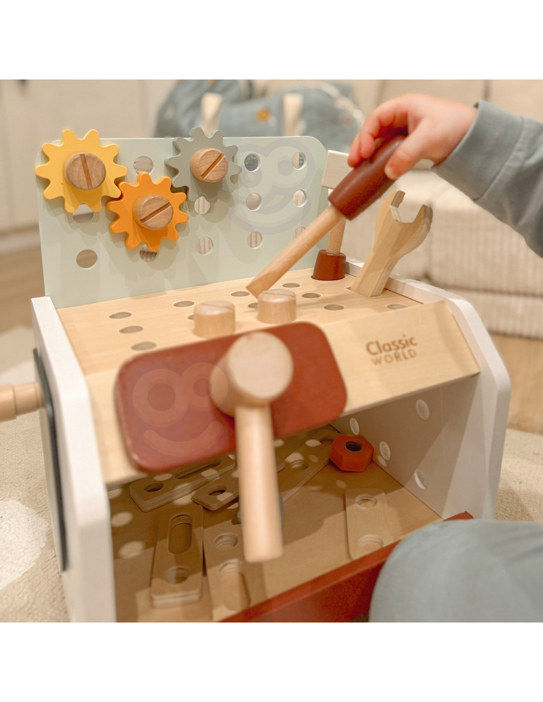 Drewniany stół warsztatowy od marki Classic World zapewni wspaniałą zabawę każdemu małemu majsterkowiczowi. Dzięki wielu narzędziom w zestawie, zabawa w majsterkowanie wspomoże rozwój zdolności manualnych, zaciekawi i rozpali dziecięcą wyobraźnię. Od teraz każdy maluch będzie miał okazje doskonalić swoją kreatywność gdyż zestaw zawiera wszystko co mu potrzebne do reperowania, wkręcania, wbijania gwoździ i wszelkich innych prac remontowych. Zestaw został wykonany z wysokiej jakości drewna, nie zawiera ostrych krawędzi, dzięki czemu jest bezpieczny dla dzieci i środowiska.