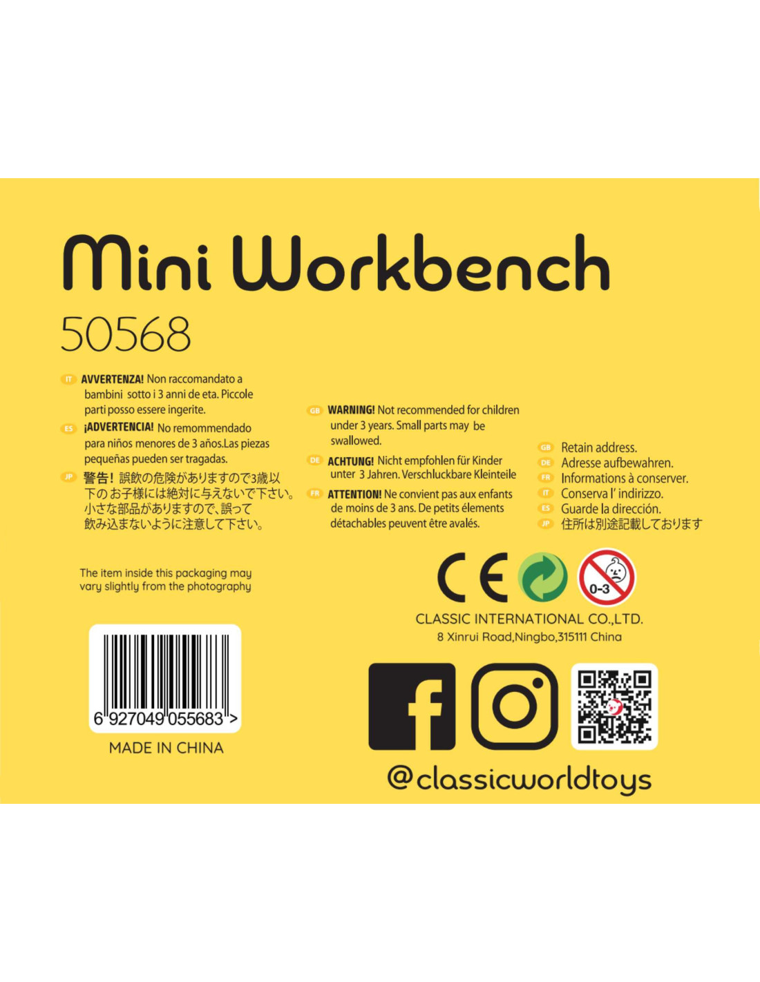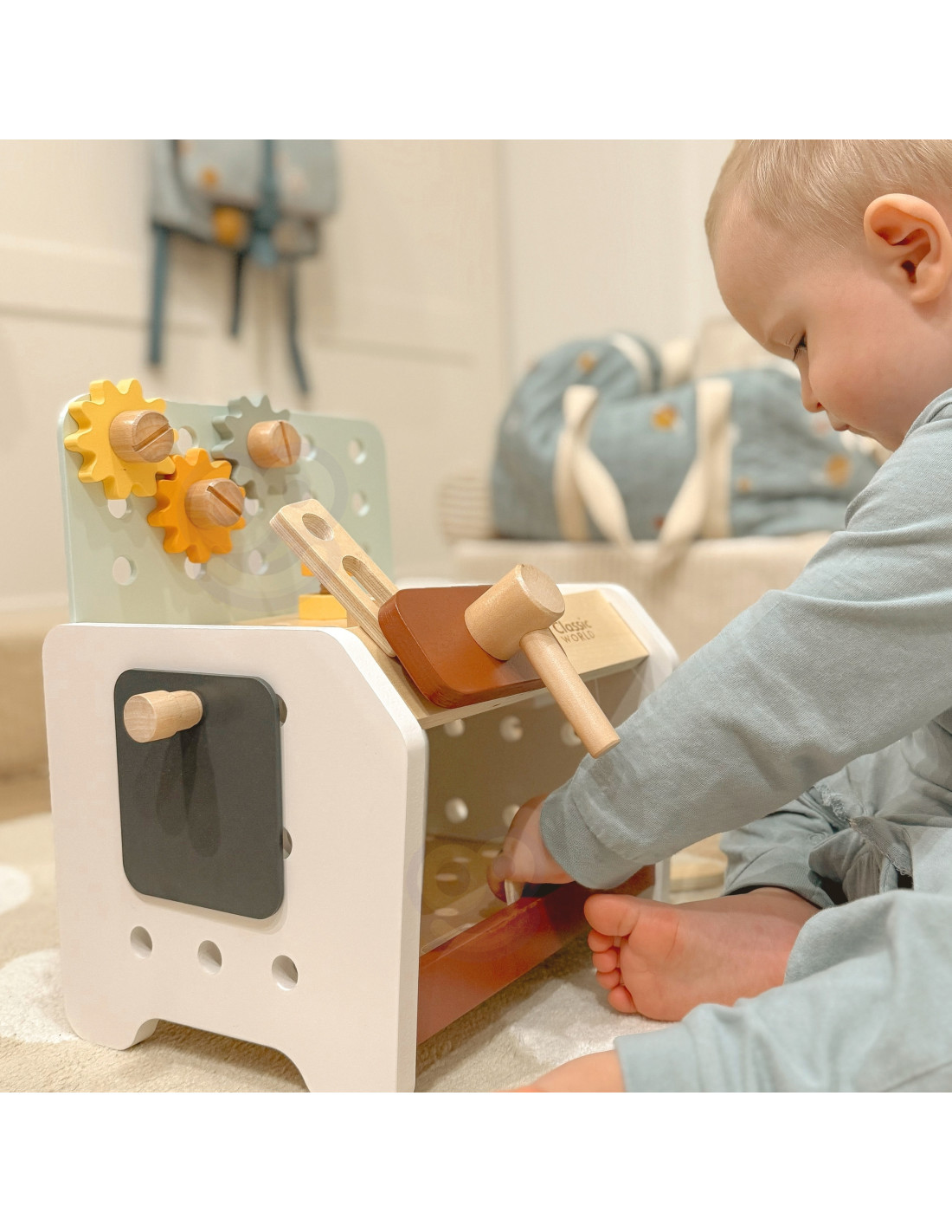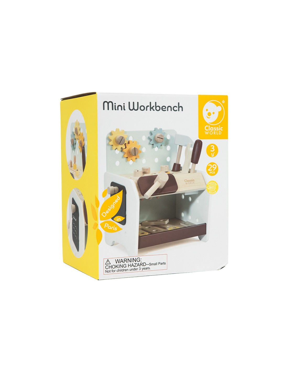 Drewniany stół warsztatowy od marki Classic World zapewni wspaniałą zabawę każdemu małemu majsterkowiczowi. Dzięki wielu narzędziom w zestawie, zabawa w majsterkowanie wspomoże rozwój zdolności manualnych, zaciekawi i rozpali dziecięcą wyobraźnię. Od teraz każdy maluch będzie miał okazje doskonalić swoją kreatywność gdyż zestaw zawiera wszystko co mu potrzebne do reperowania, wkręcania, wbijania gwoździ i wszelkich innych prac remontowych. Zestaw został wykonany z wysokiej jakości drewna, nie zawiera ostrych krawędzi, dzięki czemu jest bezpieczny dla dzieci i środowiska.