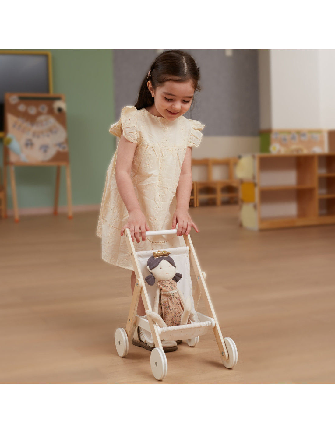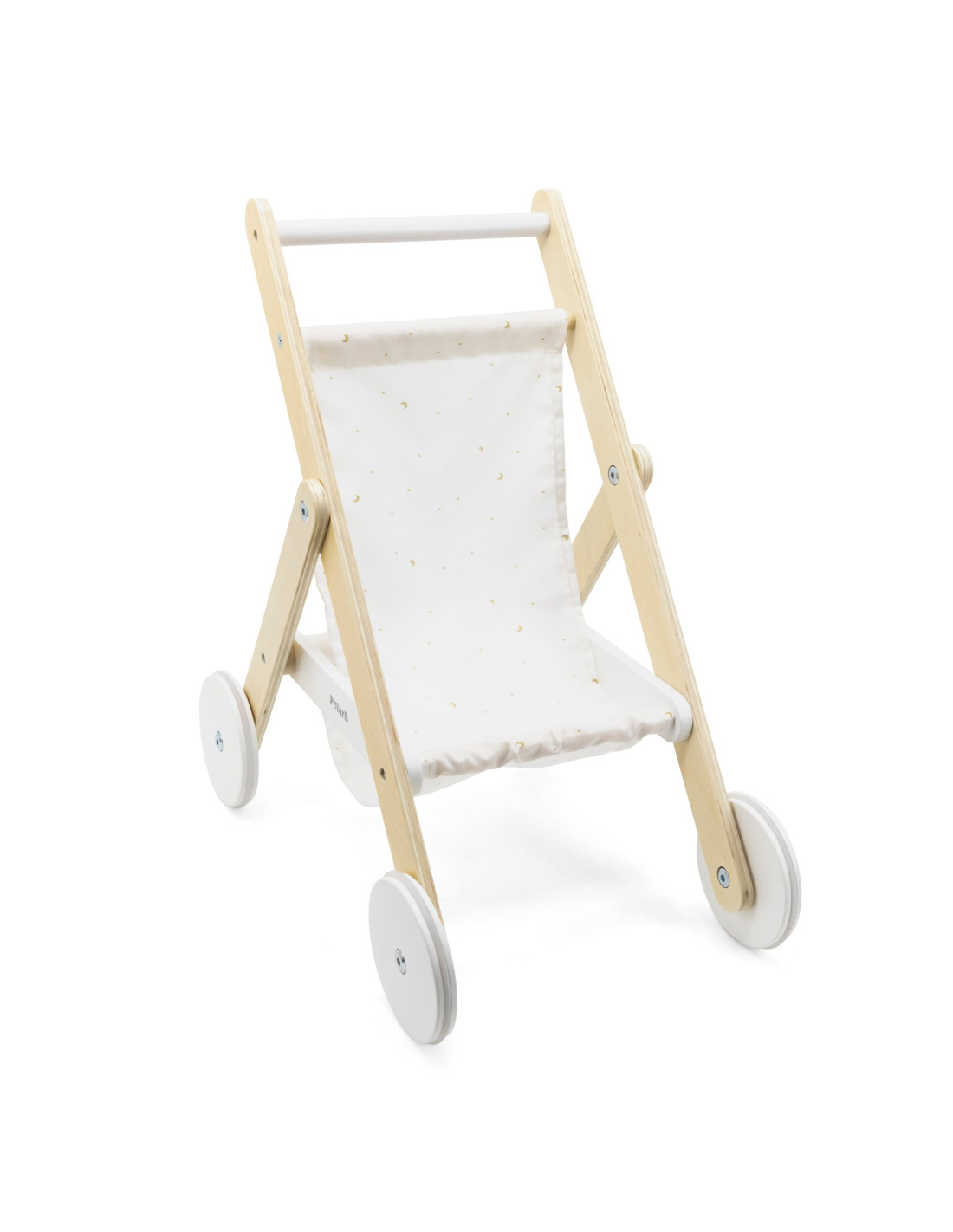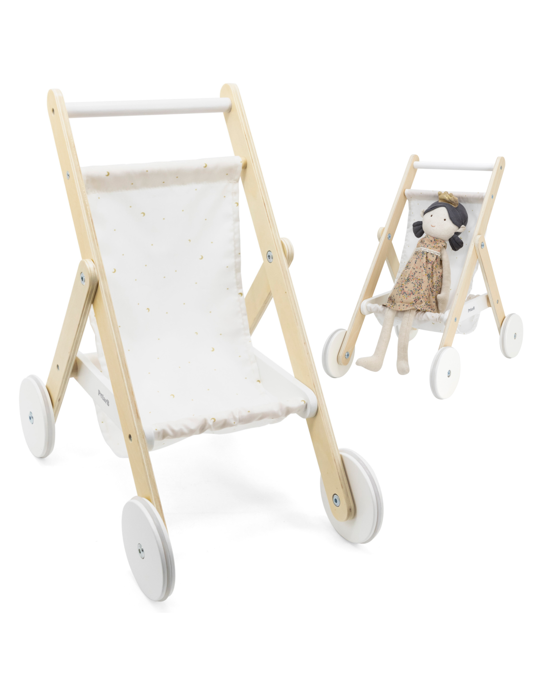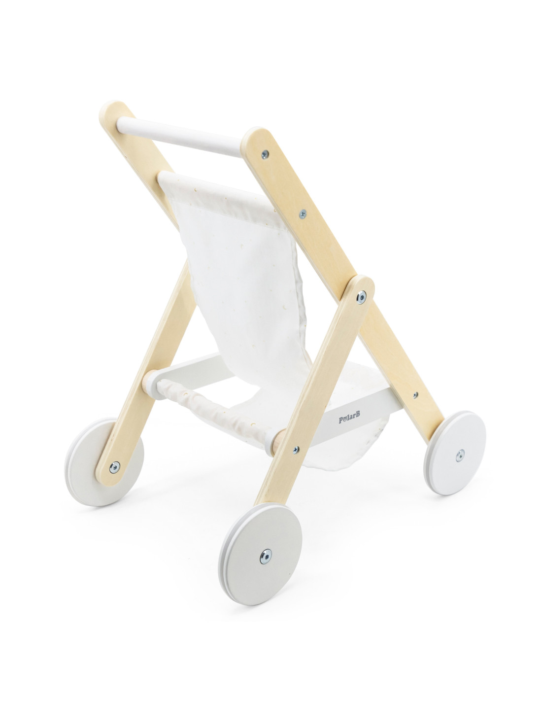Zabierz swoją ulubioną lalkę lub misia na spacer w drewnianym wózku z serii PolarB od marki VIGA. Wózek posiada solidną drewnianą ramę, materiał ozdobiony jest nadrukiem gwiazd i księżyca, pod spodem poręczny kosz do przechowywania akcesoriów. Guma na kołach została dodana dla dodatkowej ochrony i redukcji hałasu a także dla najmłodszych aby mogli chodzić stabilnie i pewnie. Pasuje do lalek o wysokości do 38 cm
