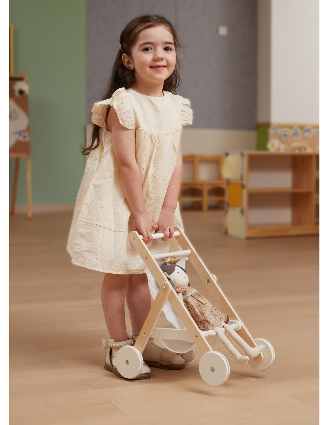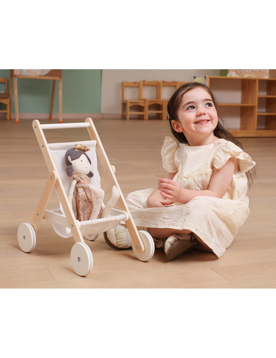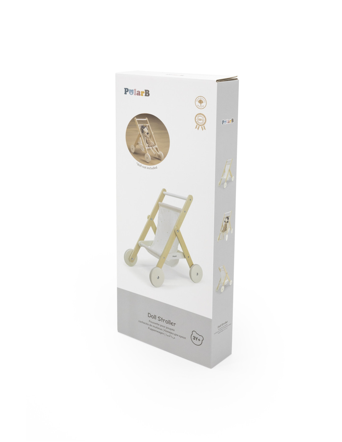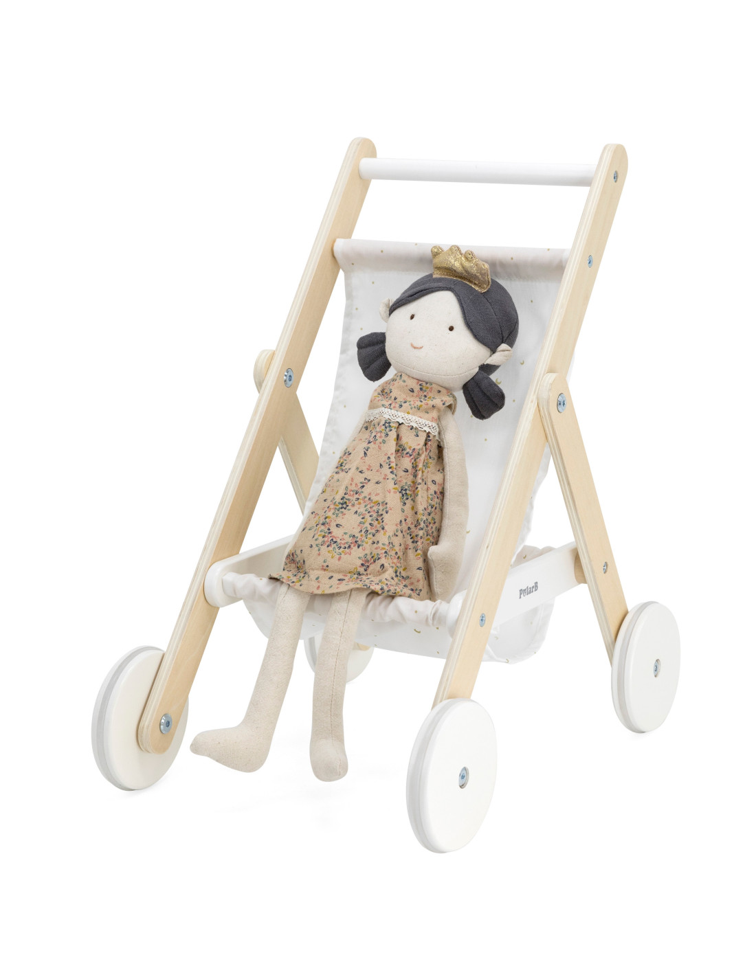 Zabierz swoją ulubioną lalkę lub misia na spacer w drewnianym wózku z serii PolarB od marki VIGA. Wózek posiada solidną drewnianą ramę, materiał ozdobiony jest nadrukiem gwiazd i księżyca, pod spodem poręczny kosz do przechowywania akcesoriów. Guma na kołach została dodana dla dodatkowej ochrony i redukcji hałasu a także dla najmłodszych aby mogli chodzić stabilnie i pewnie. Pasuje do lalek o wysokości do 38 cm