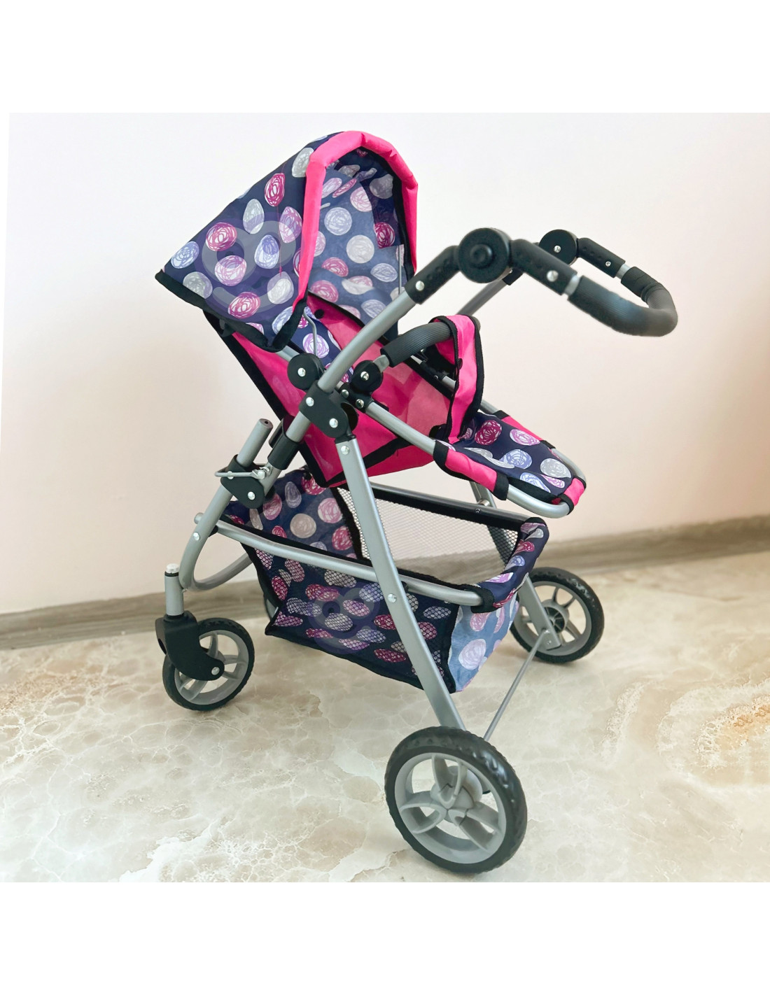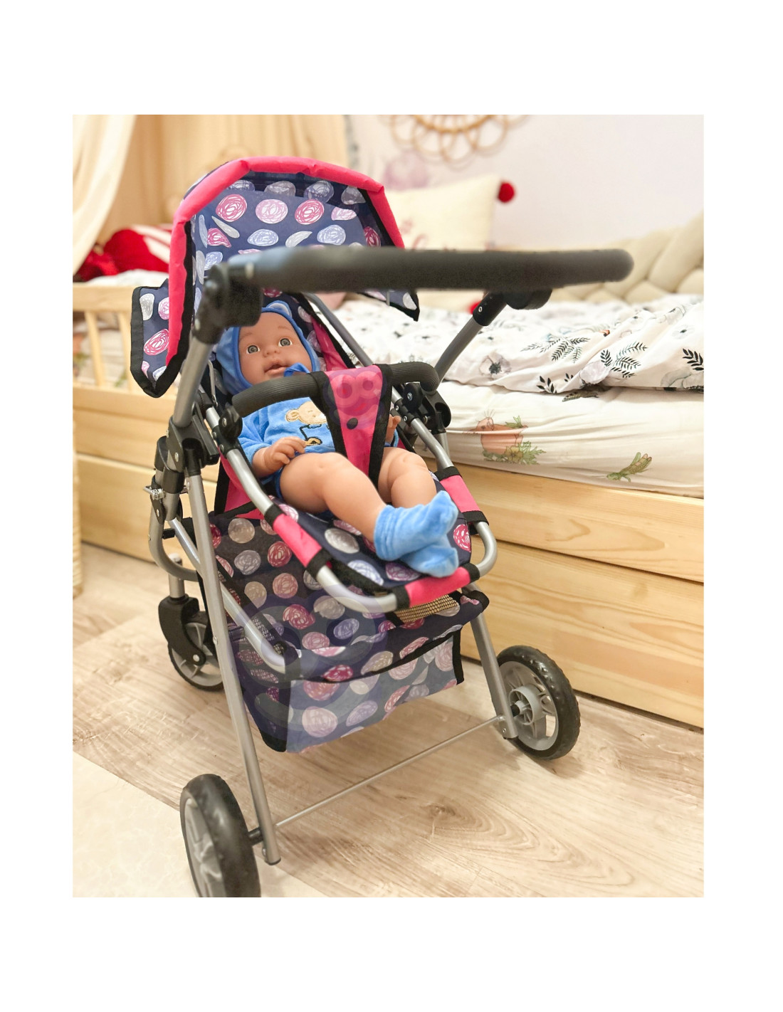 Stylowy i funkcjonalny wózek dla lalek od marki WOOPIE to wymarzony prezent każdej małej miłośniczki zabawy lalkami. Dzięki regulowanemu siedzisku można go łatwo dostosować do różnych potrzeb zabawy, umożliwiając przewożenie ulubionych lalek. Obracające się przednie koła gwarantują płynność prowadzenia, a solidna konstrukcja zapewnia stabilność podczas spacerów. Wózek wyposażono w miękką, wygodną rączkę i pojemny koszyk na akcesoria, który pomieści wszystkie drobiazgi niezbędne podczas zabawy. Składany daszek chroni lalki przed "słońcem", a kompaktowa konstrukcja sprawia, że wózek łatwo przechowywać, gdy zabawa dobiegnie końca.