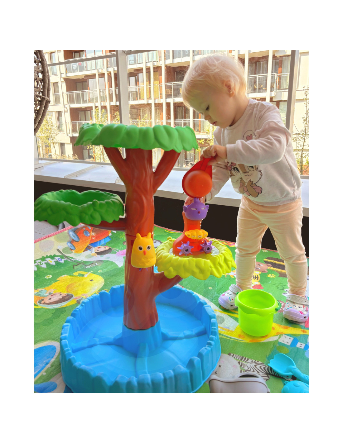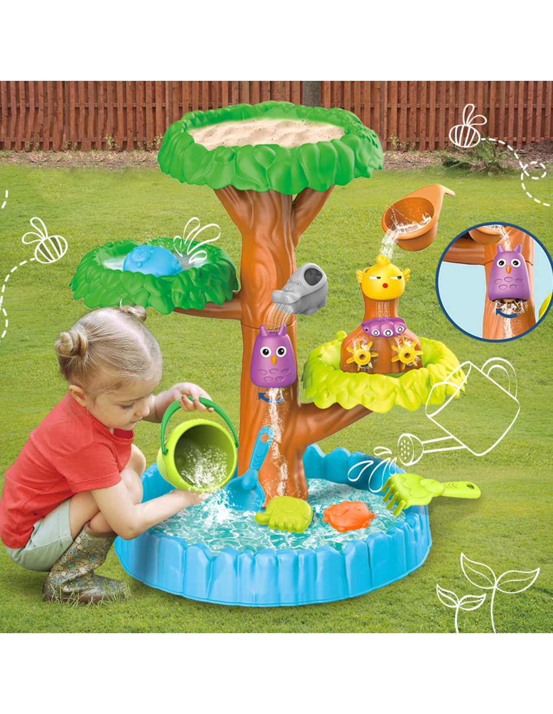 Stół Wodny 4-poziomowy w kształcie drzewa od marki WOOPIE jest idealny do zabawy z wodą i piaskiem. Zestaw zawiera wszystko, co potrzebne do niekończącej się zabawy - składany stół, wiaderko, nalewak, 3 foremki, 2 łopatki, konewkę. Twoje dziecko będzie mogło wlewać wodę do różnych zwierzątek, co spowoduje, że koła zębate zaczną się kręcić, dodając jeszcze więcej radości do i tak już wspaniałej zabawy. Zabawka jest przeznaczona do zabawy na zewnątrz: na plaży lub piaskownicy.