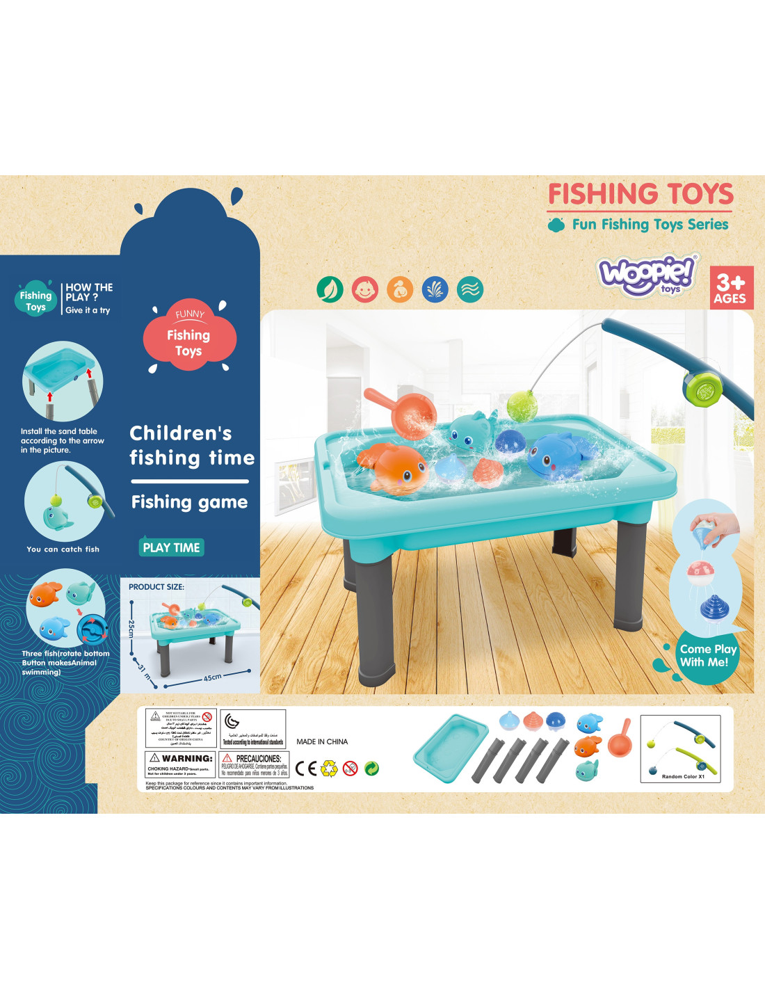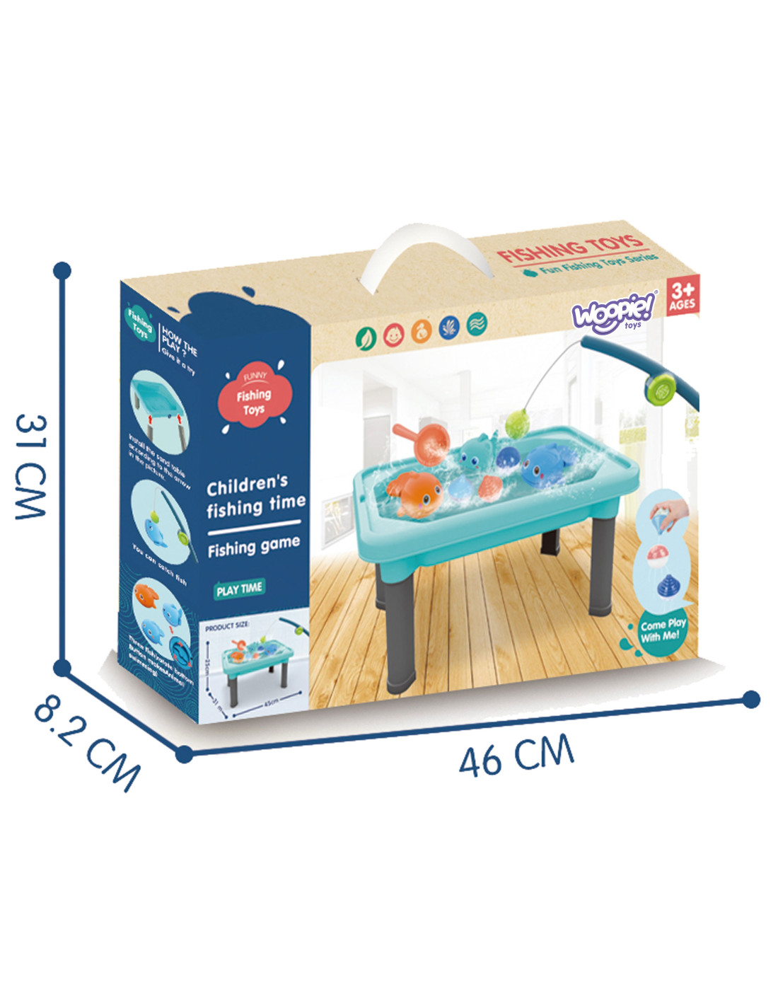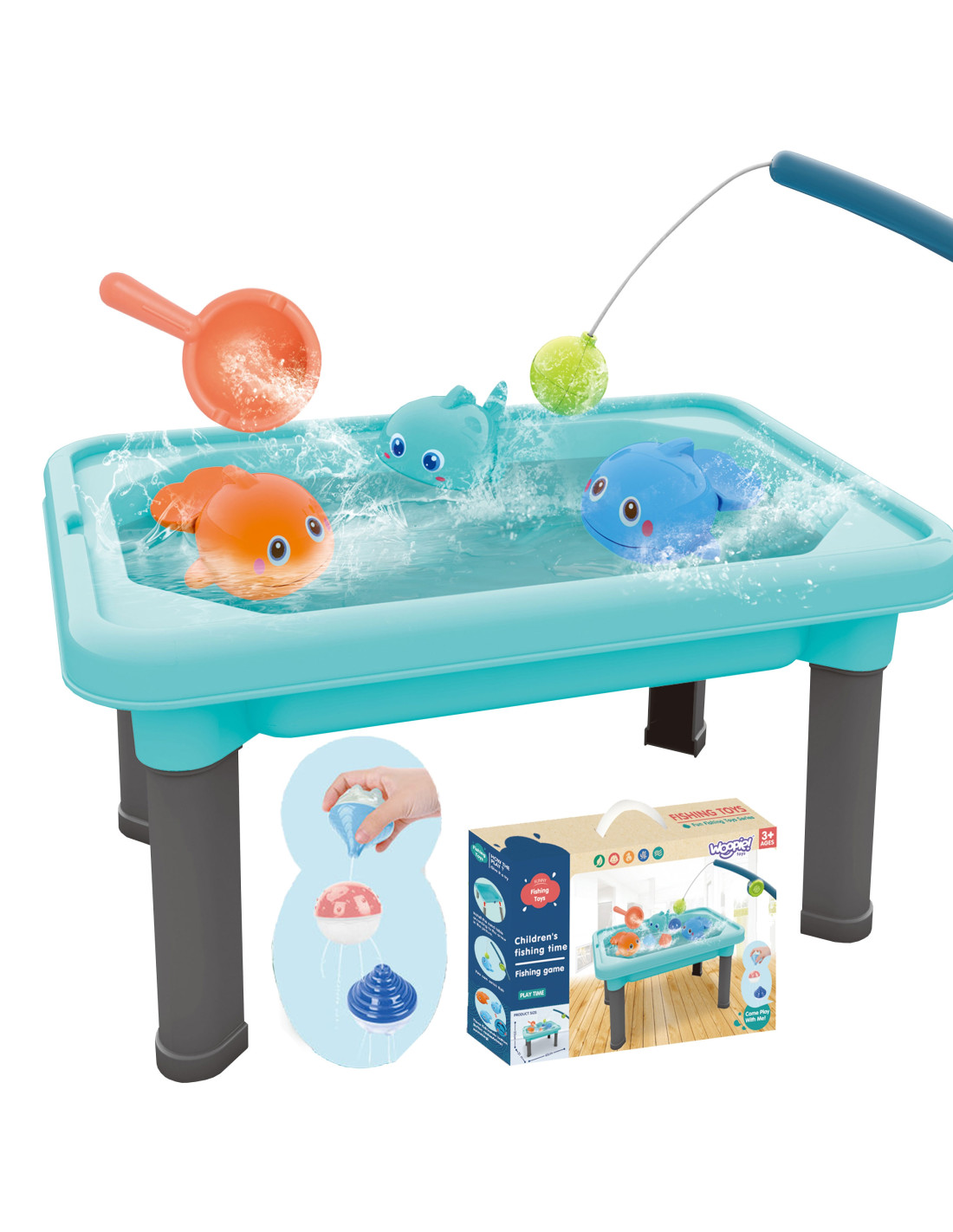 Stolik Wodny 3w1 Gra Łowienie Rybek Piaskownica od renomowanej marki WOOPIE to idealny produkt dla naszych najmłodszych pociech. Napełnij zbiornik wodą i pozwól dzieciom cieszyć się ze świetnej zabawy w wodzie. Stolik może być wykorzystany również jako piaskownica. Zestaw zawiera 6 elementów, w tym stolik wodny, wędkę, łyżkę do wody, 3 piłeczki przelewowe i 3 rybki. Rybki posiadają magnesy) oraz dodatkowo można je nakręcić, aby pływały po wodzie. Zestaw jest świetnym produktem do zabawy w domu, jak i na zewnątrz. Twoje dziecko będzie zachwycone w zabawę w łowienie rybek.