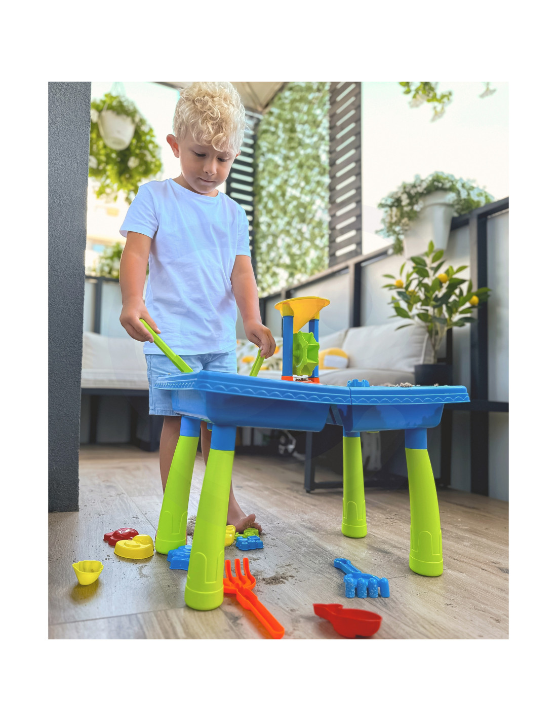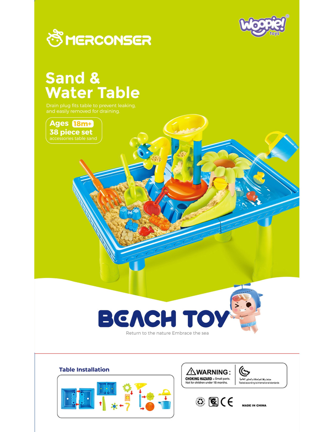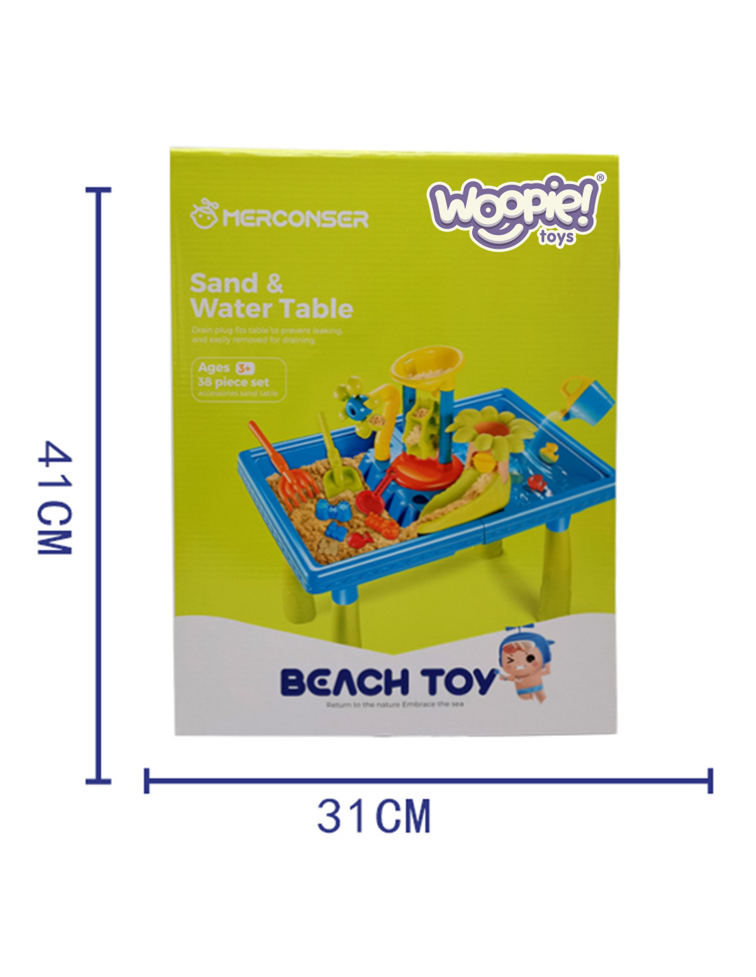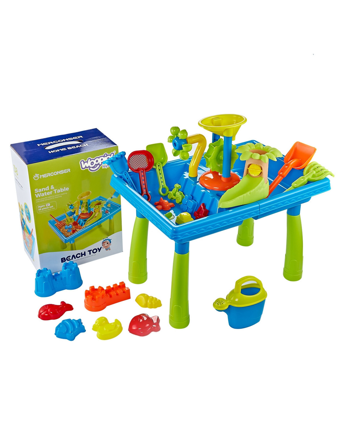 Stół Wodny 2w1 Piaskownica od marki WOOPIE jest idealna do zabawy z wodą i piaskiem. Zestaw zawiera 18 akcesoriów: foremki, konewkę, młynek, łopatki, sitko i wiele więcej. Stolik posiada 2 wgłębienia, jedno wypełnij wodą, a drugie piaskiem. Dziecko może wlewać wodę do młynka i obserwować jak woda wpędza w ruch wirnik. Idealne do zabawy w domu i na plaży lub piaskownicy.