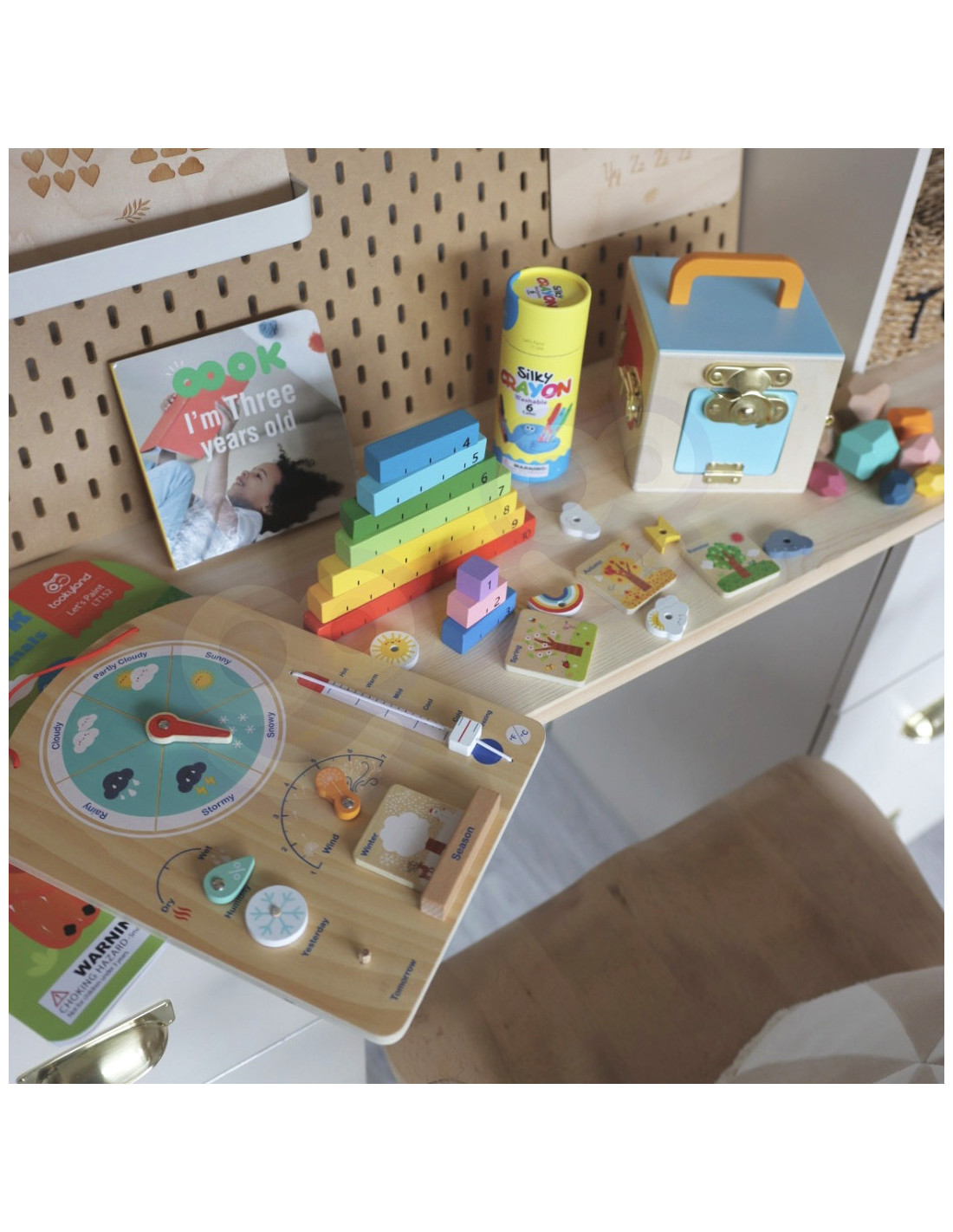 Pudełko edukacyjne firmy Tooky Toy przeznaczone jest dla maluszków w wieku od 3 lat. Zawiera 6 zabawek sensorycznych i dydaktycznych montessori, które wspierają zdrowy rozwój psychomotoryczny Twojego dziecka oraz stymulują jego zmysły: wzrok, dotyk i słuch. Rozwija również logiczne myślenie i koordynację ręka-oko. Jest też szczegółowy poradnik dla rodziców, dzięki któremu dowiesz się, kiedy wprowadzić zabawkę do zabawy swojego maluszka i jak się nią bawić. Pudełko edukacyjne Tooky Toy nadaje się na prezent dla maluszka.