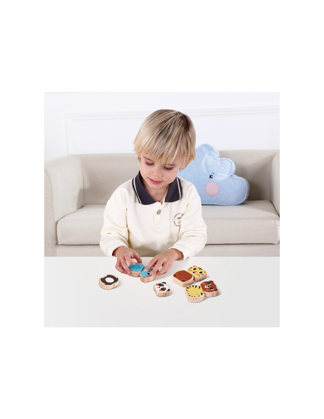 To zestaw drewnianych puzzli z magnesami, które przedstawiają różne zwierzęta: niedźwiedzia, tygrysa, słonia i pandę. Układanki są wykonane z dużych klocków, które są na tyle duże, że nie można ich połknąć, a jednocześnie łatwo je chwycić. Krawędzie są delikatnie polerowane i zaokrąglone, dzięki czemu nie zranią małych rączek dzieci. Magnesy są osadzone, więc nie ma obawy, że się odkleją podczas układania, a zabawa jest jeszcze bardziej interesująca. Każde zwierzę jest równo podzielone na dwie części, a dzieci muszą użyć swoich zręcznych rąk, aby przywrócić je do ich pierwotnych kształtów! Poprzez układanie ich parami (jedna głowa i jedno ciało) dzieci rozwijają zdolności motoryczne i wyobraźnię, poprawiają umiejętności manualne oraz koordynację wzrokowo-ruchową.