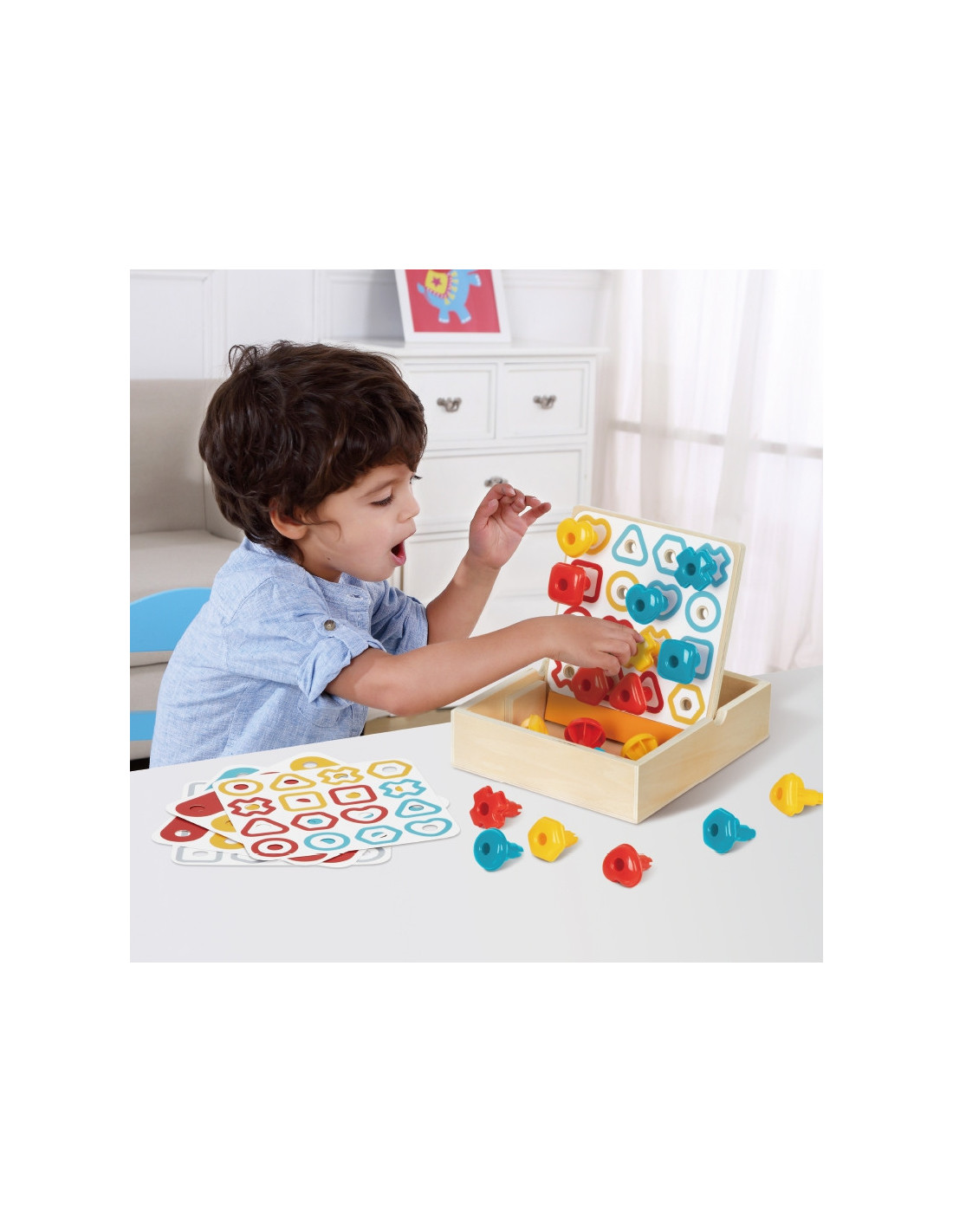 Zaprojektowany specjalnie dla dzieci w fazie odkrywczej, jest bogaty w różnorodne sposoby zabawy. W boxie znajdują się łatwe do uchwycenia przez małe rączki przedszkolaków śrubki, a ścięcia są gładkie i delikatne, co pozwala dzieciom na spokojną zabawę. Śrubki mają różnorodne geometryczne kształty, bogatą kolorystykę i różnorodną zawartość kart do gry. To wspaniały zestaw wielofunkcyjnych zabawek edukacyjnych, dzięki którym dziecko może nauczyć się rozpoznawania kształtów, rozpoznawania kolorów. Ponad to zabawie towarzyszy trening małej motoryki i skupienia. Zabawka może pomóc małym dzieciom rozwijać koordynację ręka-oko oraz rozwijać logiczne myślenie i wyobraźnię mózgu. Drewniane pudełko z funkcją gry jest jednocześnie pudełkiem do przechowywania, można trzymać w nim wszystkie części bez obawy, że je zgubisz.