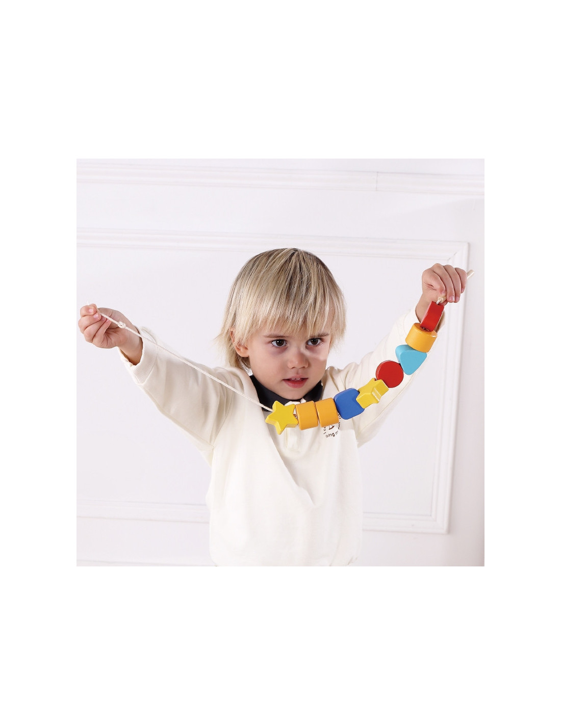 Zestaw obejmuje 1 torbę na przechowywanie, 11 klocków w różnych kształtach i 1 sznureczek do nawlekania. Nawlekanka to klasyczny zestaw drewnianych klocków z dziurkami, przez które dziecko przeplata sznureczek. Jest to świetna zabawa, która pobudza obszary w mózgu i rozwija zdolności manualne- małą motorykę, zręczność palców i koordynację ręka-oko. Zestaw jest zaprojektowany tak, aby dzieci mogły rozpoznawać kształty i kolory.
