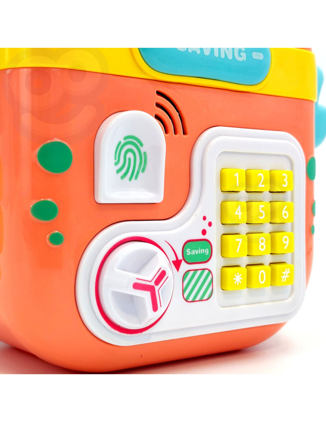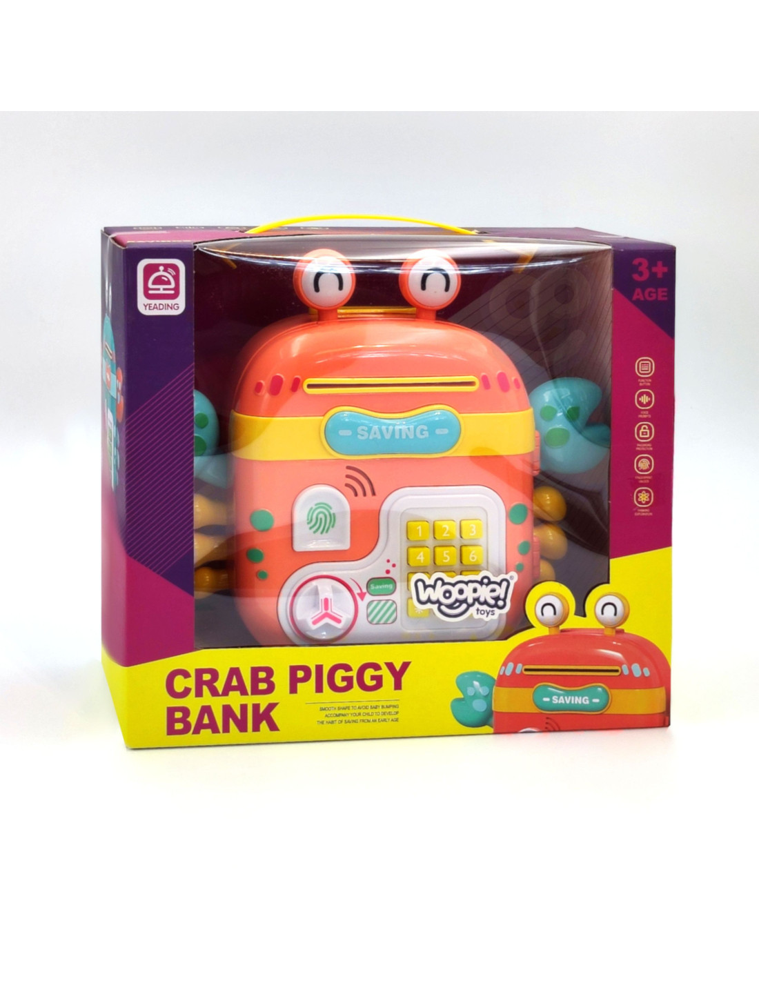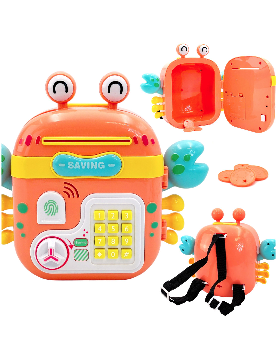 Elektroniczna Skarbonka na Hasło od marki WOOPIE to wielofunkcyjny produkt, który na pewno spodoba się twojemu dziecku! Krab zaprojektowany jest w taki sposób aby można było przechowywać w nim monety, banknoty i inne mniejsze zabawki. Skarbonka składa się ze specjalnych otworów na banknot i monetę, czytnika linii papilarnych, klawiatury do wpisywania hasła oraz pokrętła do otwierania. Ponad to Elektroniczny krab wydaje z siebie dźwięki! W razie potrzeby zabawkę można łatwo zresetować i ustawić nowe hasło