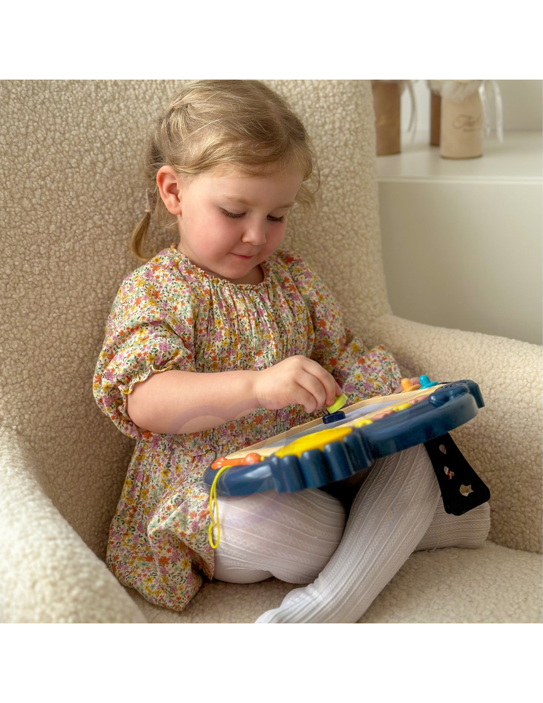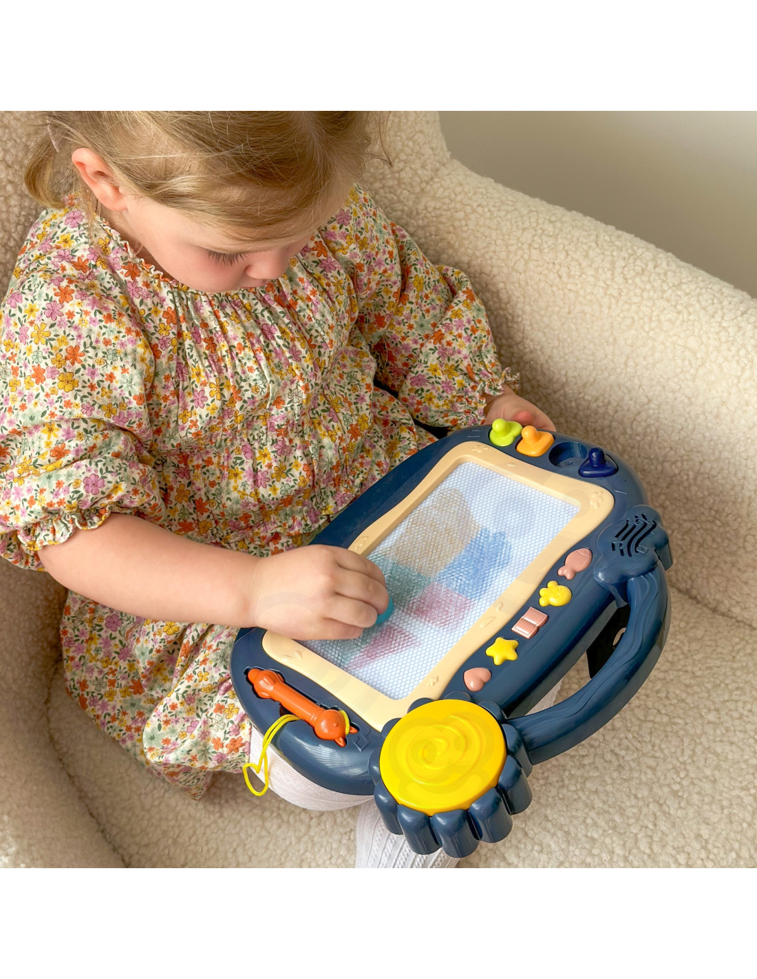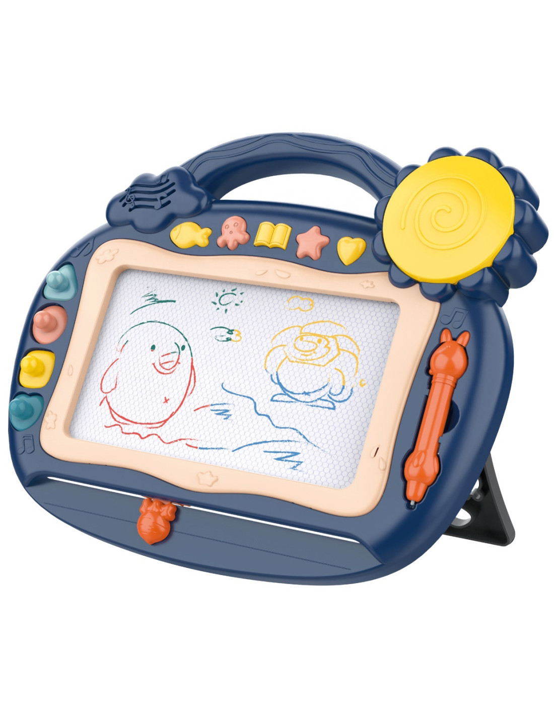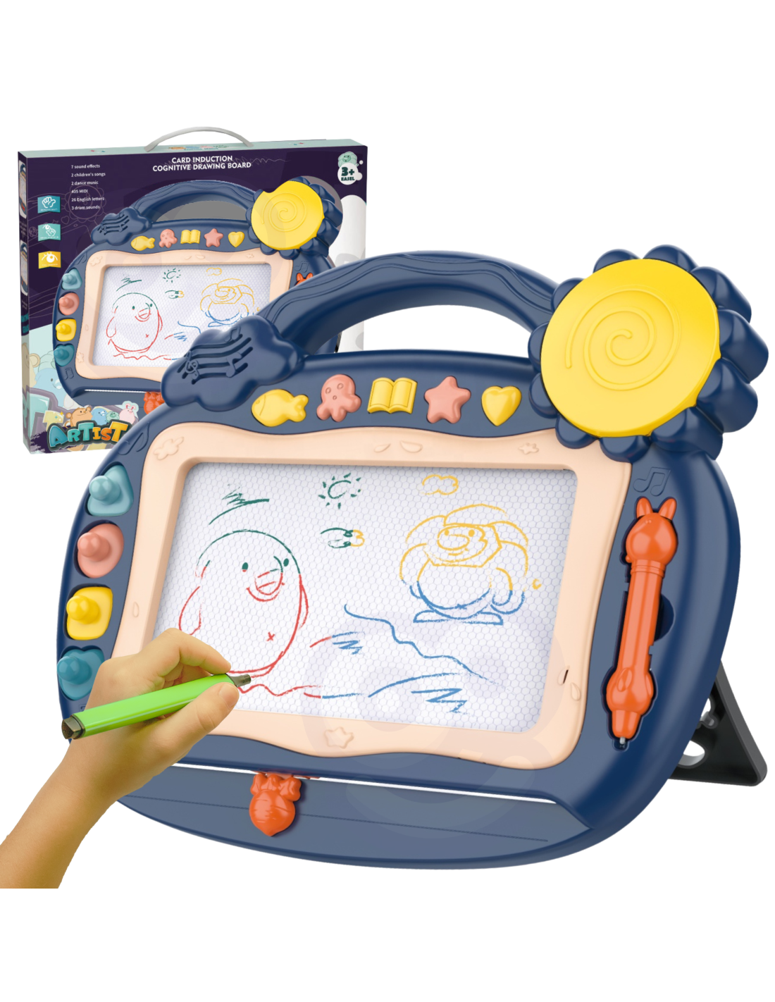 Znikopis Tablica Magnetyczna daje możliwość kreatywnej zabawy na długi czas! Tablica zachęca do pisania i rysowania. Rysowanie pozwoli wyciszyć i uspokoić się Twojemu dziecku. Znikopis pozwala na tworzenie nieskończonej ilość obrazków – wystarczy przejechać specjalnym suwakiem, a rysunek zniknie i można rysować od nowa! Zestaw dodatkowo zawiera wygodny długopis oraz aż 4 stempelki, które urozmaicą dzieło. Dodatkowo 5 multi funkcyjnych guzików, które mają ponad 400 opcji dźwiękowych, w tym: efekty dźwiękowe, taneczne piosenki dla dzieci, elektroniczne dźwięki, alfabet angielski oraz bęben. Tablica posiada wygodny uchwyt, dzięki czemu dziecko może zabrać ją wszędzie oraz posiada możliwość wystawienia nóżek, które ułatwia dziecku pisanie przy stole. Znikopis rozwinie u dziecka zdolności manualne, wyobraźnie, kreatywność oraz da szansę na rozwinięcie artystycznej strony dziecka!